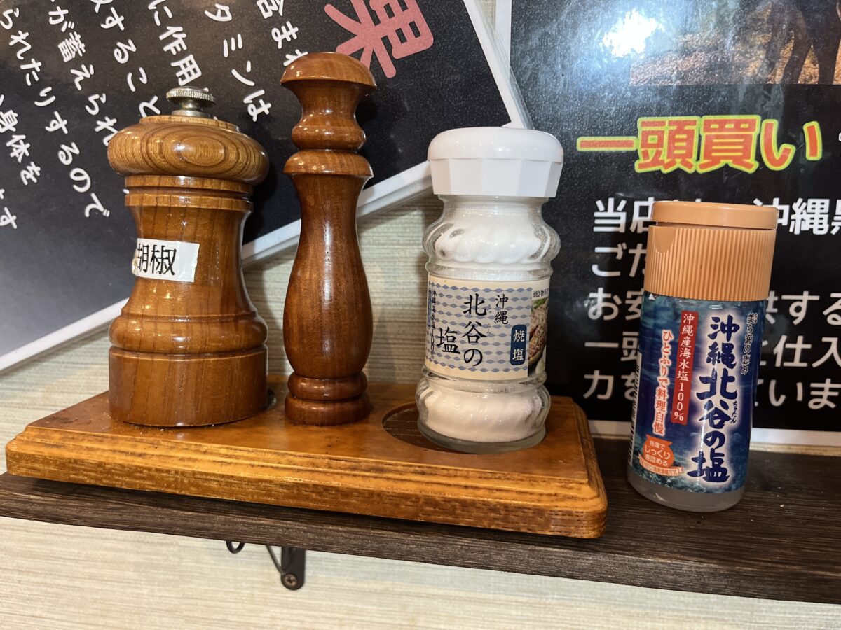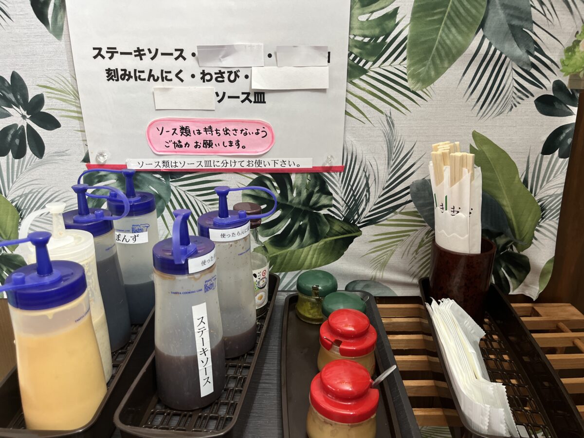 各テーブルに、塩、胡椒があります。そして、セルフコーナーにはステーキソース、刻みにんにく、わさびもあります。