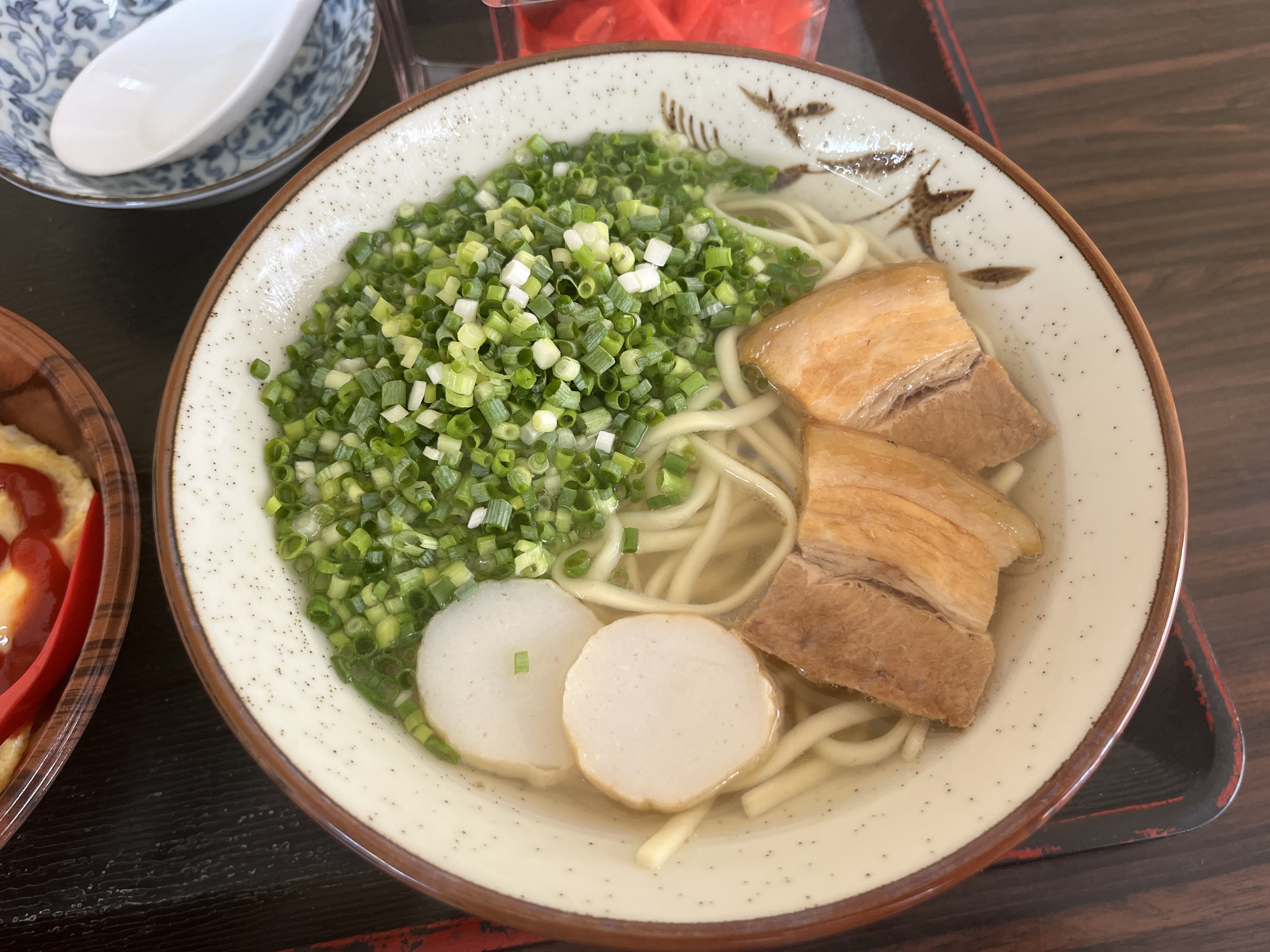 ごくごく飲めるあっさりスープと、喉越しが良い細麺が相性良くて、一気に完食しちゃいました。ミニオムライスも頼んだので、沖縄そばは、小(150g)にしたのですが、中(200g)でも良かったかもなぁ。そして三枚肉も好みの味でした。ちょい甘めの味付け。食感もちょい柔らかめで好きなヤツ。
