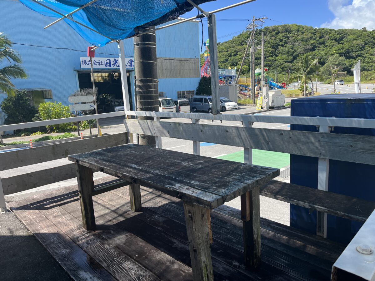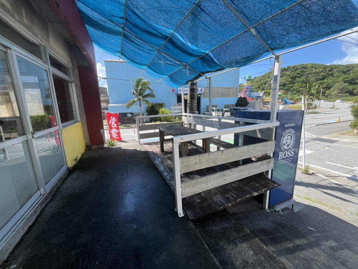 入口前には、ビニールシートの屋根と木のベンチがあります。海の家っぽい。