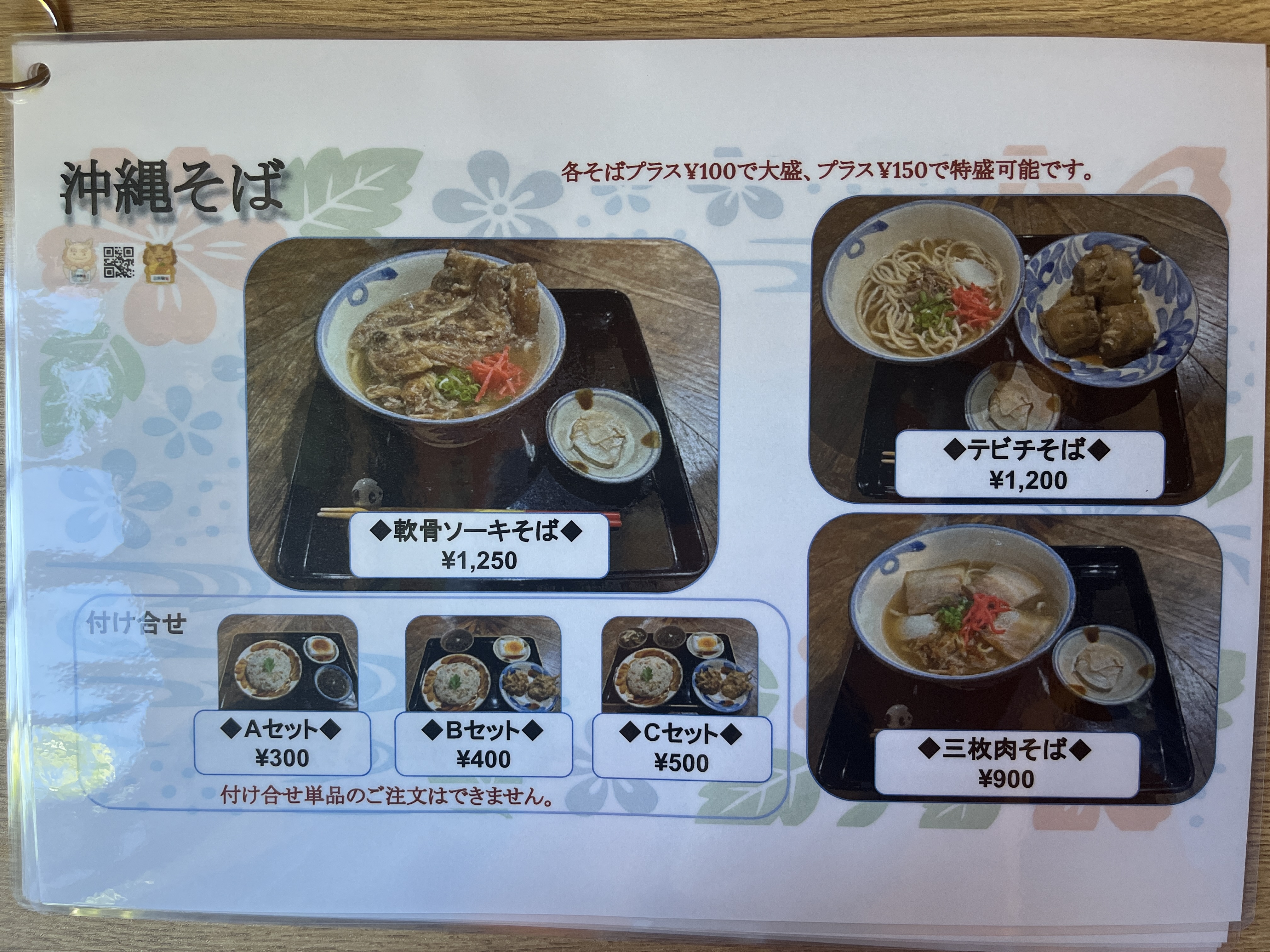 軟骨ソーキそば、テビチそば、三枚肉そば、同じく、A,B,Cセットが選択可能です。
