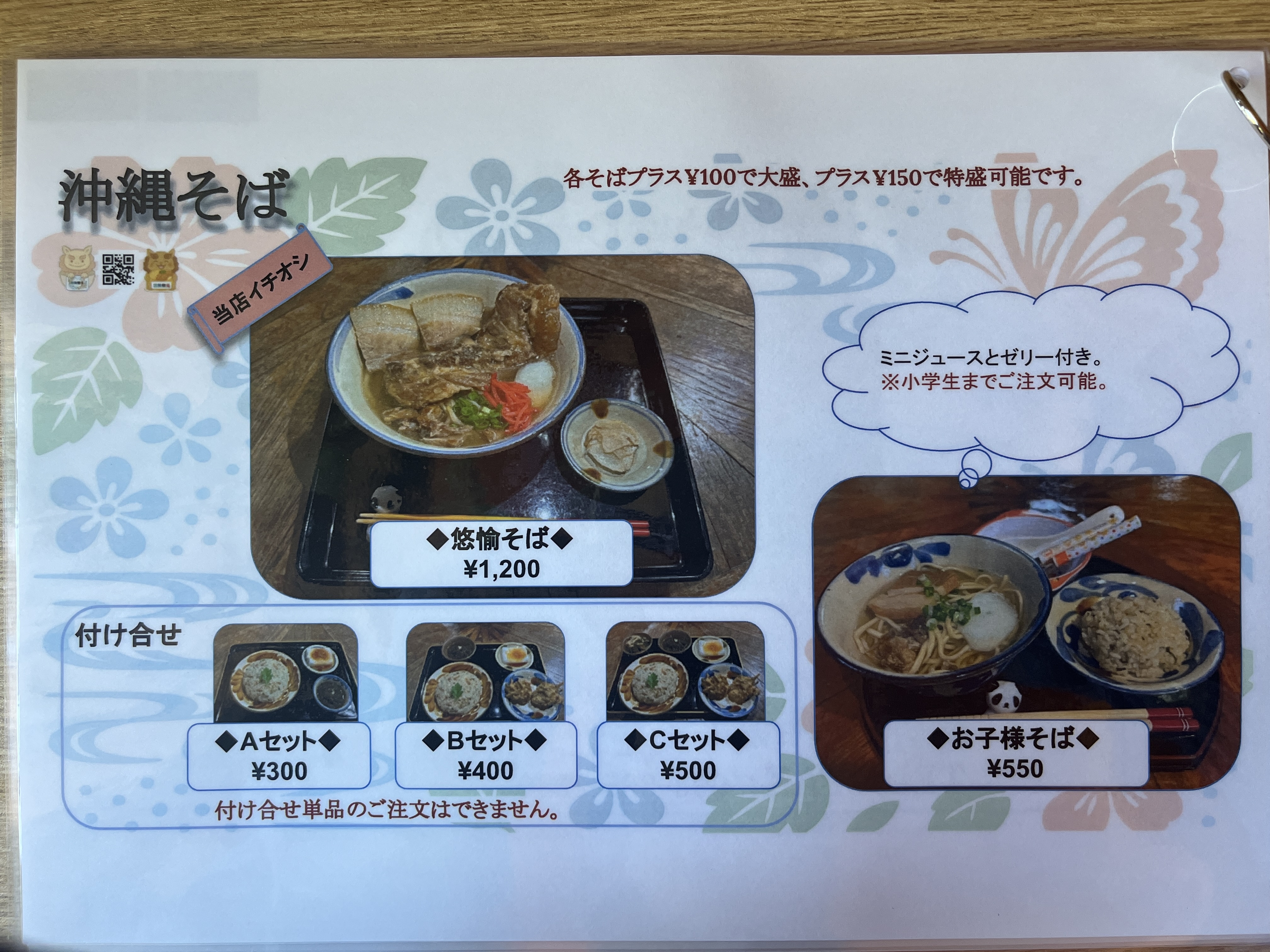 イチオシの悠愉そばには、三枚肉とソーキが載ってます。そして、Aセット、Bセット、Cセットが選択可能。