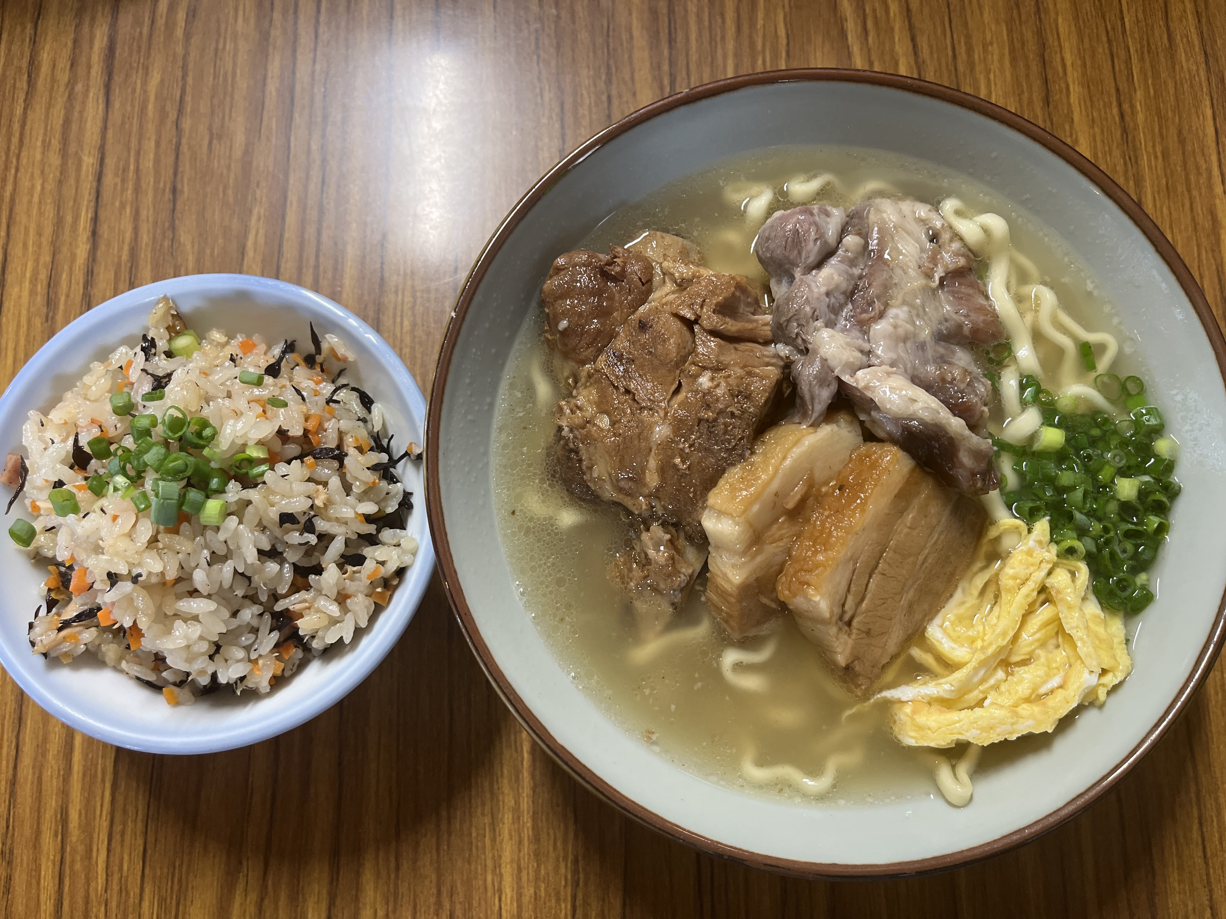 肉全載せの咲樹そばをチョイス!まずは、軟骨ソーキ。コレは塩軟骨ですね。柔らかくて食べやすい。普通に美味しい。次に本ソーキ。これは甘い味付けで、更に炙られてる!コレは美味しい!柔らかくて骨離れも良く食べやすい。私は軟骨ソーキ派ですが、こちらは本ソーキがオススメですね。最後に三枚肉ですが、こちらも甘い味付けで柔らかい。好きなタイプ。甘党の人は、本ソーキ or 三枚肉がオススメ。NO甘党の人は、(塩)軟骨ソーキがオススメですね。