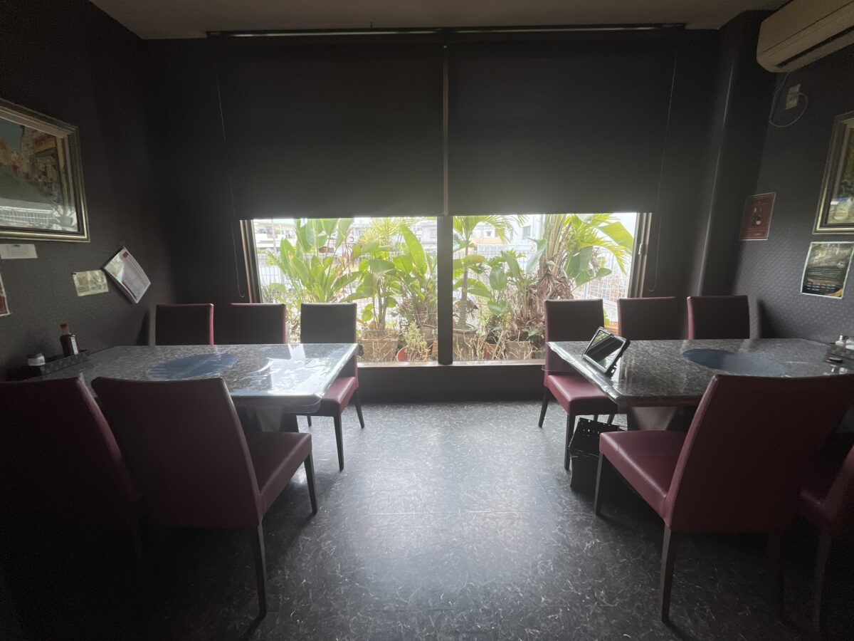 しかし、奥の窓際テーブルだけは、なぜか、鉄板焼屋みたいなシックな感じ。VIPルーム?