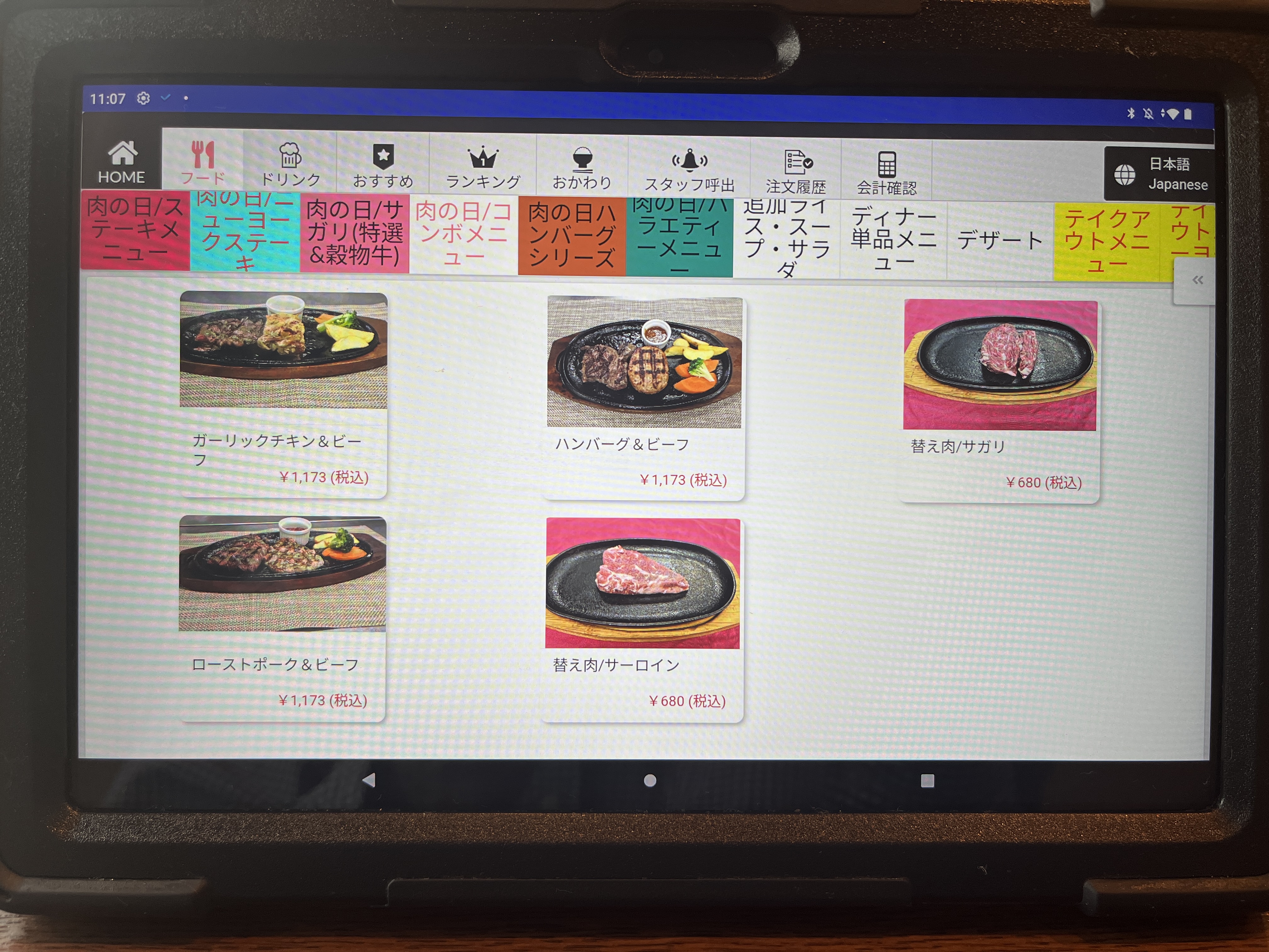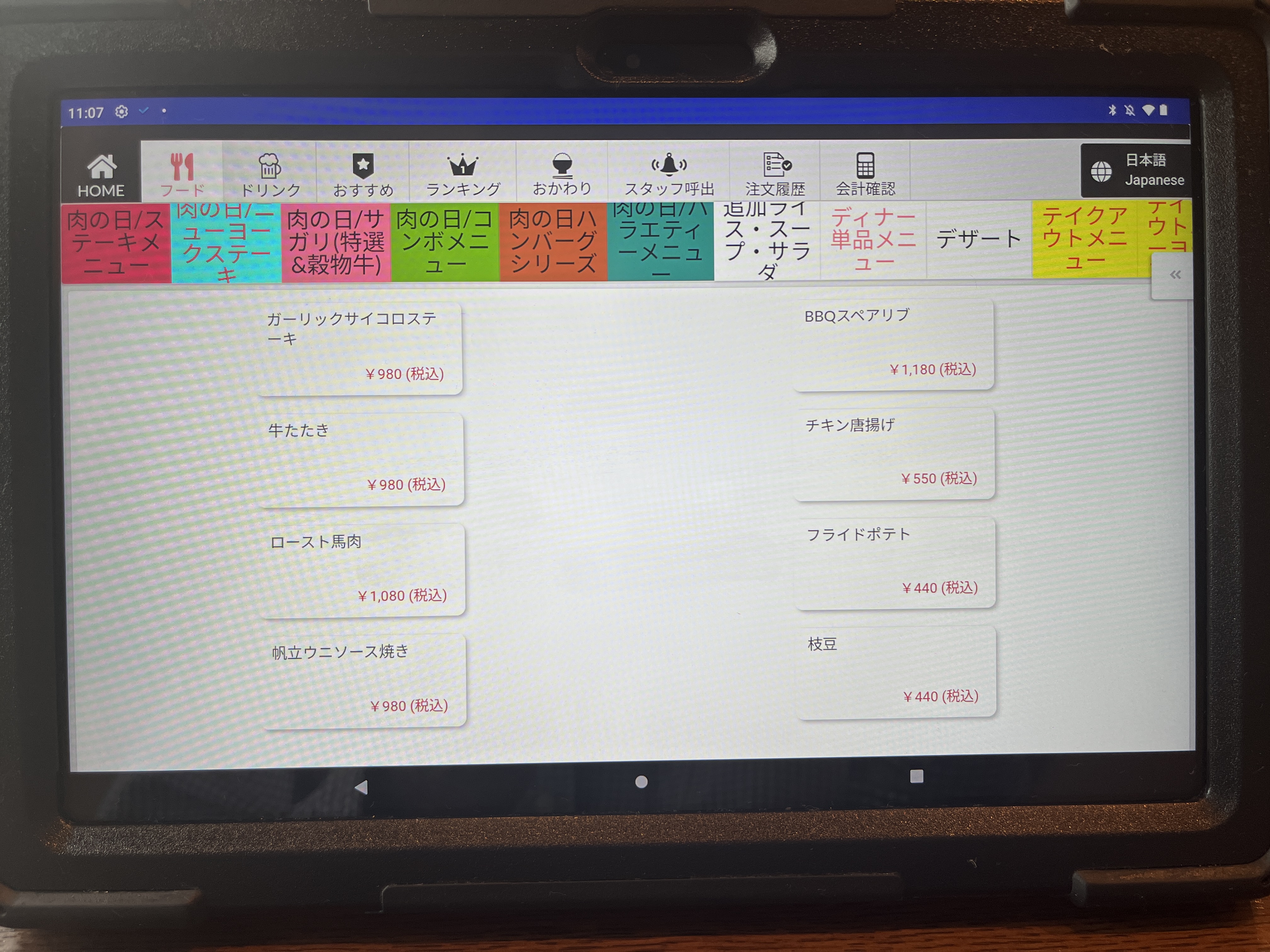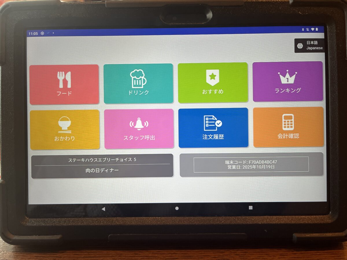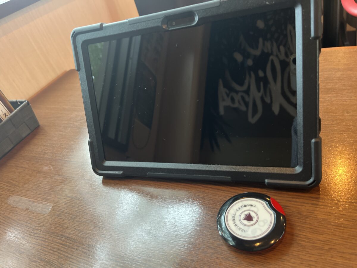 注文は卓上のタブレットです。最初、画面をタッチしても全く反応しなくて困った。何度か画面をタッチして、やっと起動した。やっぱAndroidはちょっとなぁ。。。(個人的な意見です。)