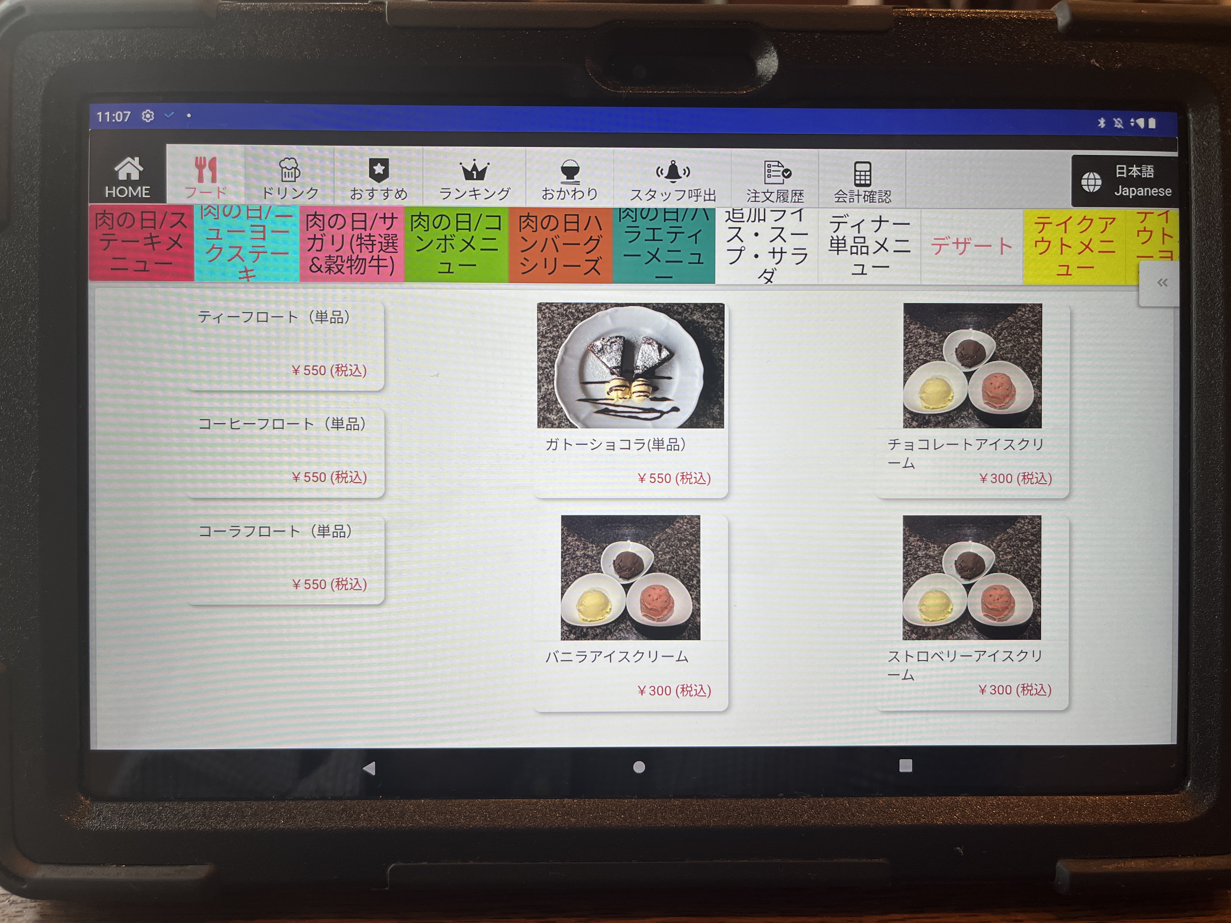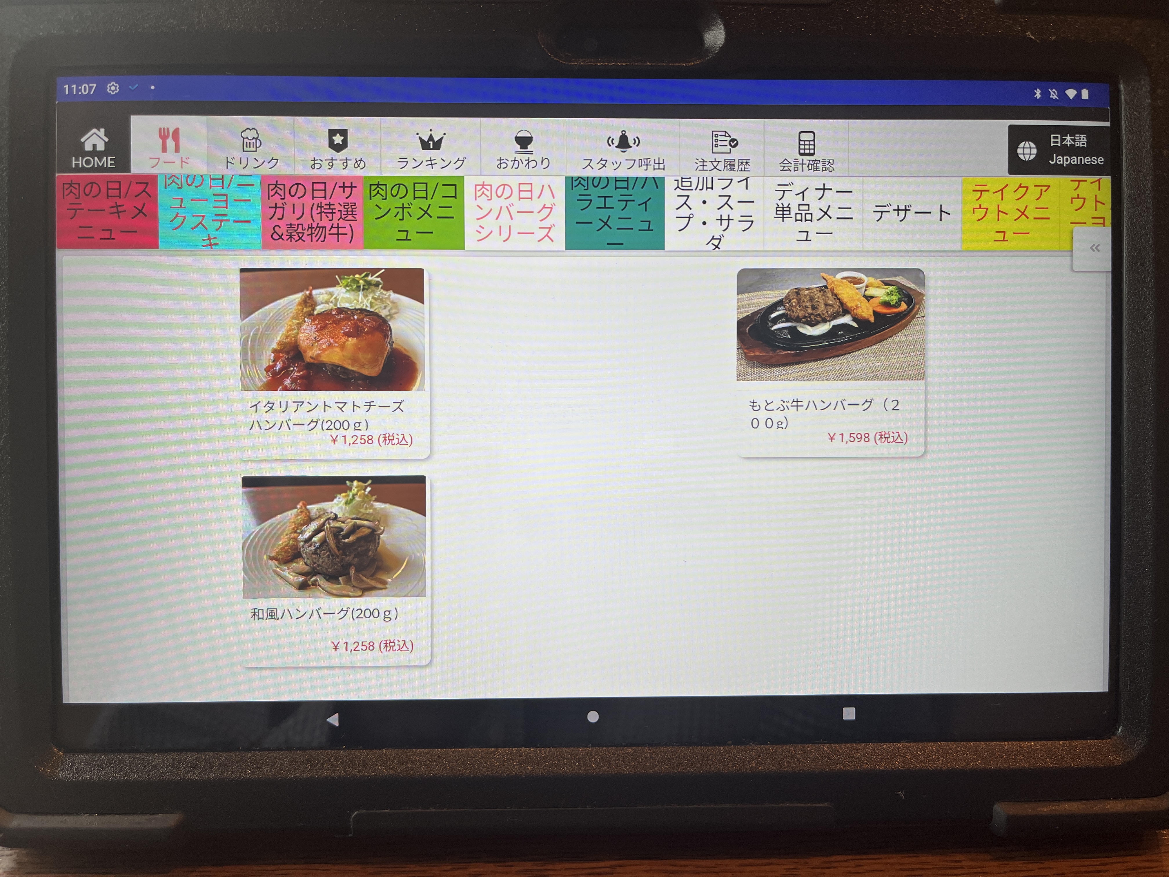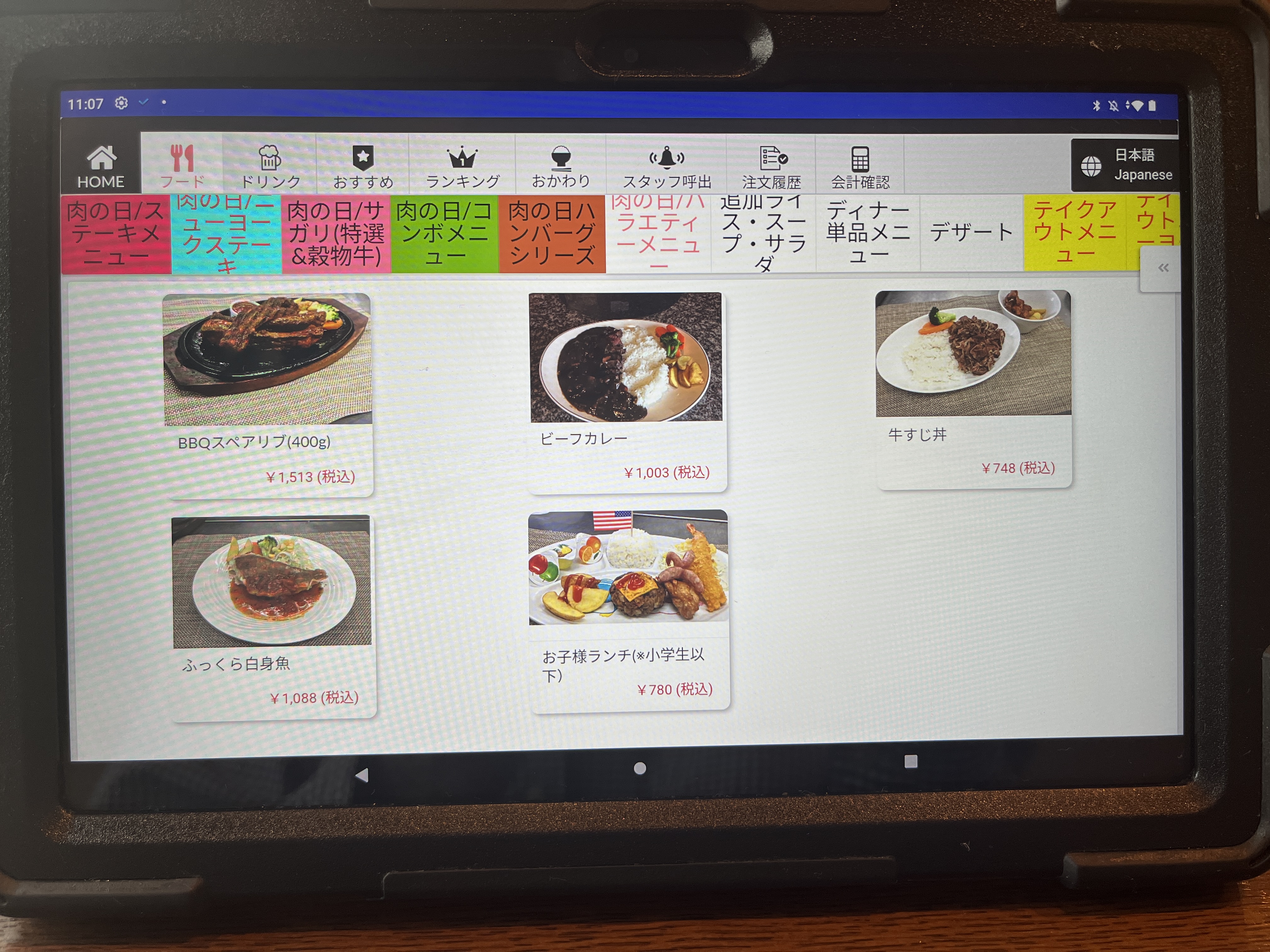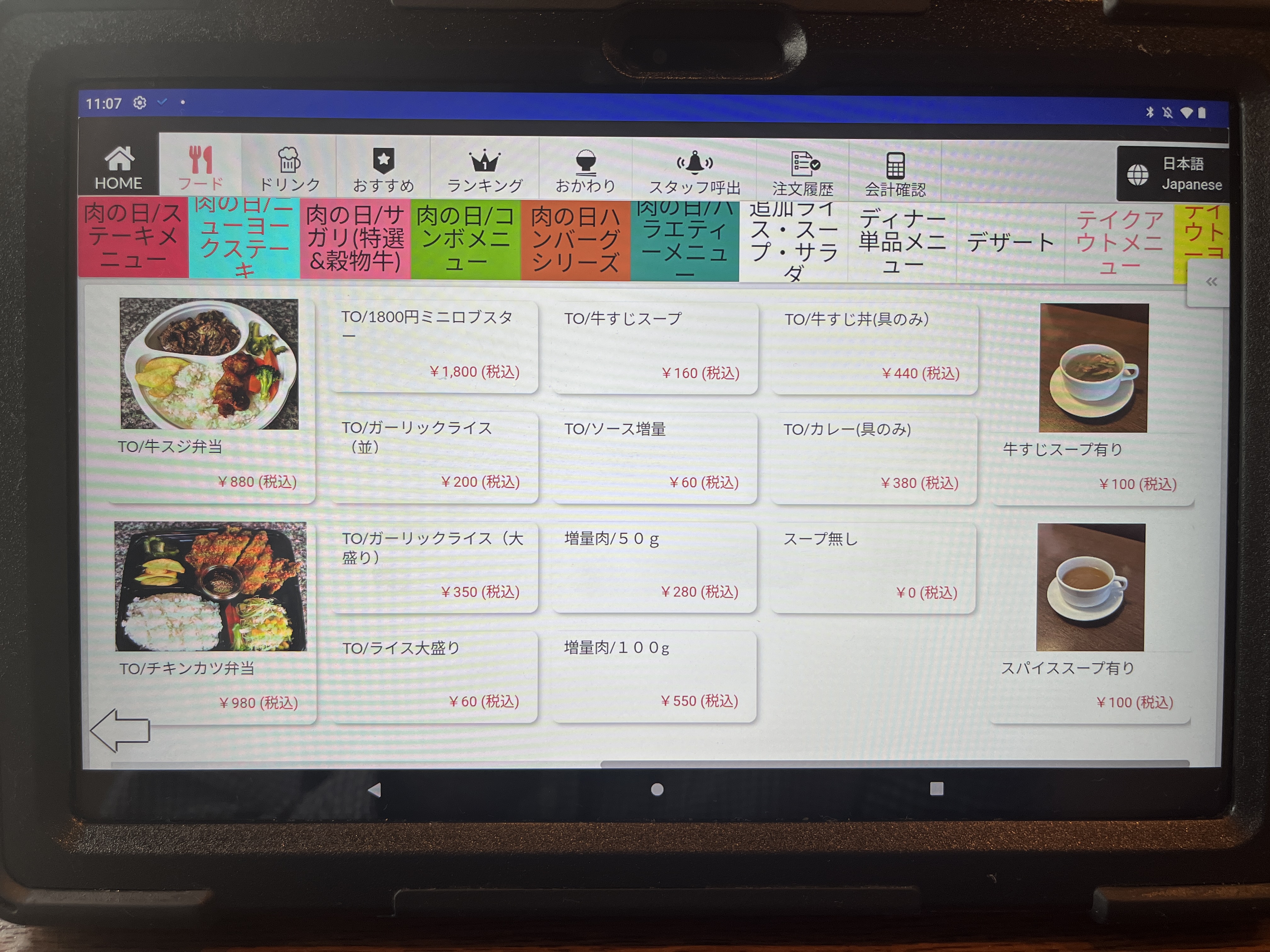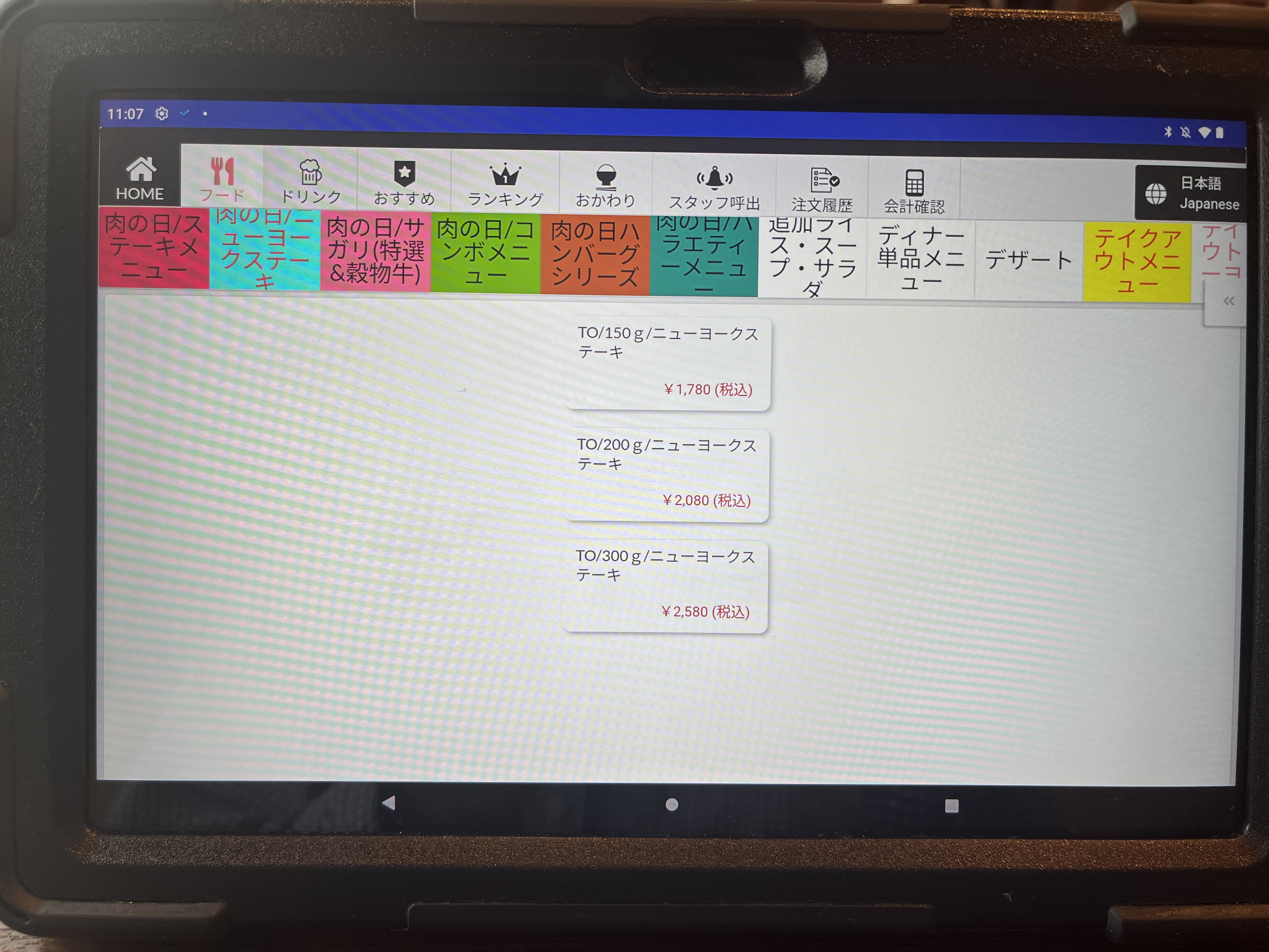 注文は卓上のタブレットです。最初、画面をタッチしても全く反応しなくて困った。何度か画面をタッチして、やっと起動した。やっぱAndroidはちょっとなぁ。。。(個人的な意見です。)