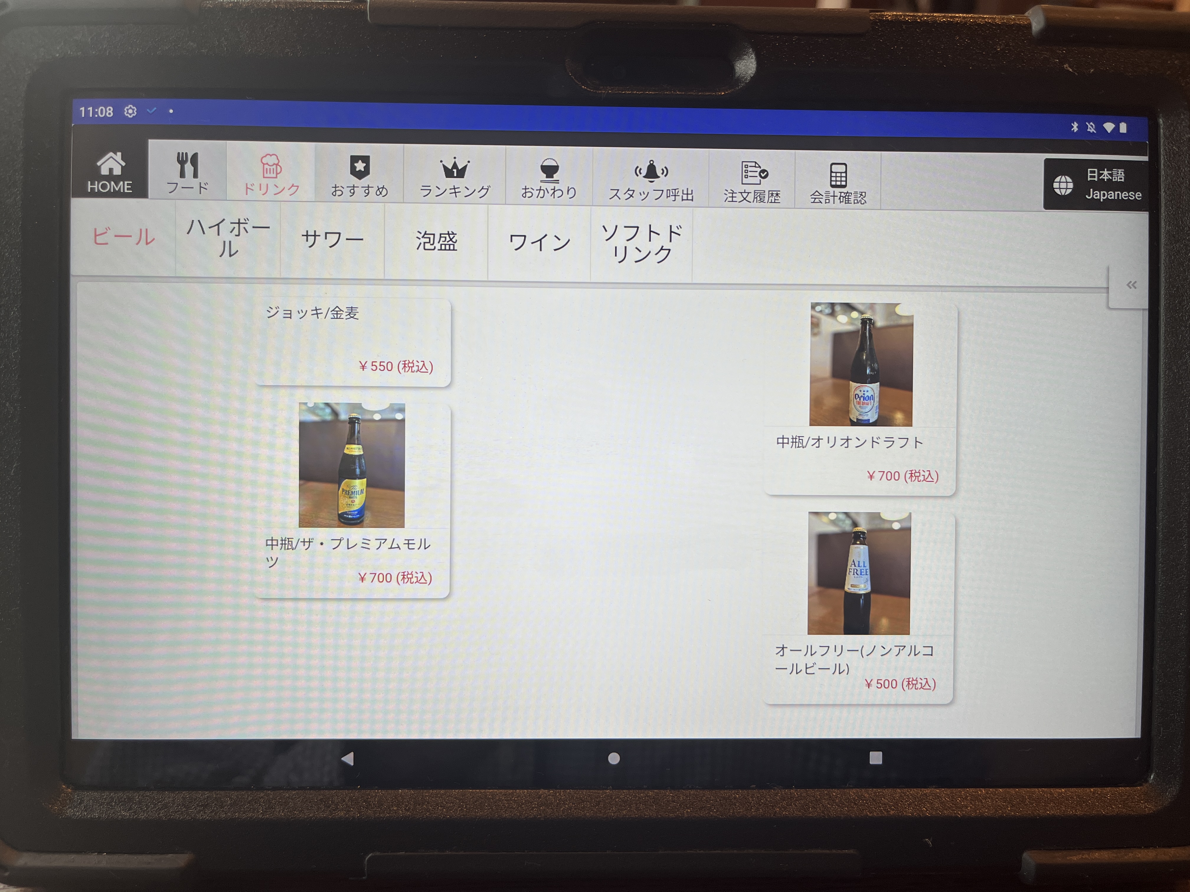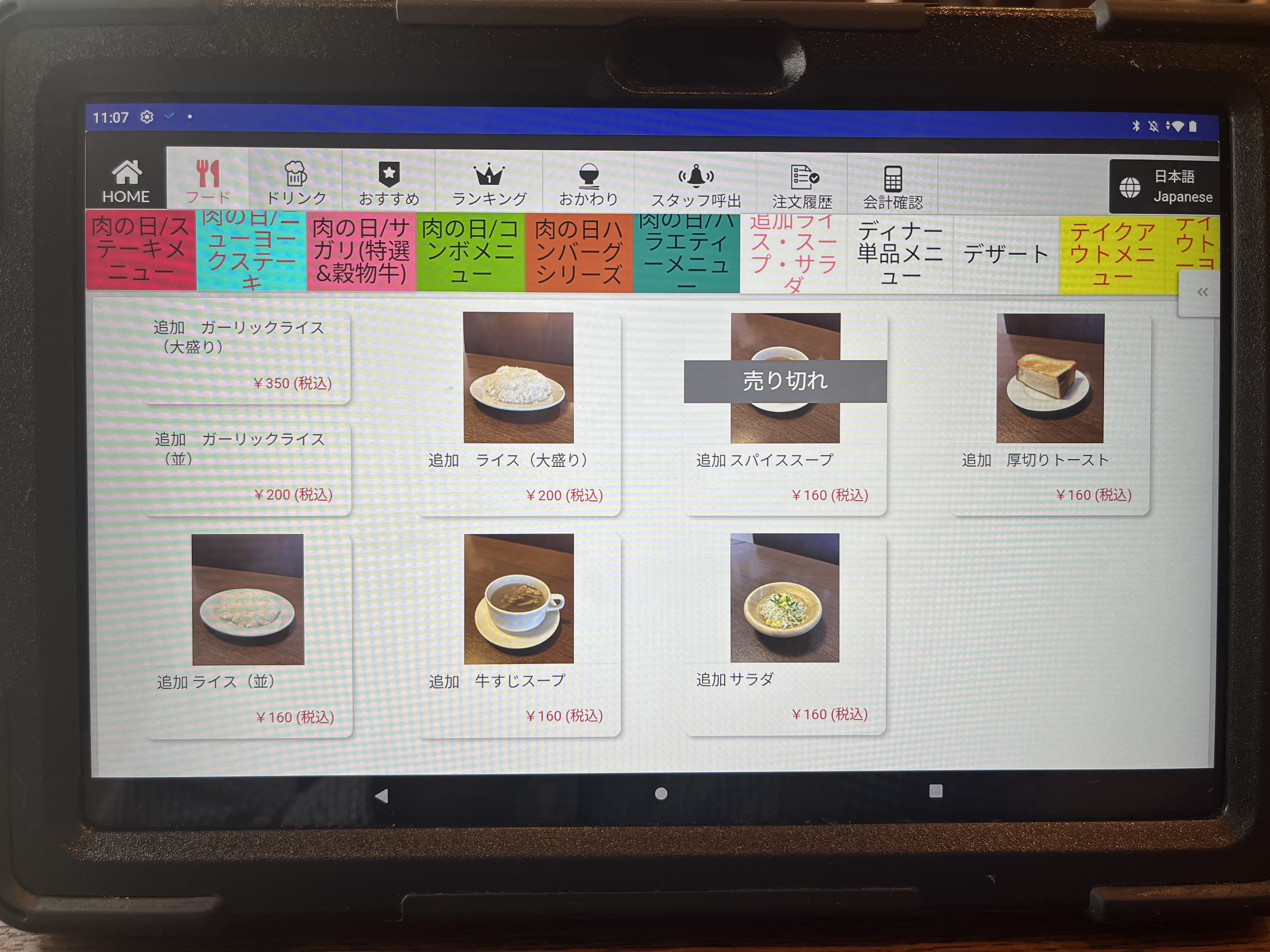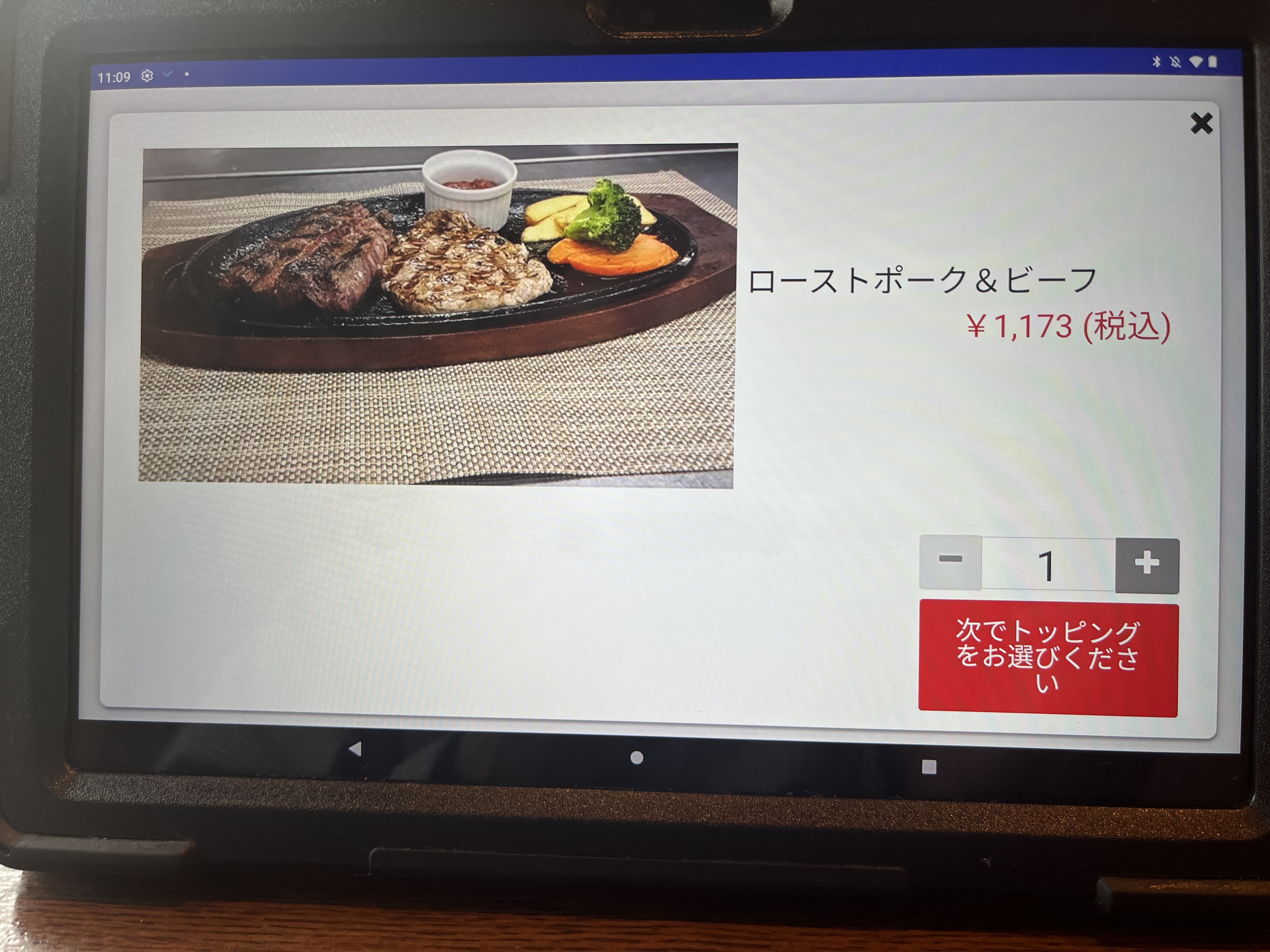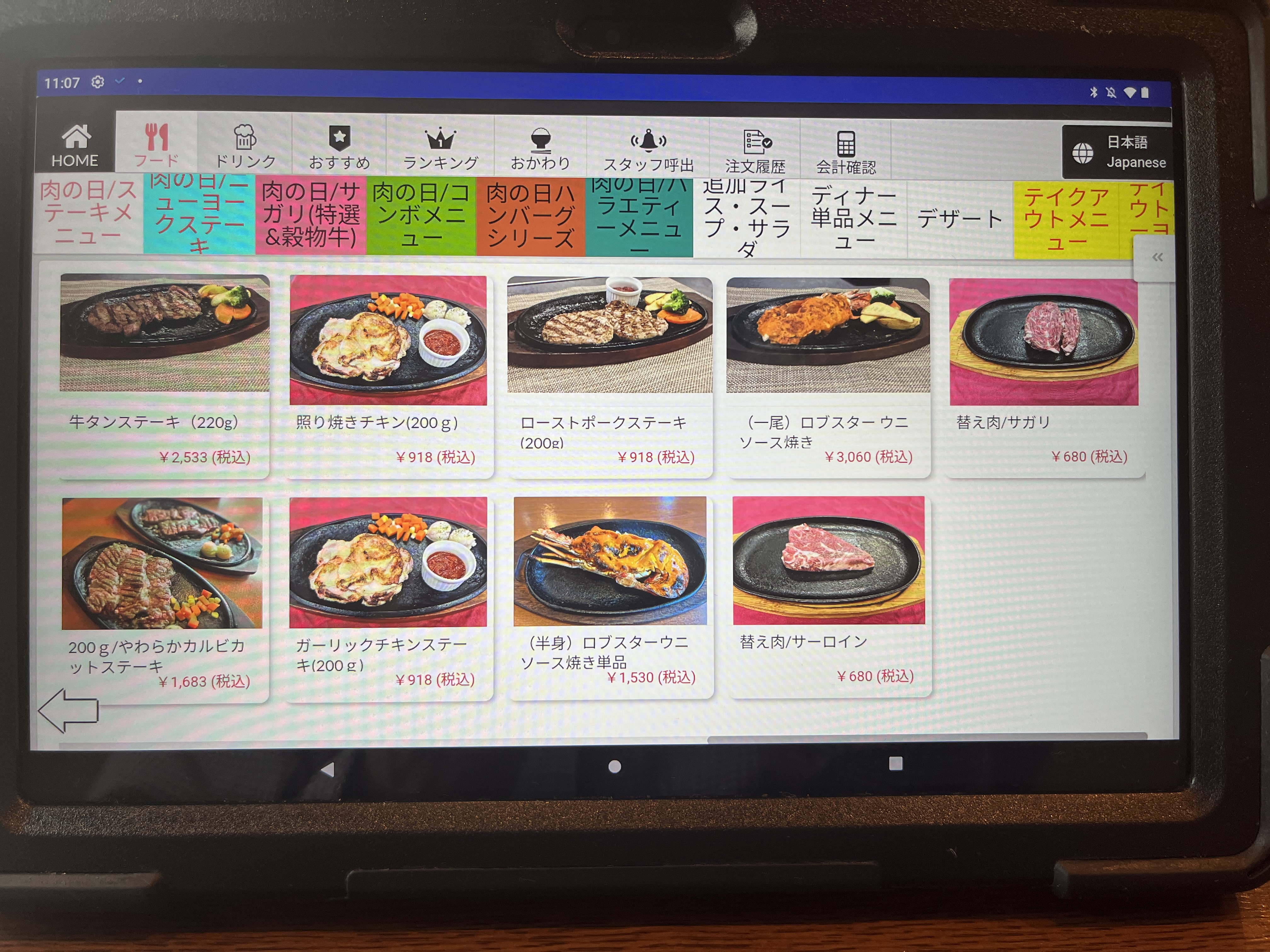 注文は卓上のタブレットです。最初、画面をタッチしても全く反応しなくて困った。何度か画面をタッチして、やっと起動した。やっぱAndroidはちょっとなぁ。。。(個人的な意見です。)