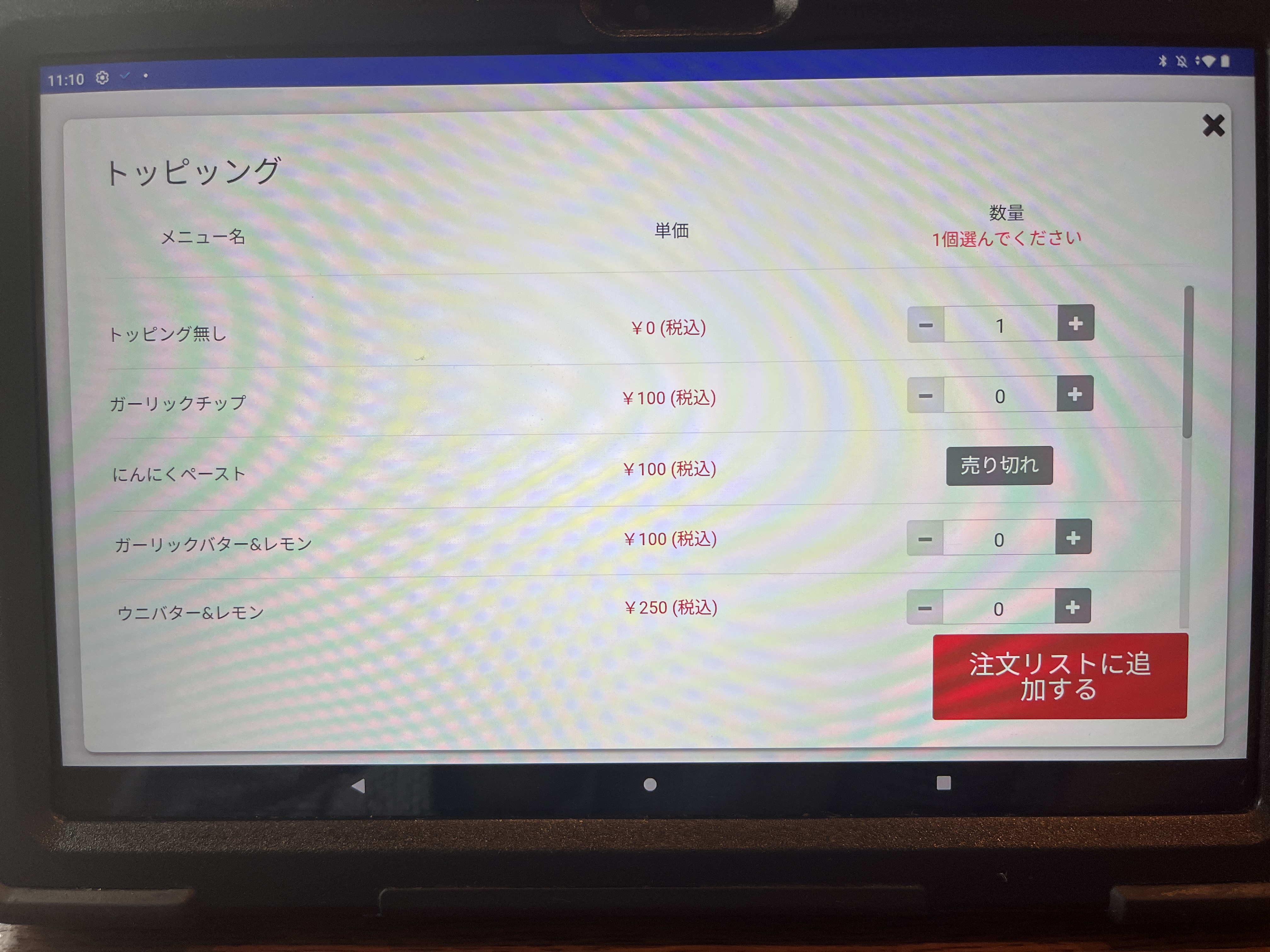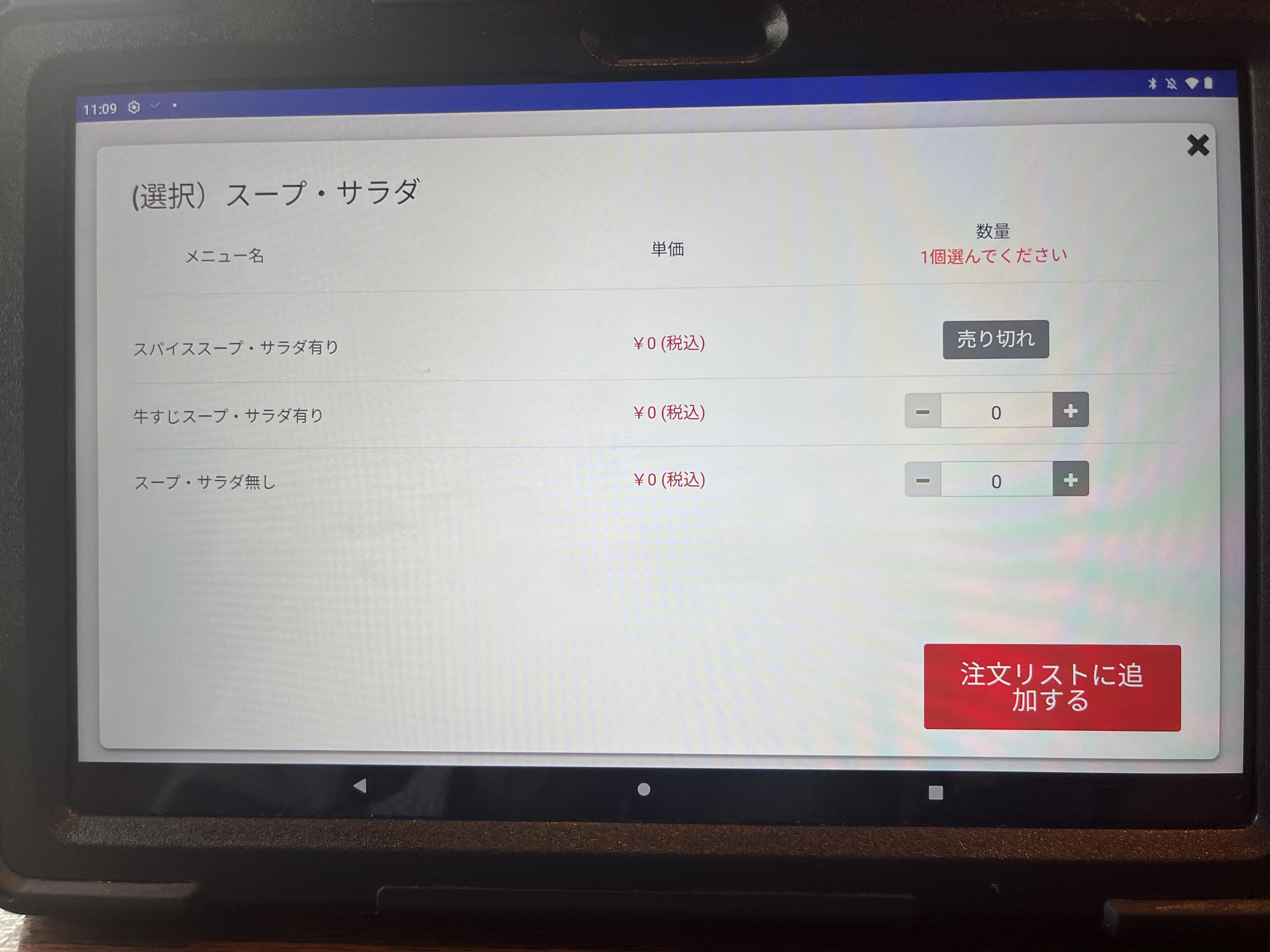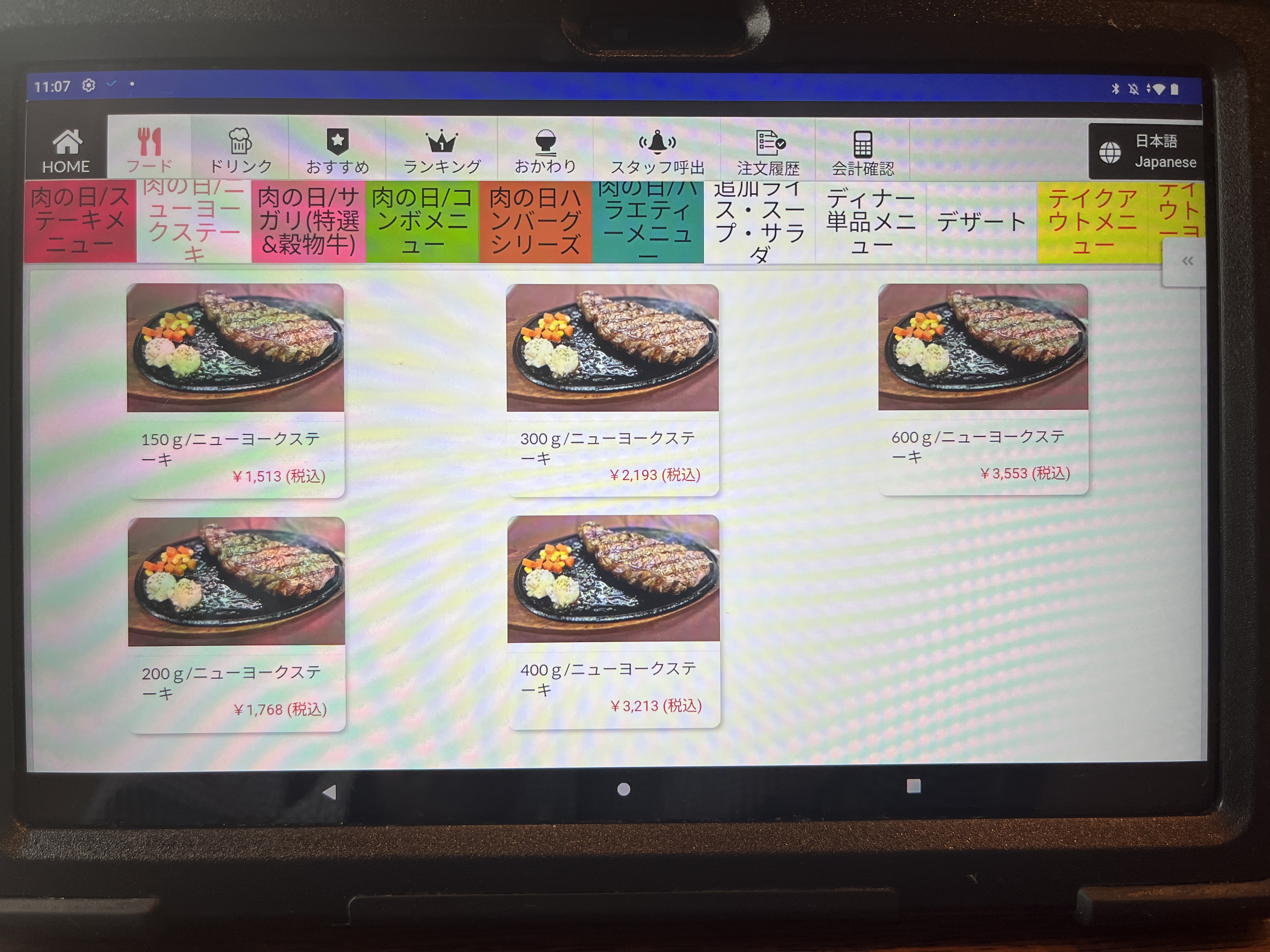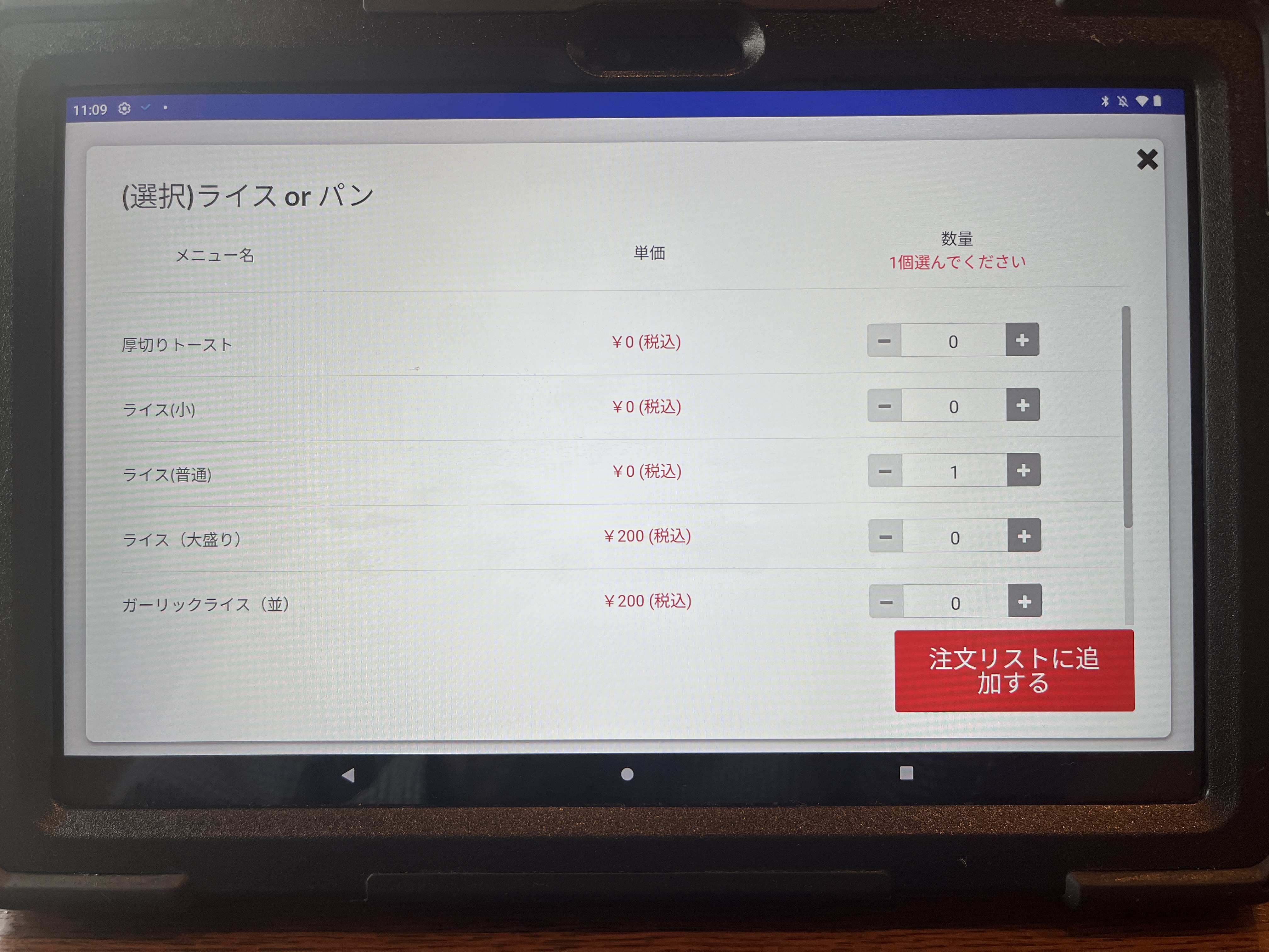 注文は卓上のタブレットです。最初、画面をタッチしても全く反応しなくて困った。何度か画面をタッチして、やっと起動した。やっぱAndroidはちょっとなぁ。。。(個人的な意見です。)
