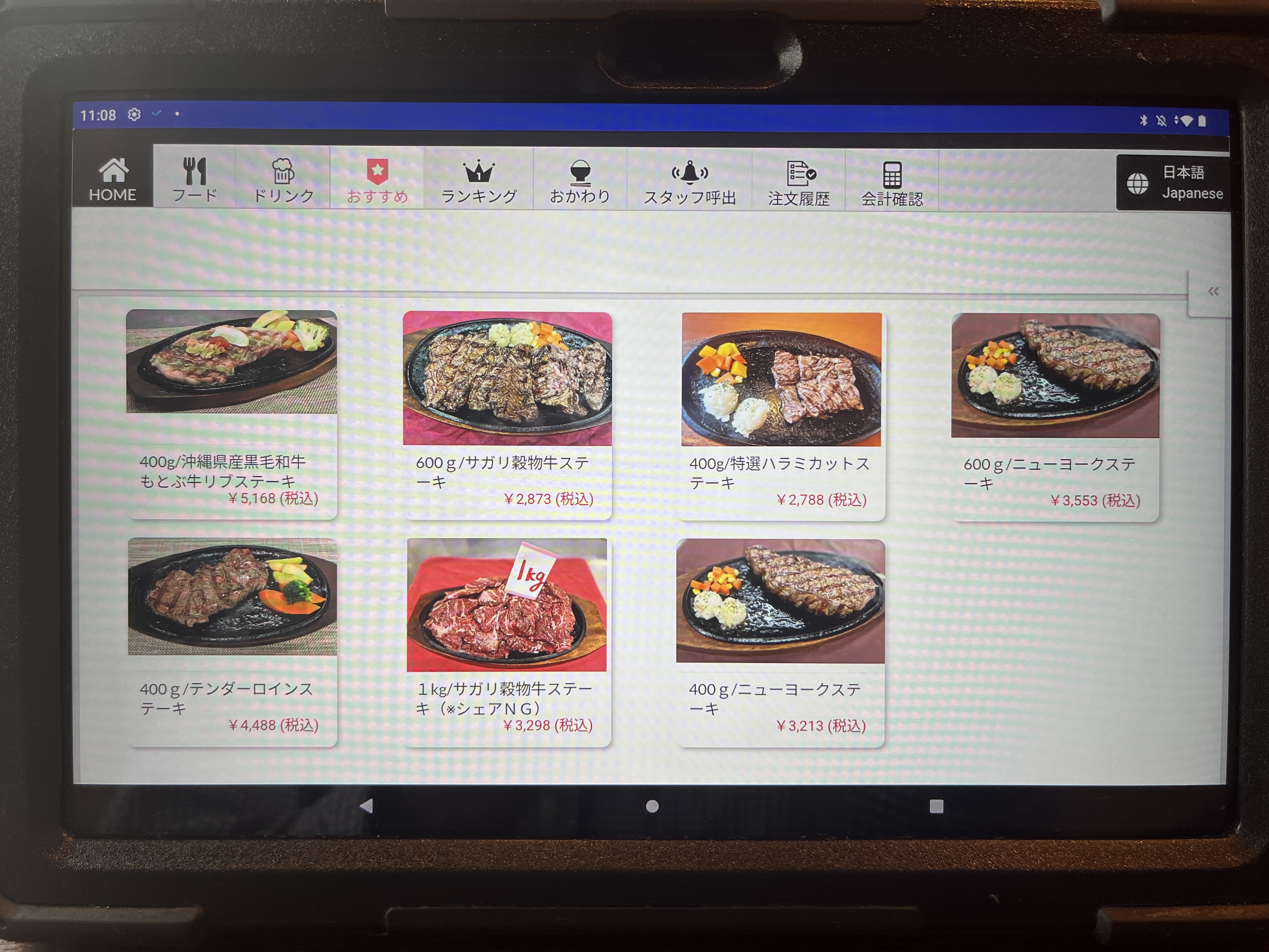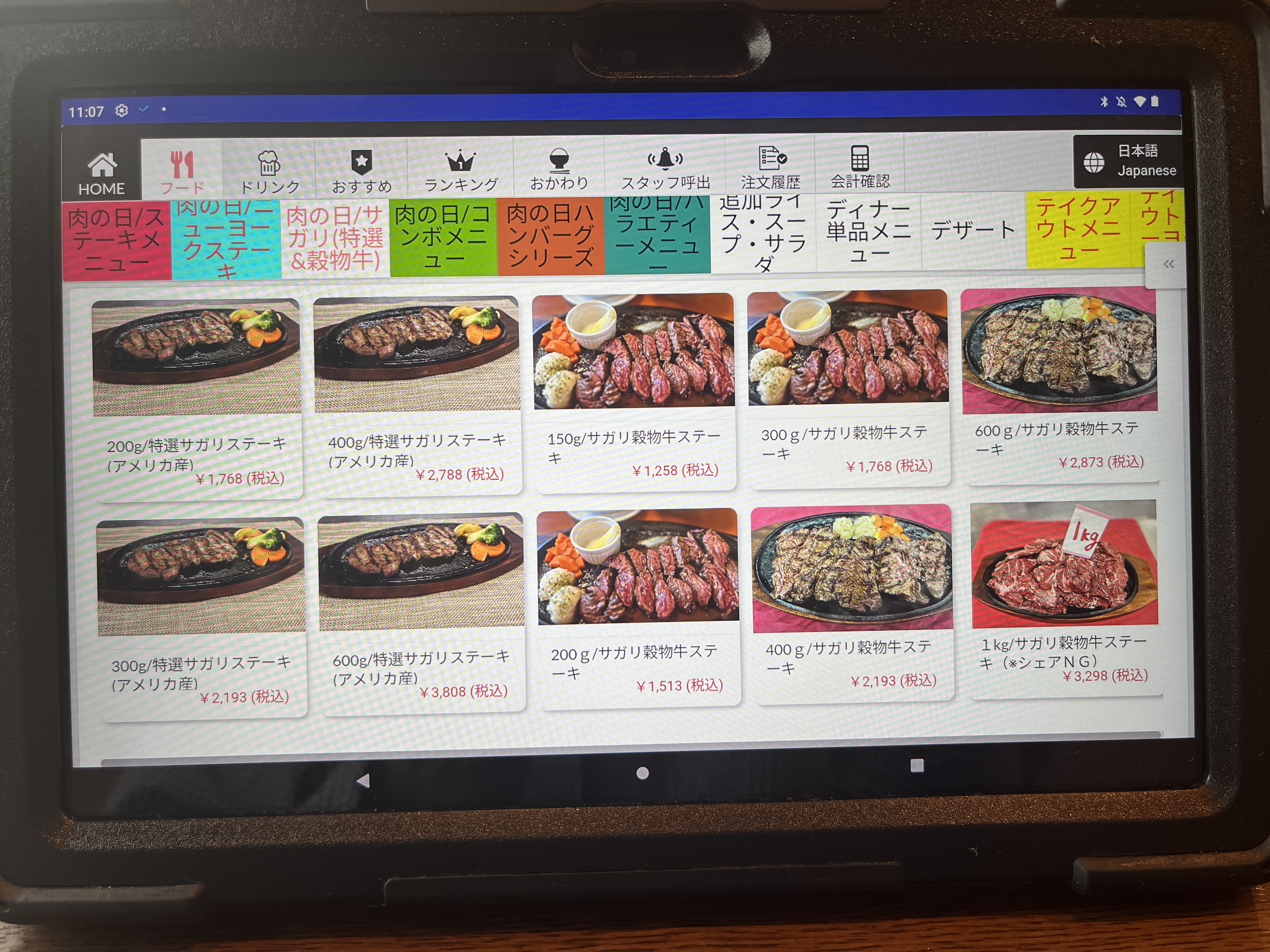 おすすめに並ぶ400g~1kgの商品群。400gって多いよね?って思ってるけど、周りのテーブルは普通に400gを頼んでる人いた。みなさん、すごいっすね。それとも私が小食なのか?