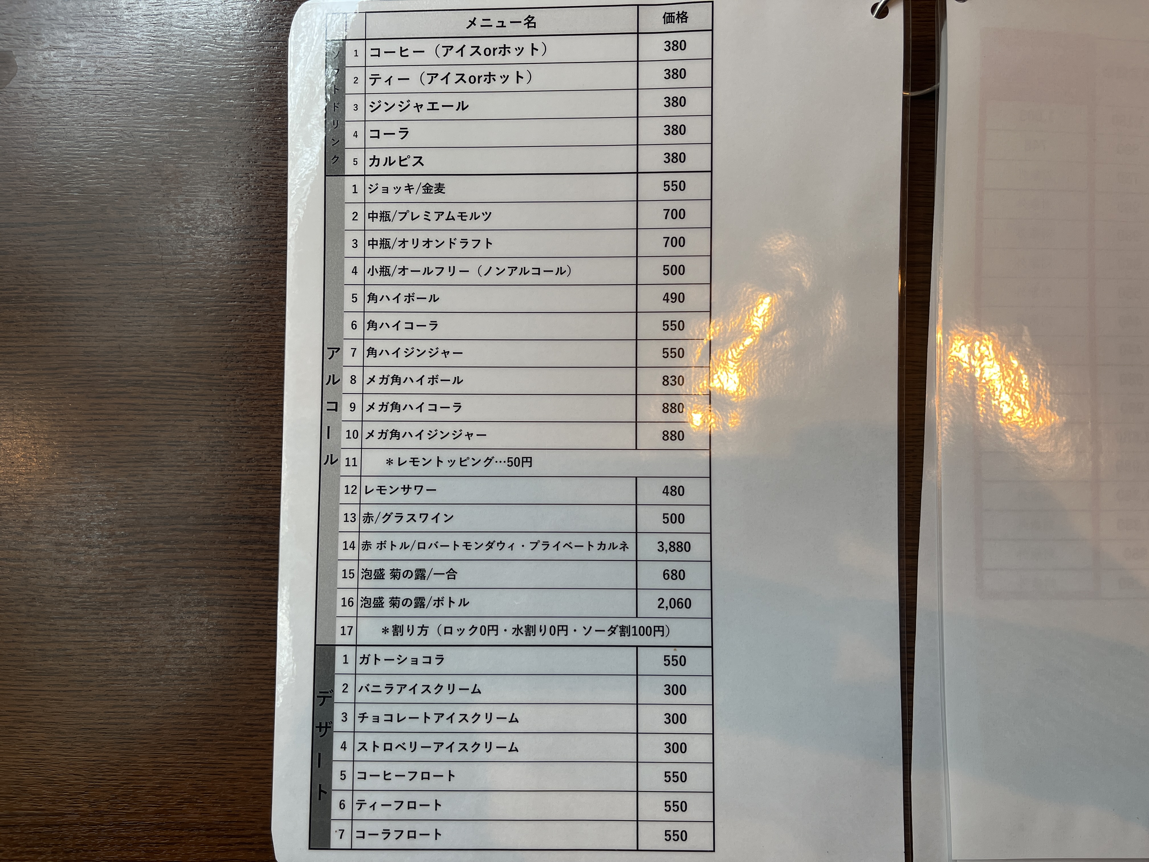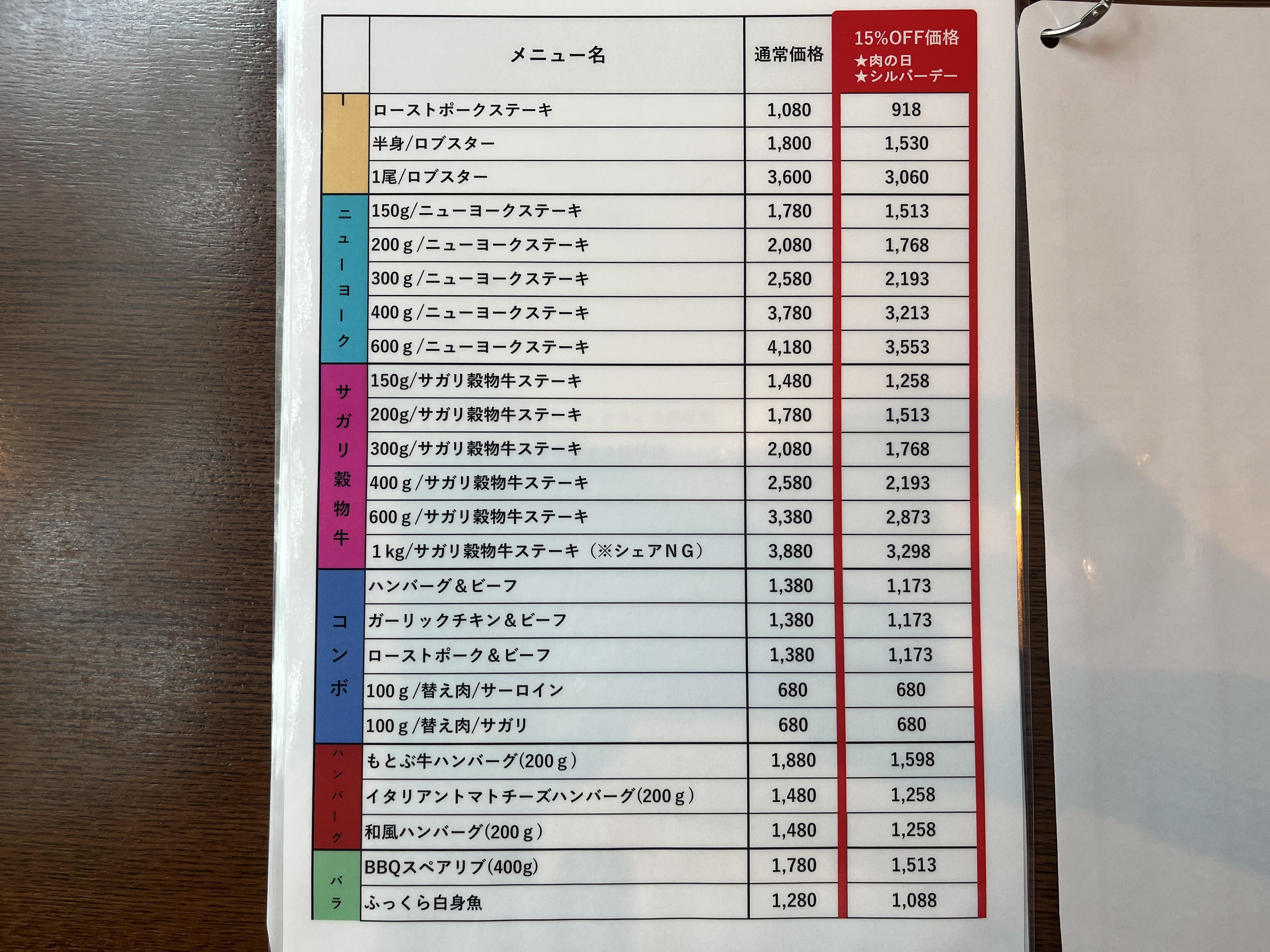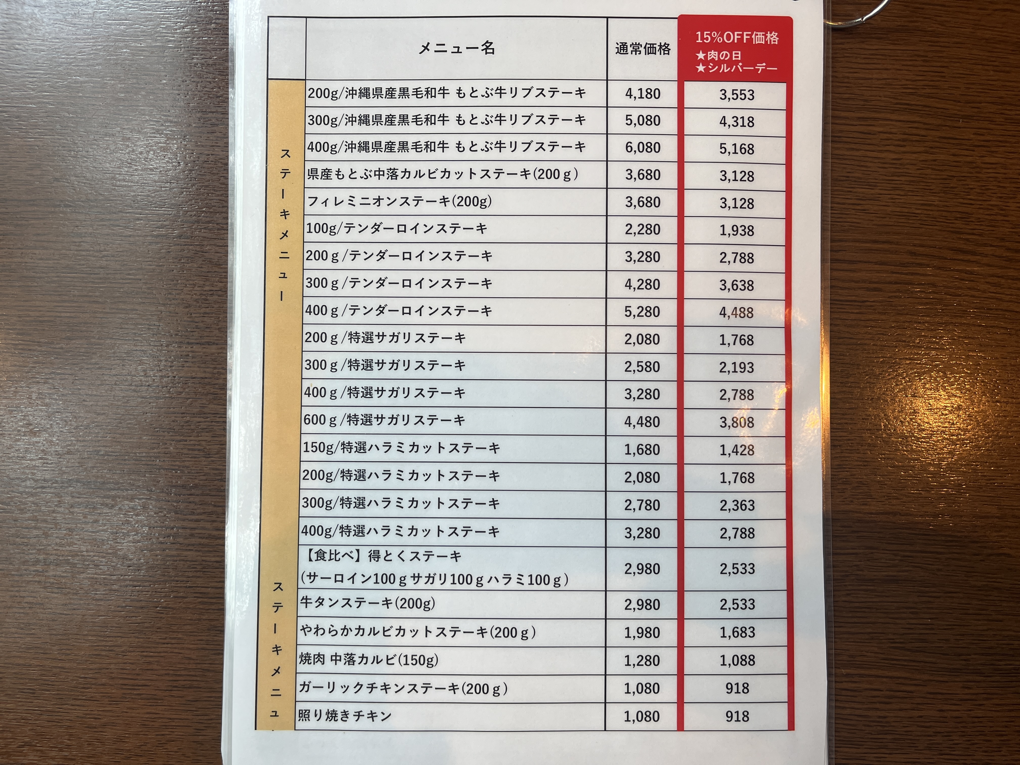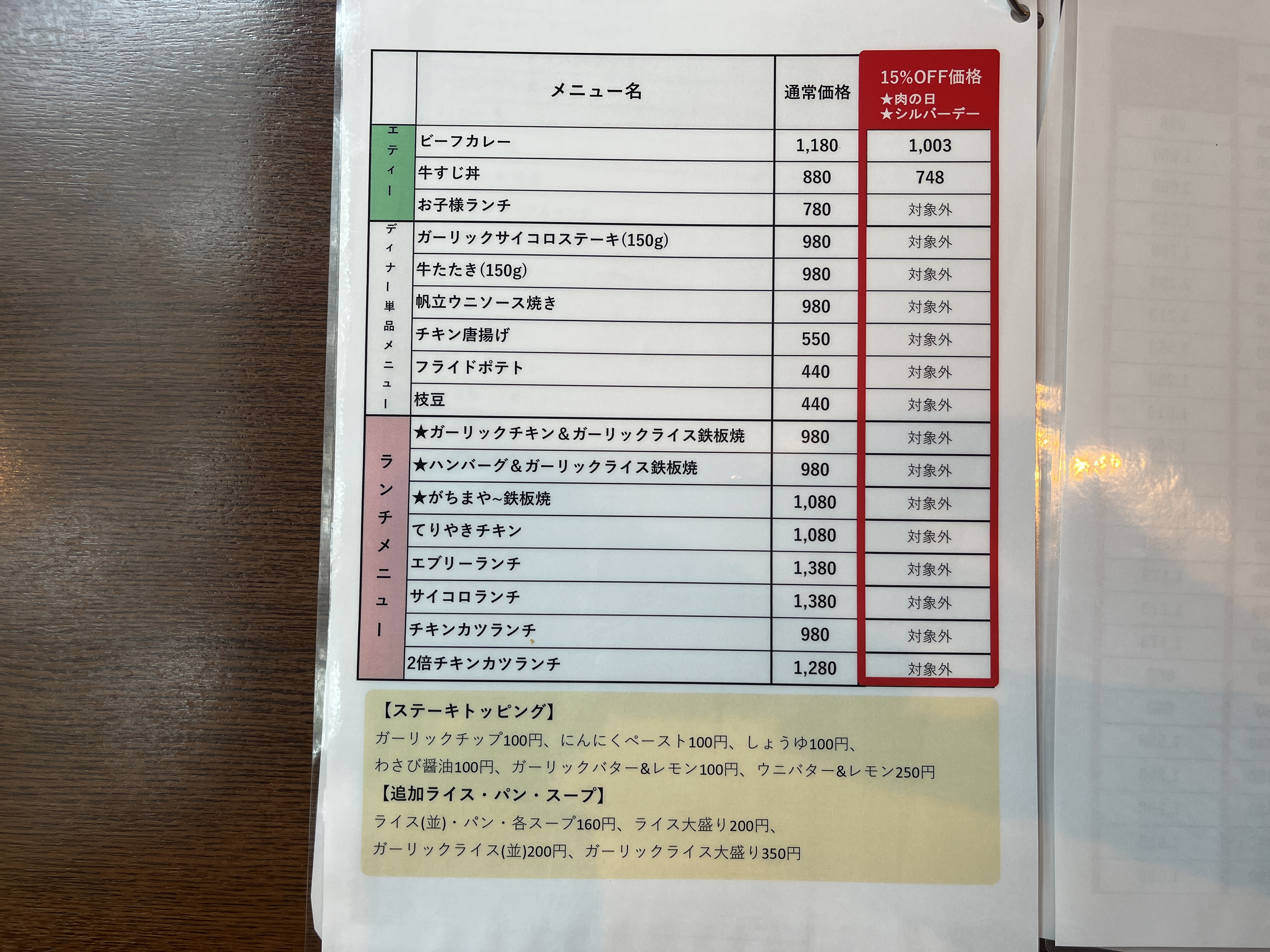 「通常価格」と「15%OFF価格」が併記されてますが、一部メニューは対象外です。コレはわかりやすくて良いですね。