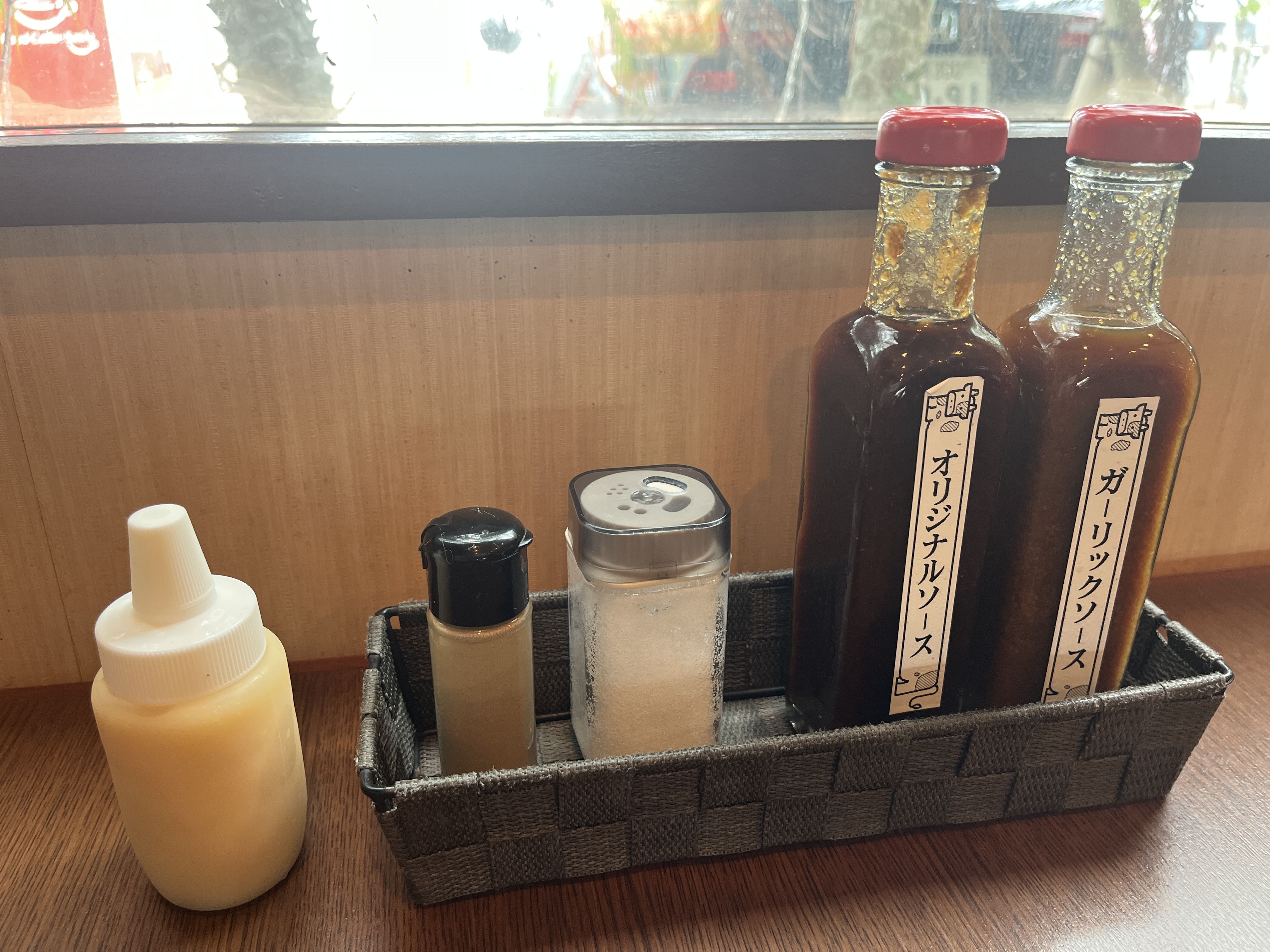 左から、にんにく、胡椒、塩、オリジナルソース、ガーリックソース。