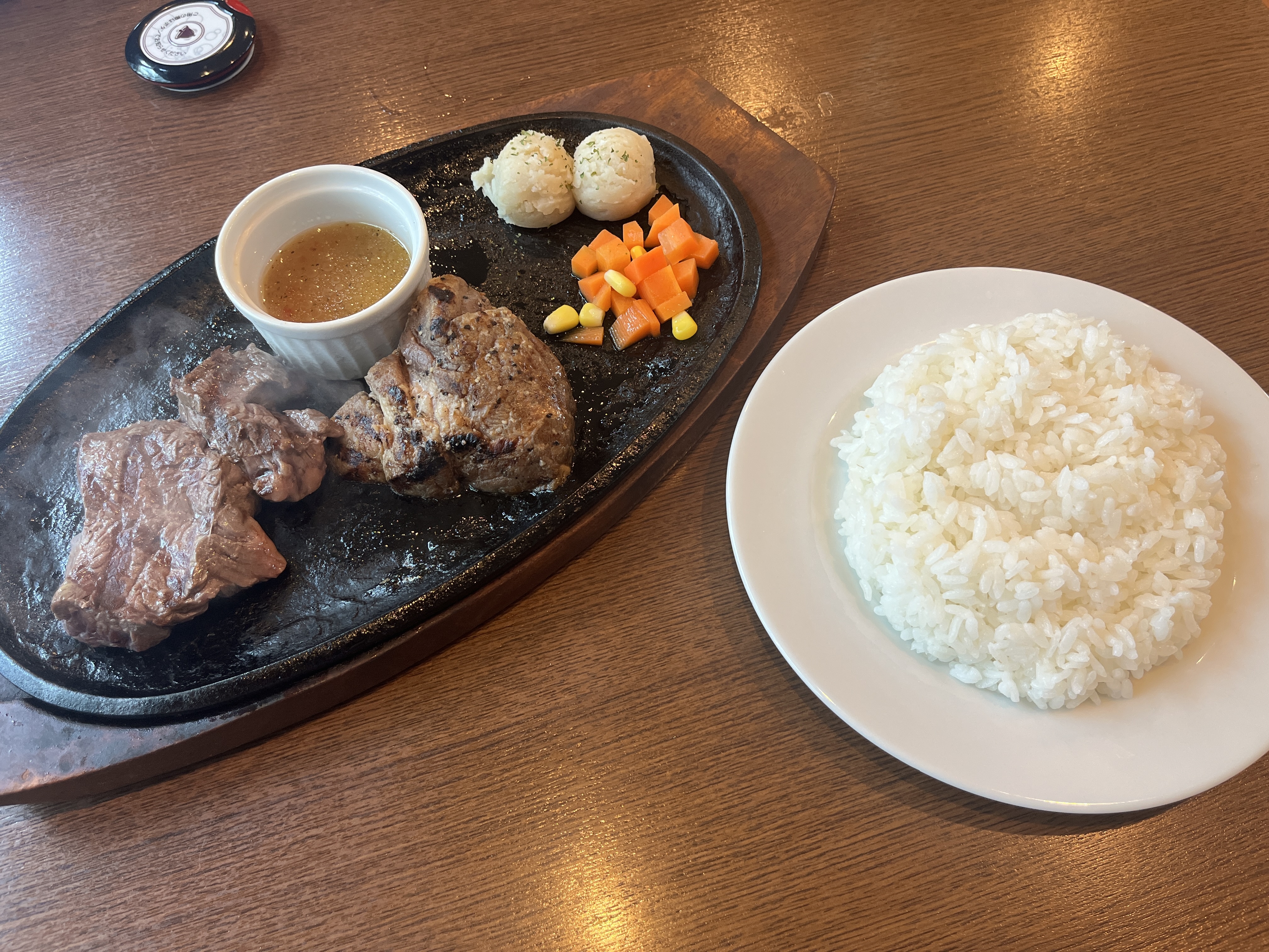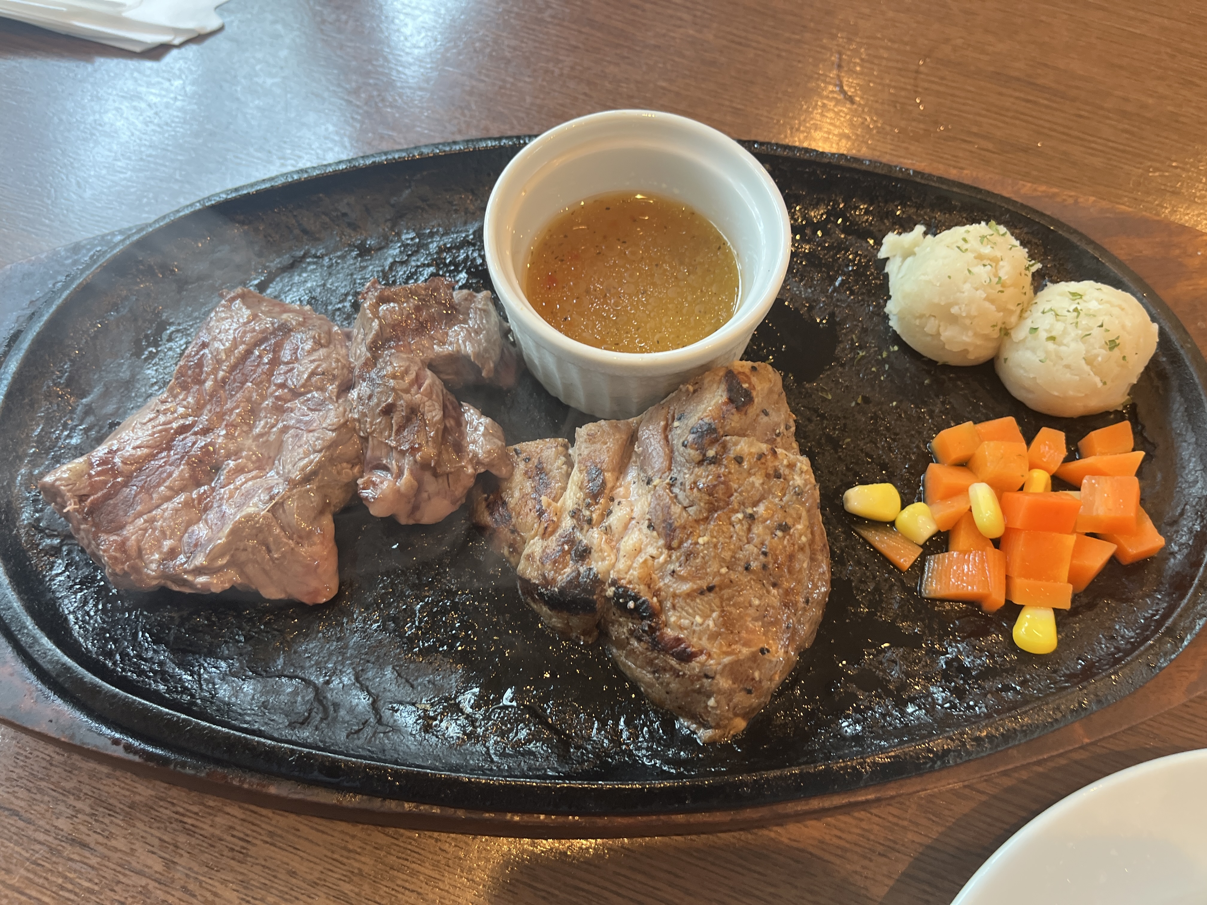 ステーキはビーフ!って思ってるけど、ポークも普通に美味しい。ポークだけだと飽きる可能性あるけど、ビーフ&ポークなら飽きない!2つの味が楽しめるって、お得!