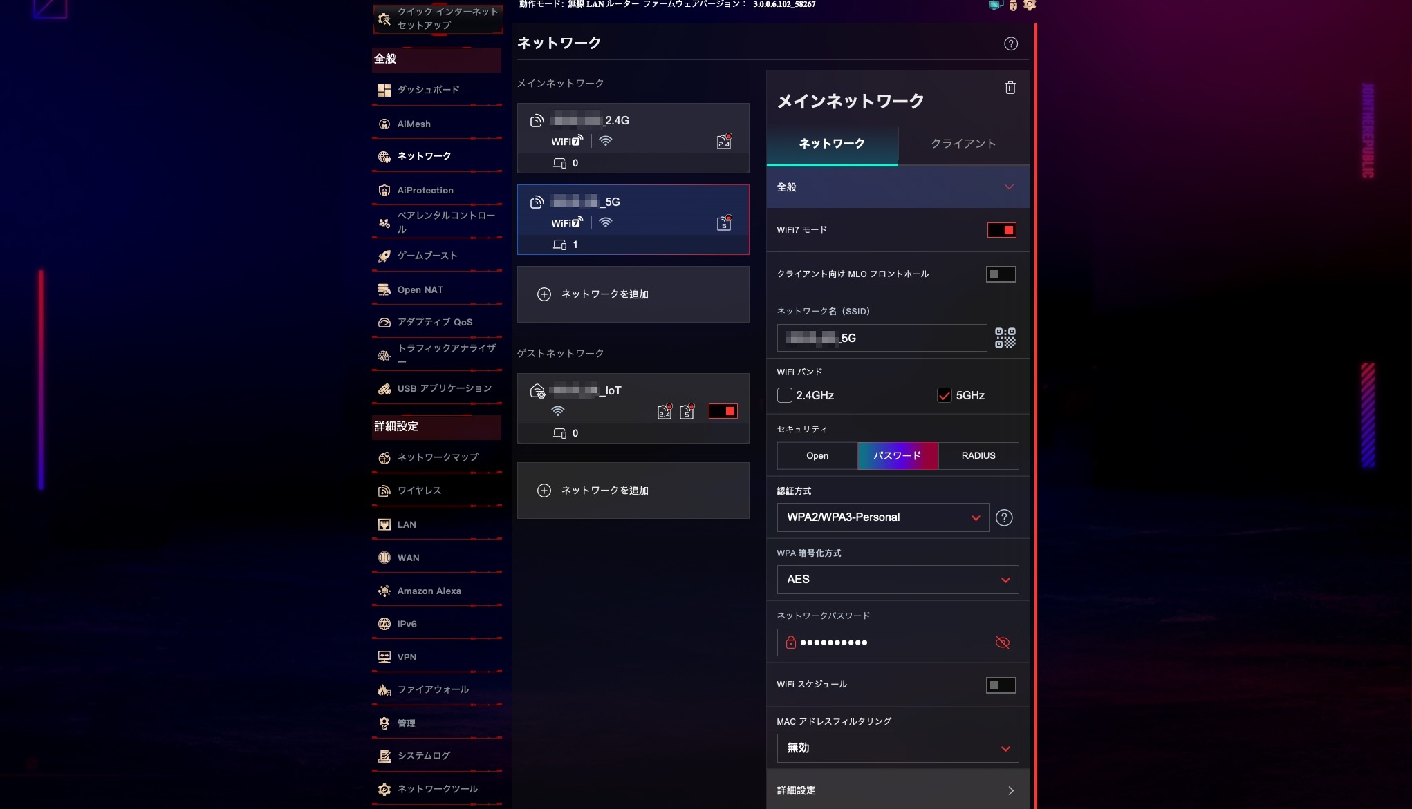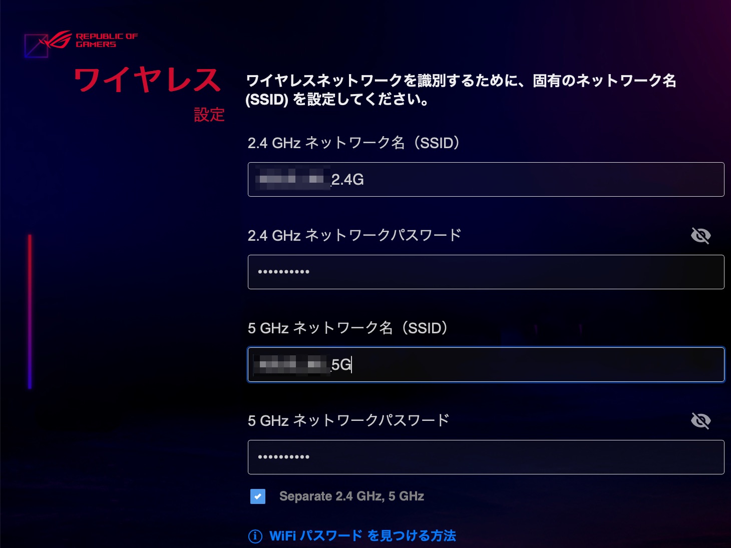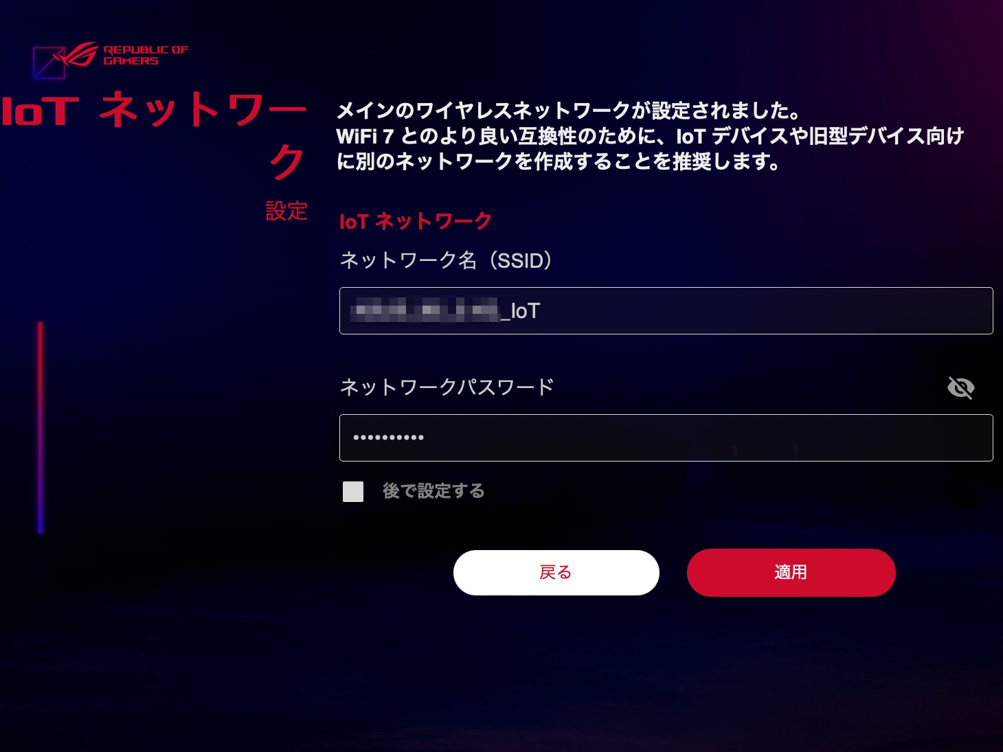デフォルトでIoT向けのSSIDが準備されていて、初期設定時、2.4G、5GのSSID設定に続けて、IoTのSSID設定をします。