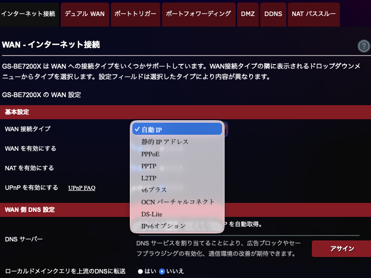 ※接続方式がtransixもしくはクロスパスの場合は「DS-Lite」を選択で利用可能。