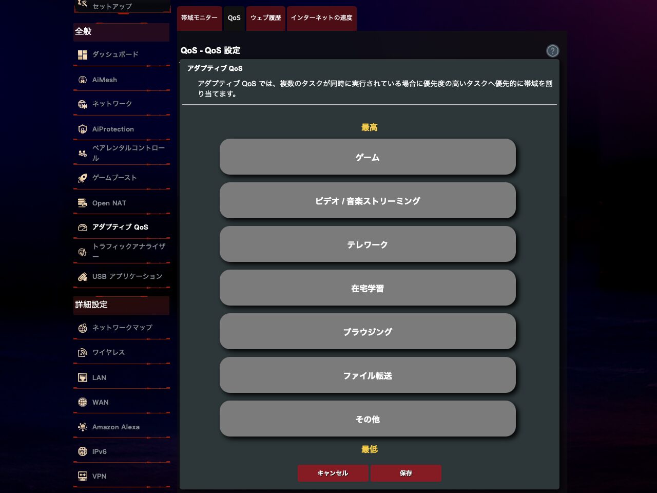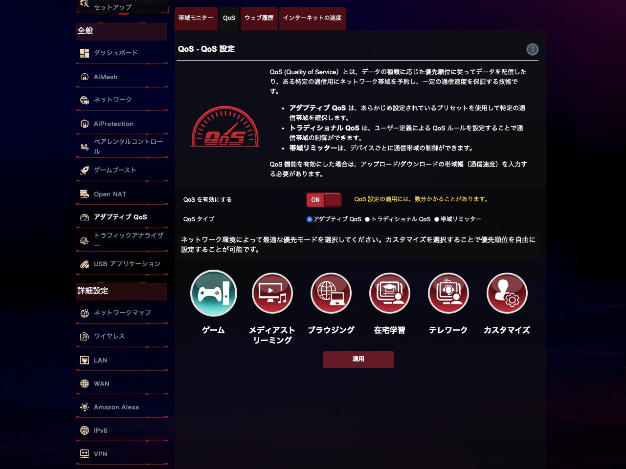 QoSの設定も簡単!ゲームやメディアストリーミングなど、任意のモードを選ぶだけ。また、カスタマイズでは、個別で優先順位をつける事も可能。