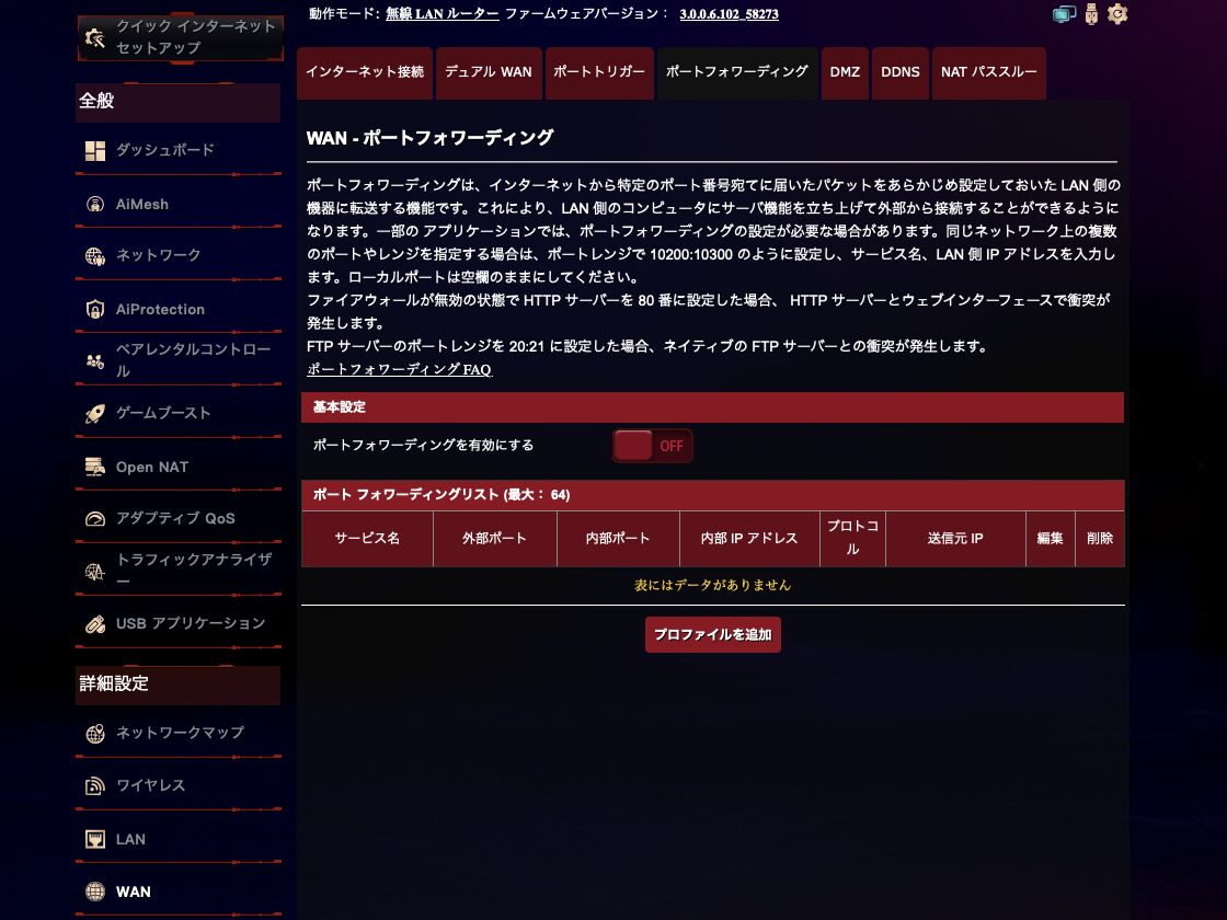 因みに、WANの設定では、本来のポートフォワーディングの手動設定も可能。