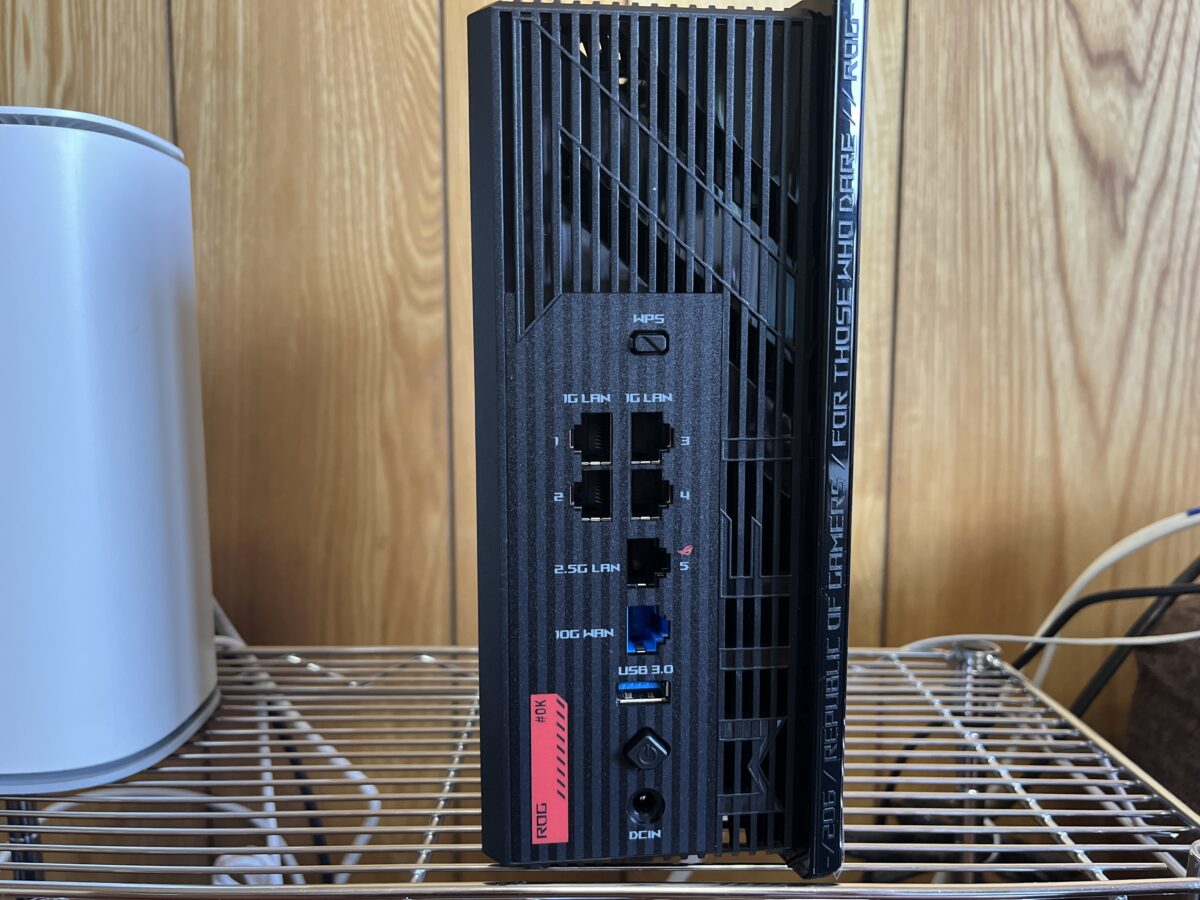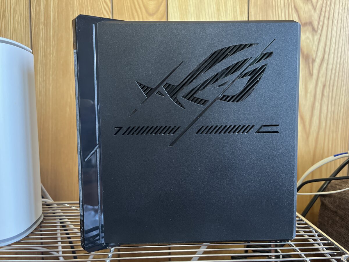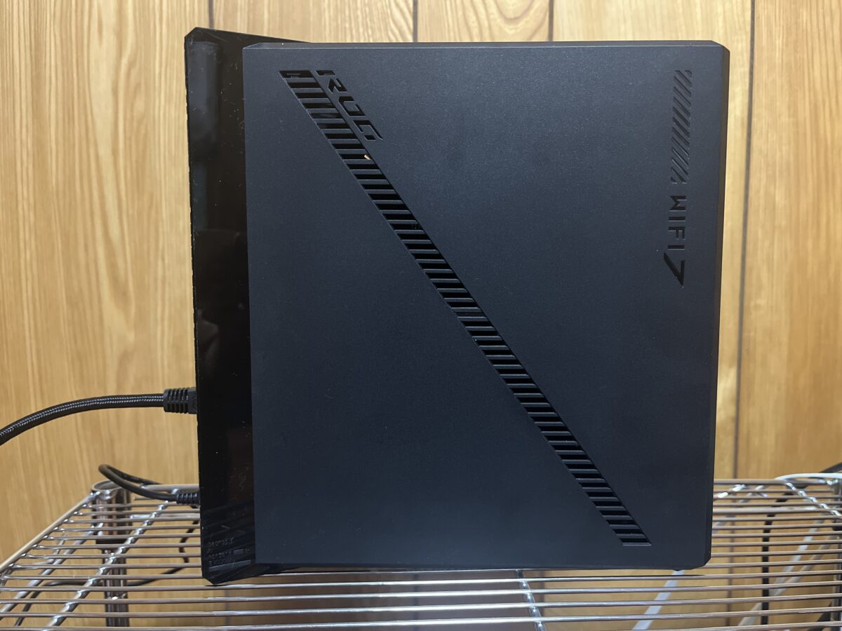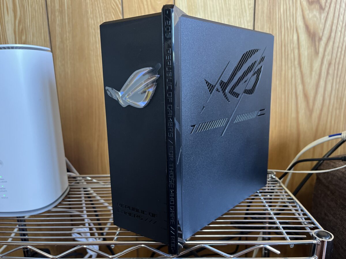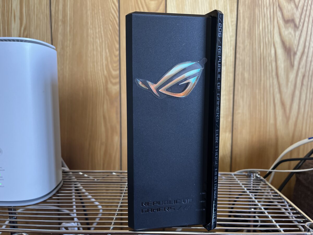 しかし、ROGシリーズの他ルーターと違って、縦置きで、アンテナが本体内蔵なので、実際に設置してみると、意外に省スペース。尚、壁掛けは不可。