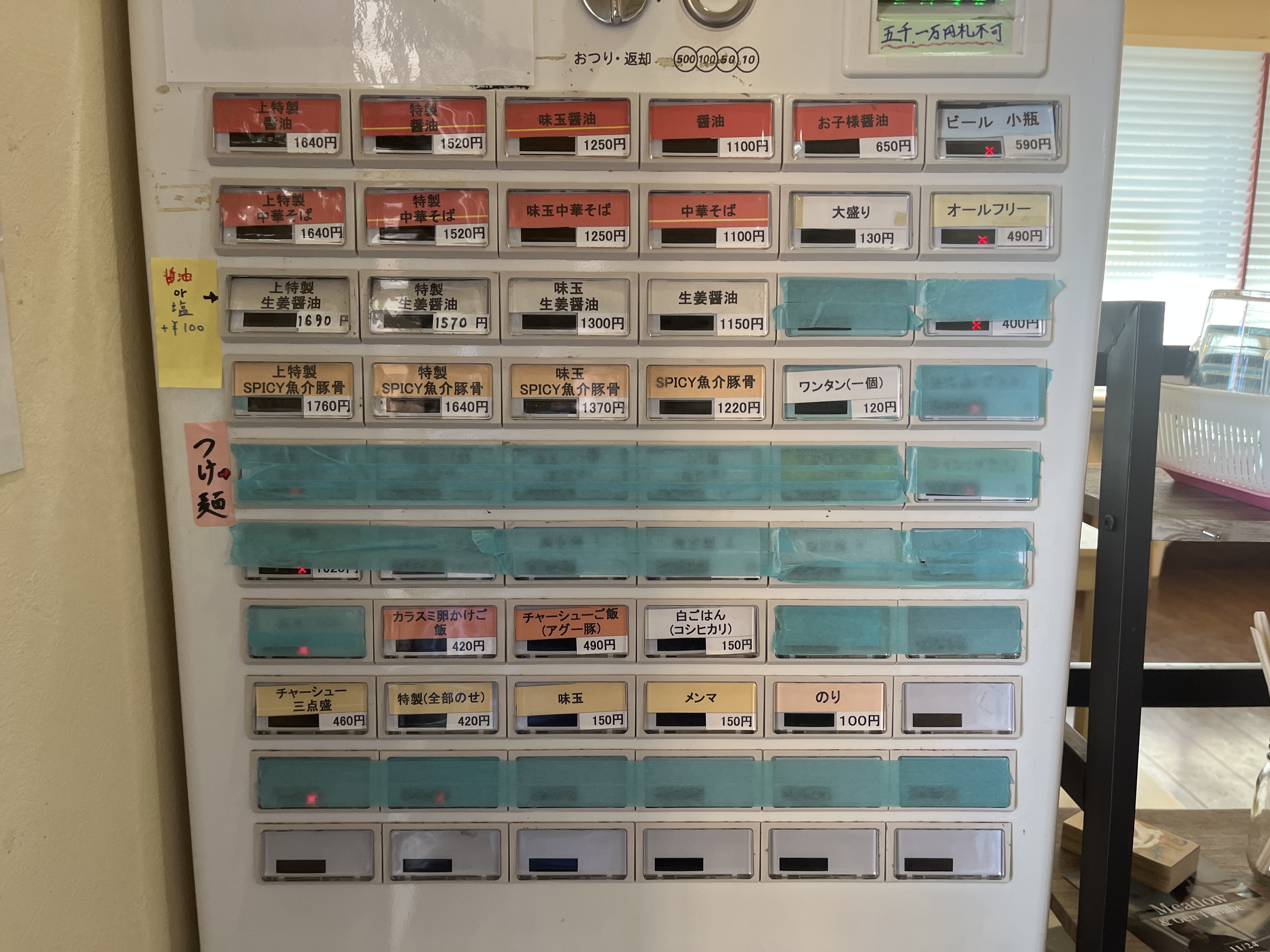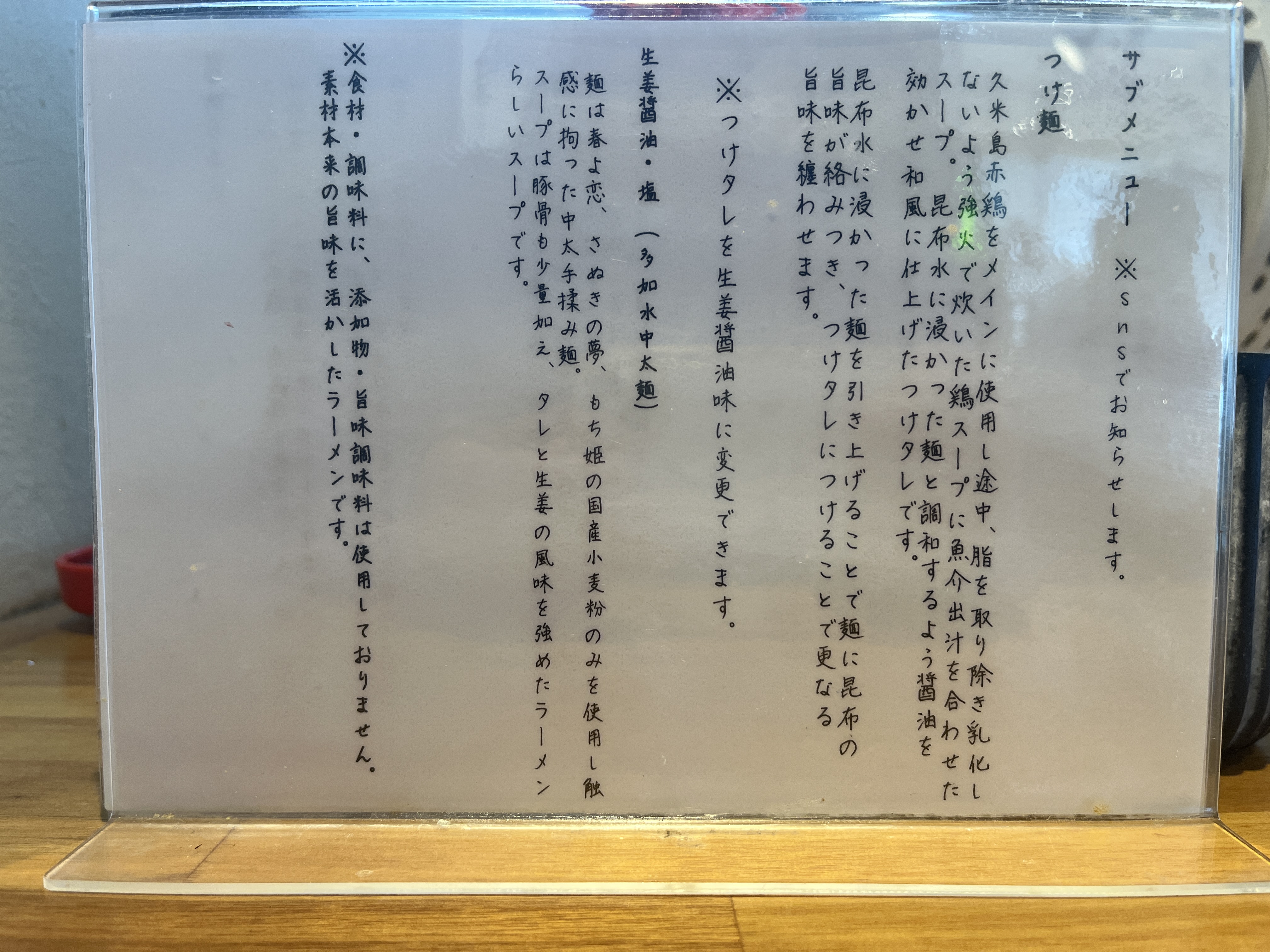 ラーメンの種類は、醤油、中華そば、生姜醤油 or 塩、SPICY魚介豚骨、つけ麺(終了)。ただし、季節により変動するみたいです。因みに、つけ麺は8月で終了したらしい。Instagramでメニュー情報が更新されるので、都度確認ですね。