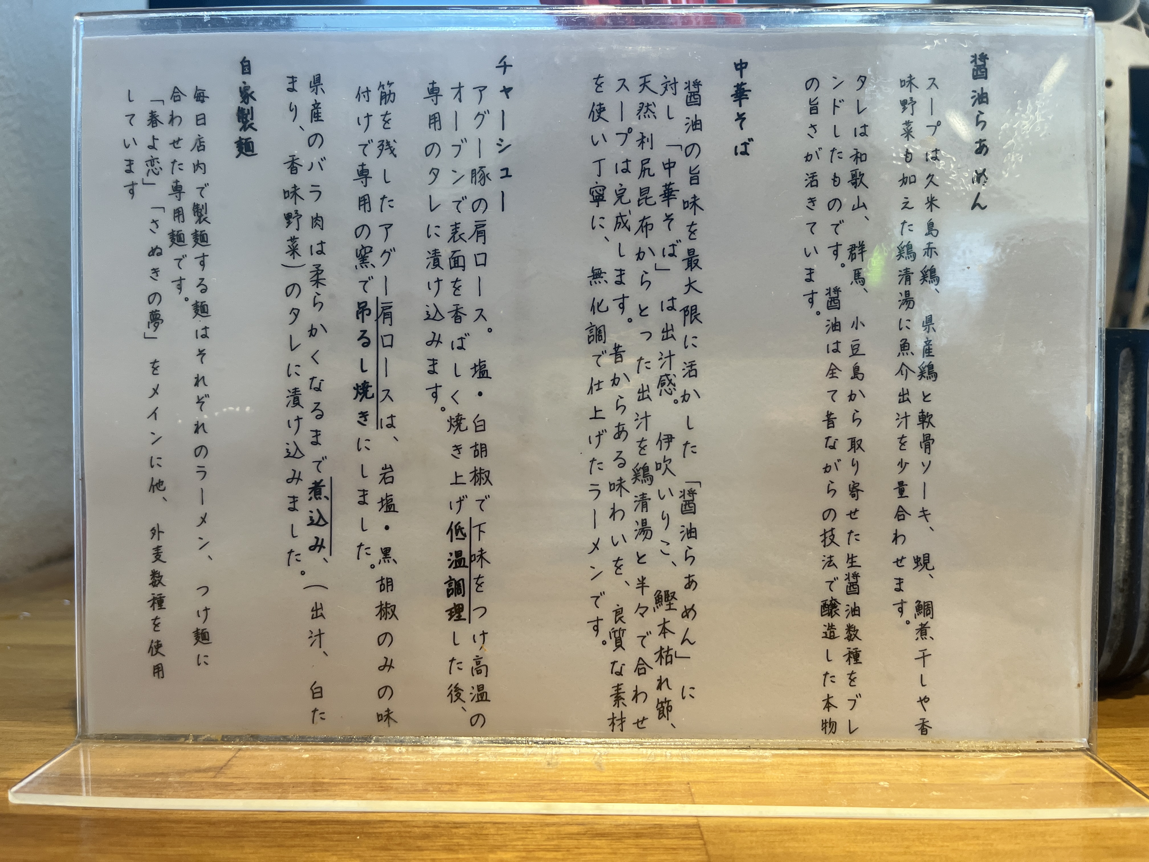 私的には、中華そばと醤油ラーメンは同一の物と認識していたのですが、こちらの店では、メニューに両方あります。説明書きを見ると、醤油ラーメンは、濃口醤油らぁめん。中華そばは、淡口醤油ラーメンとなってます。他、出汁について細かく記載されてますので、ぜひ、ご参考に。