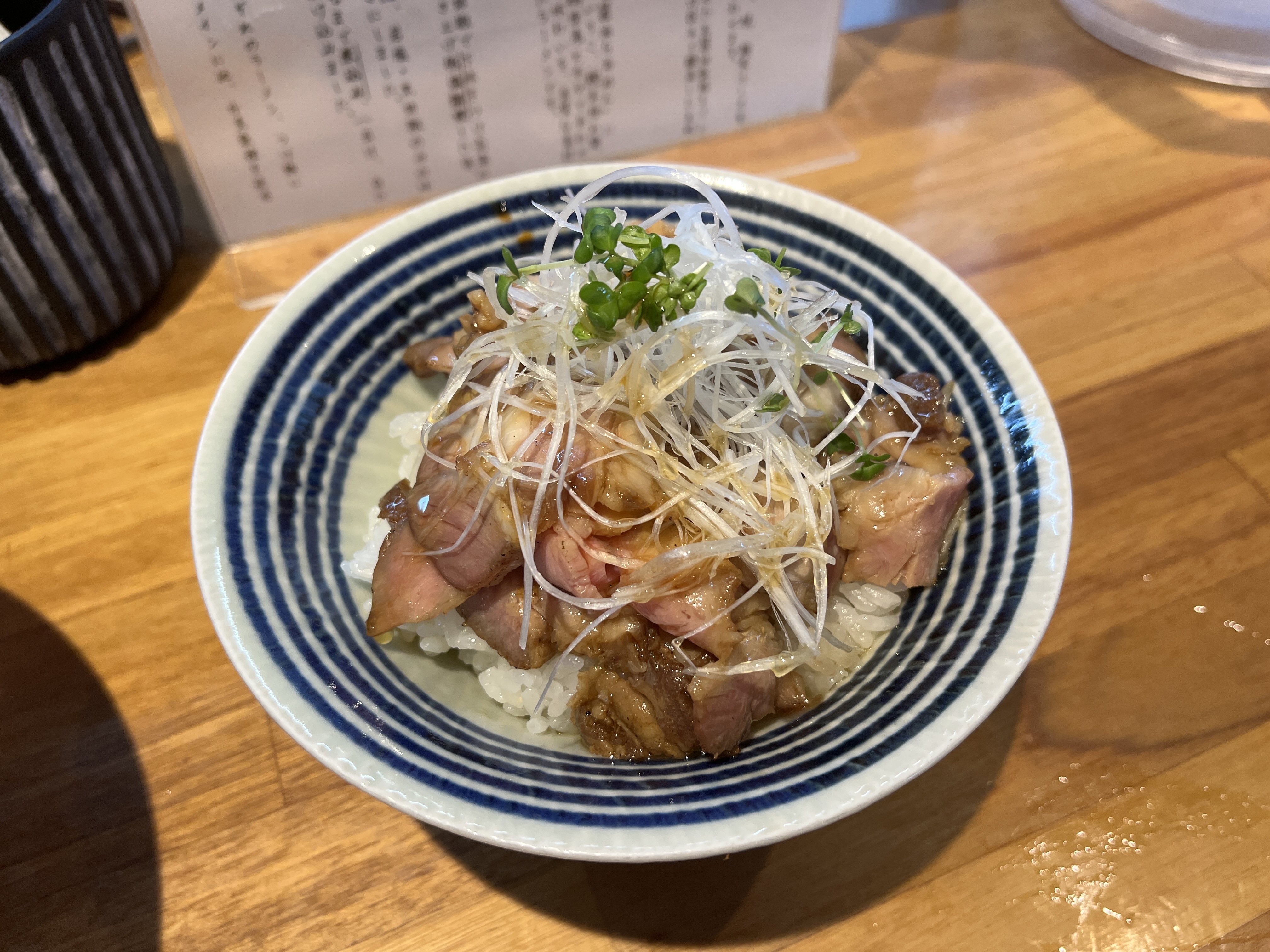 薄いチャーシューがてんこ盛りになっていて、白髪ネギが添えられて、完璧ですよね。見た目どおり、もちろん美味い。チャーシューは、結構、味濃いめで、更に炙りの香ばしさもある。単品でも勝負できる味ですね。ただ、ラーメンのサイドで飯物として頼むとしたら、ちょっとお高めですね。