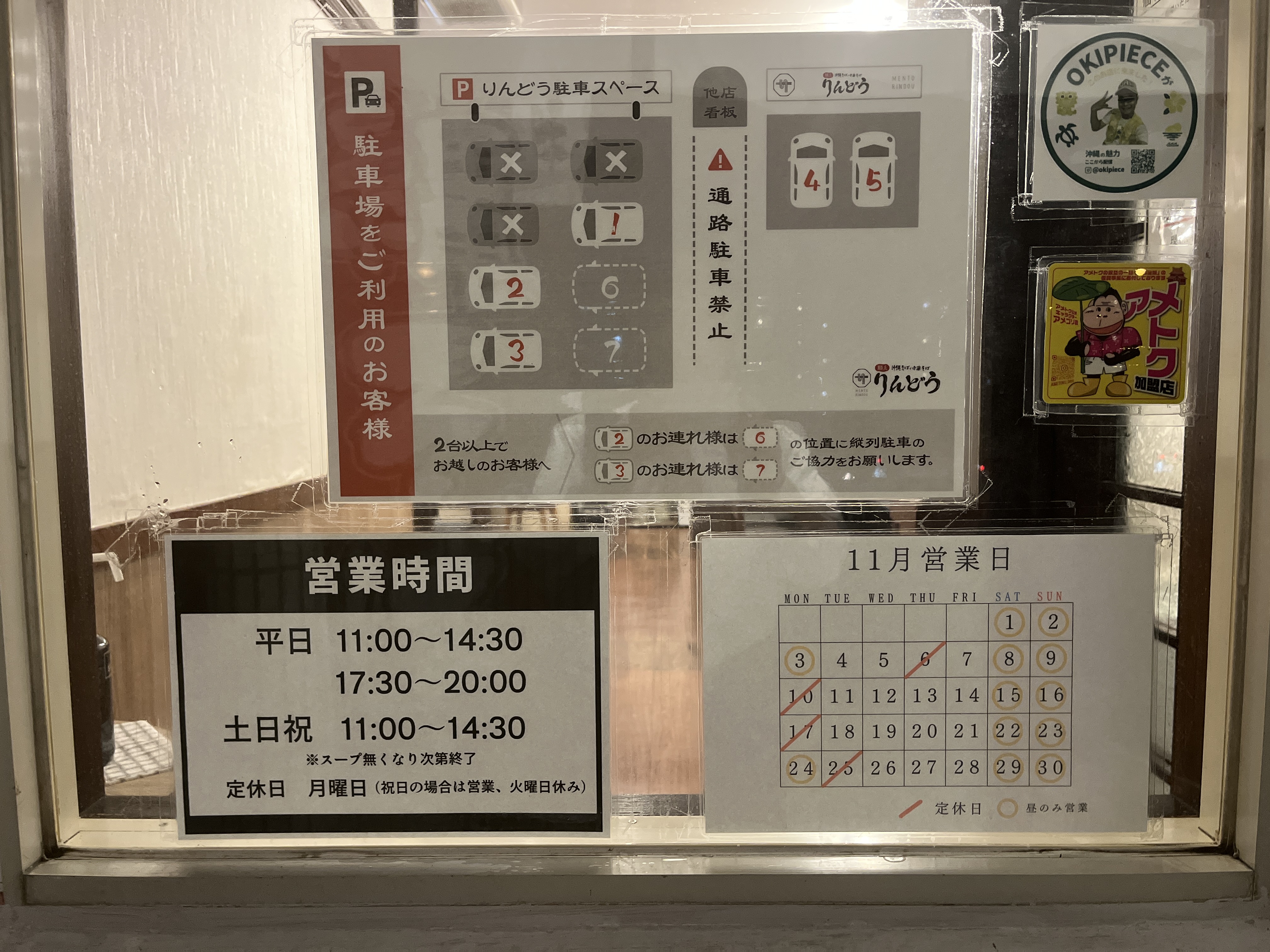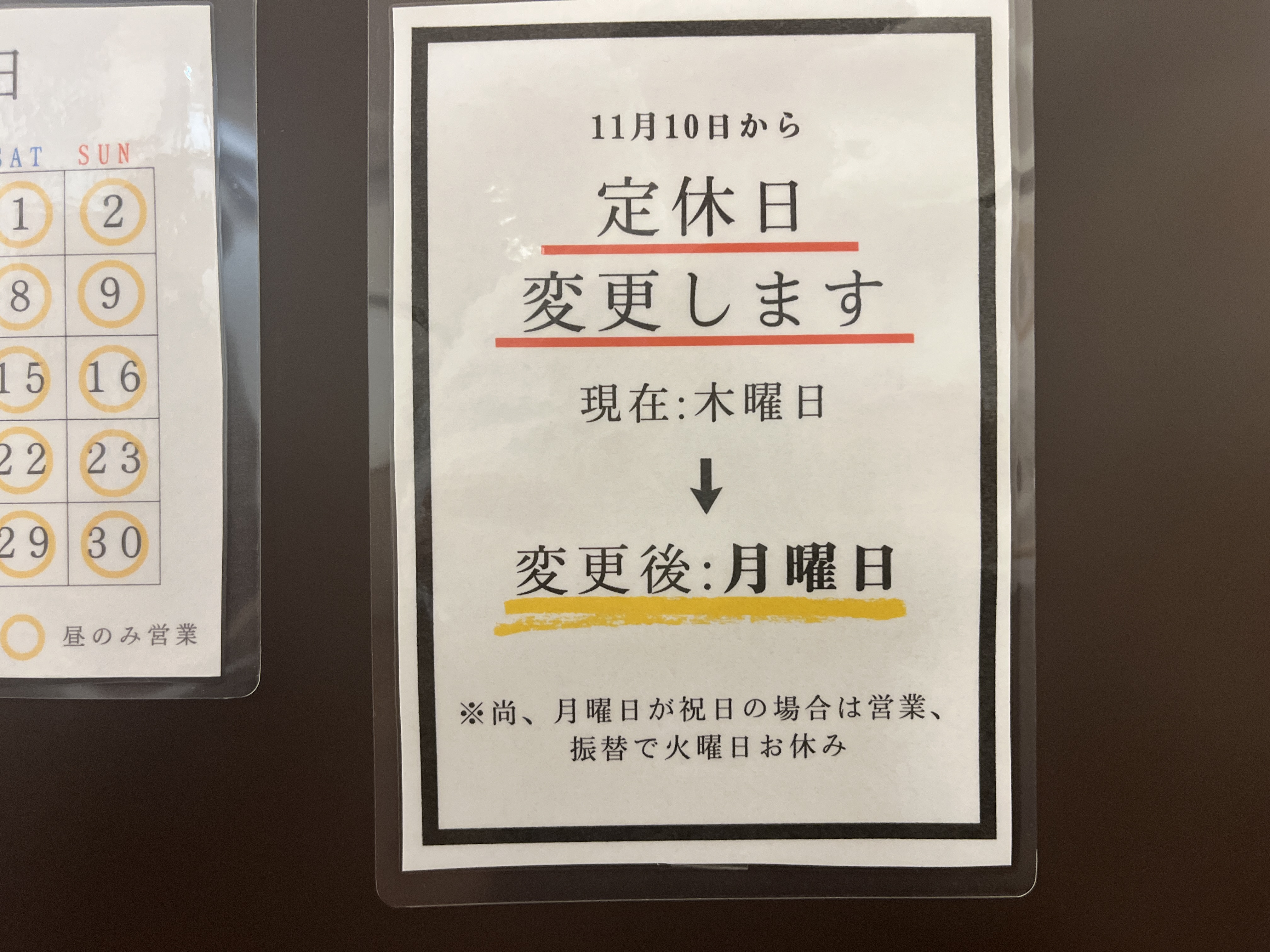 駐車場の案内、営業時間の案内、そして、定休日が、木曜日→月曜日になってます。あ、因みに夜営業は平日のみです。