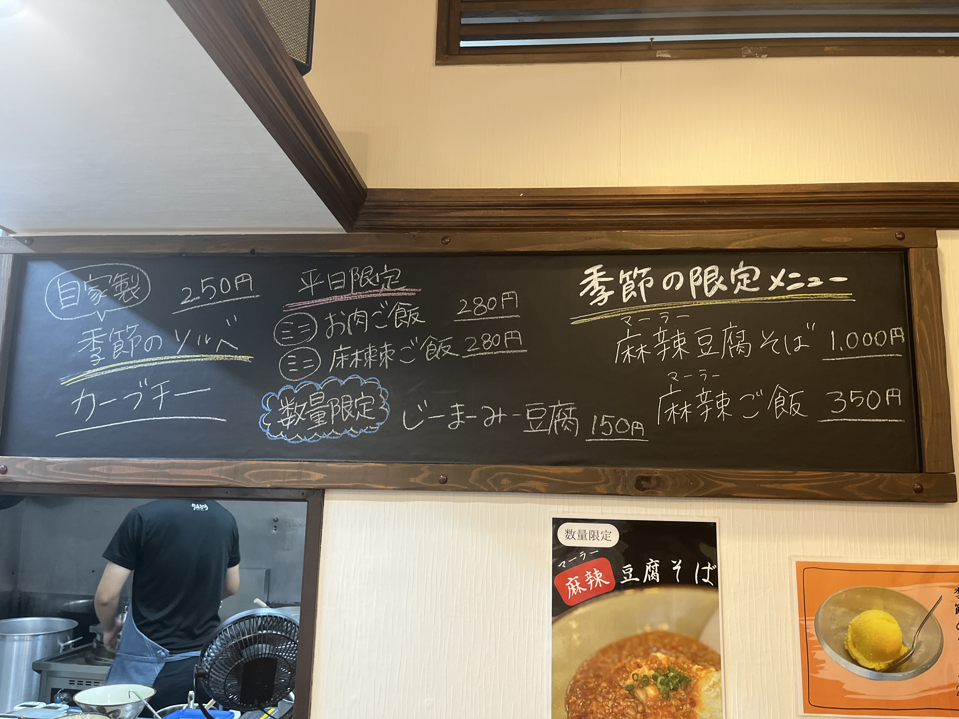 キッチン前の黒板には季節の限定メニューもあります!コレはメニュー表に載ってないので、訪問時は要チェックです!しかも、平日限定で、ミニお肉ご飯と、ミニ麻辣ご飯だって!そして今日は木曜日で平日です!