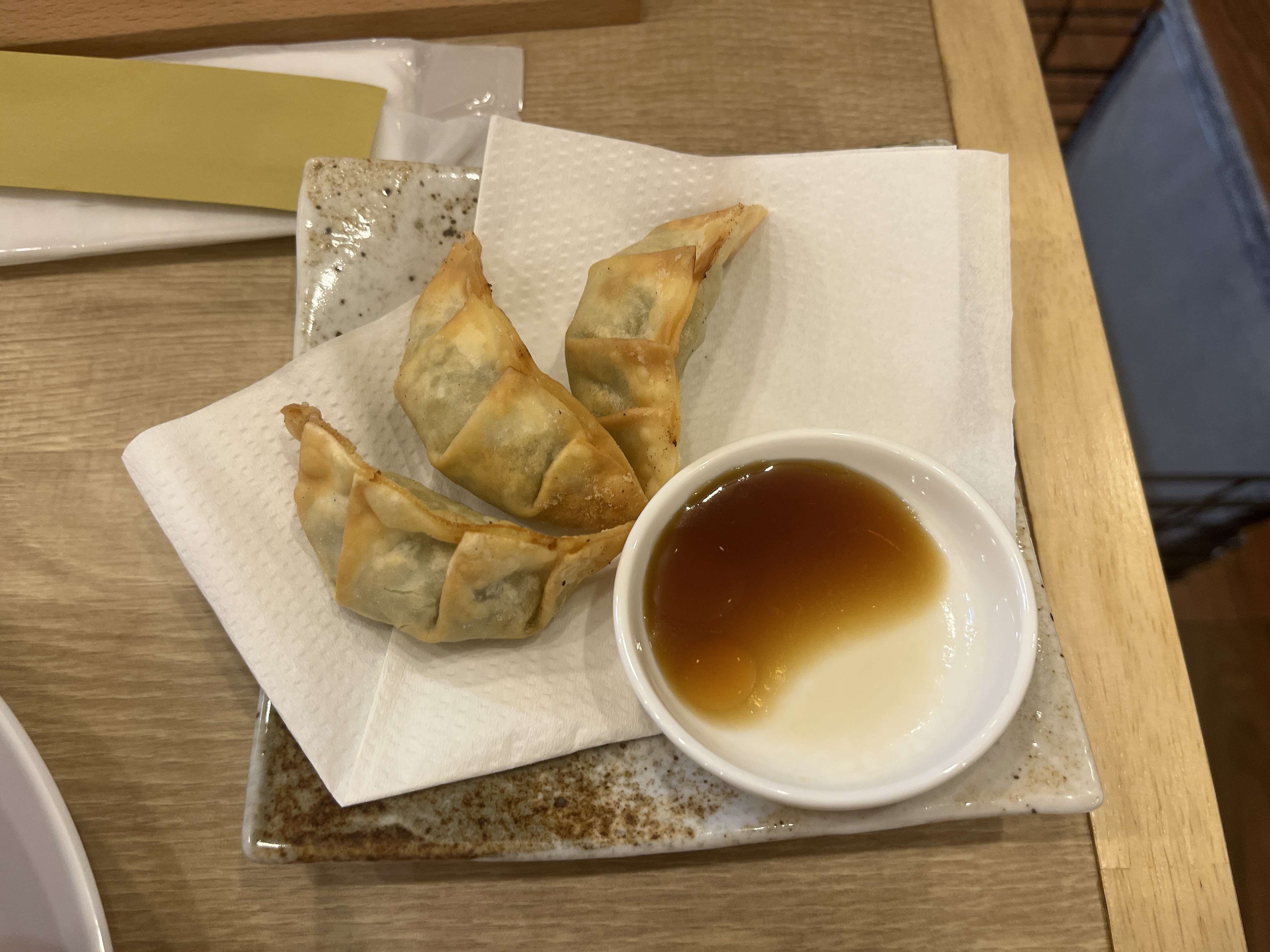 ラーメン屋さんで、焼き餃子じゃなくて、揚げ餃子です。ちょっと珍しいね。コレは、ニンニク無しかな?少なめかな。すごくあっさりしてます。中華屋の焼き餃子を想像して食べると、かなり物足りないかも。でも、デートでも食べれる餃子かな。(たぶん)食べても口が臭くない