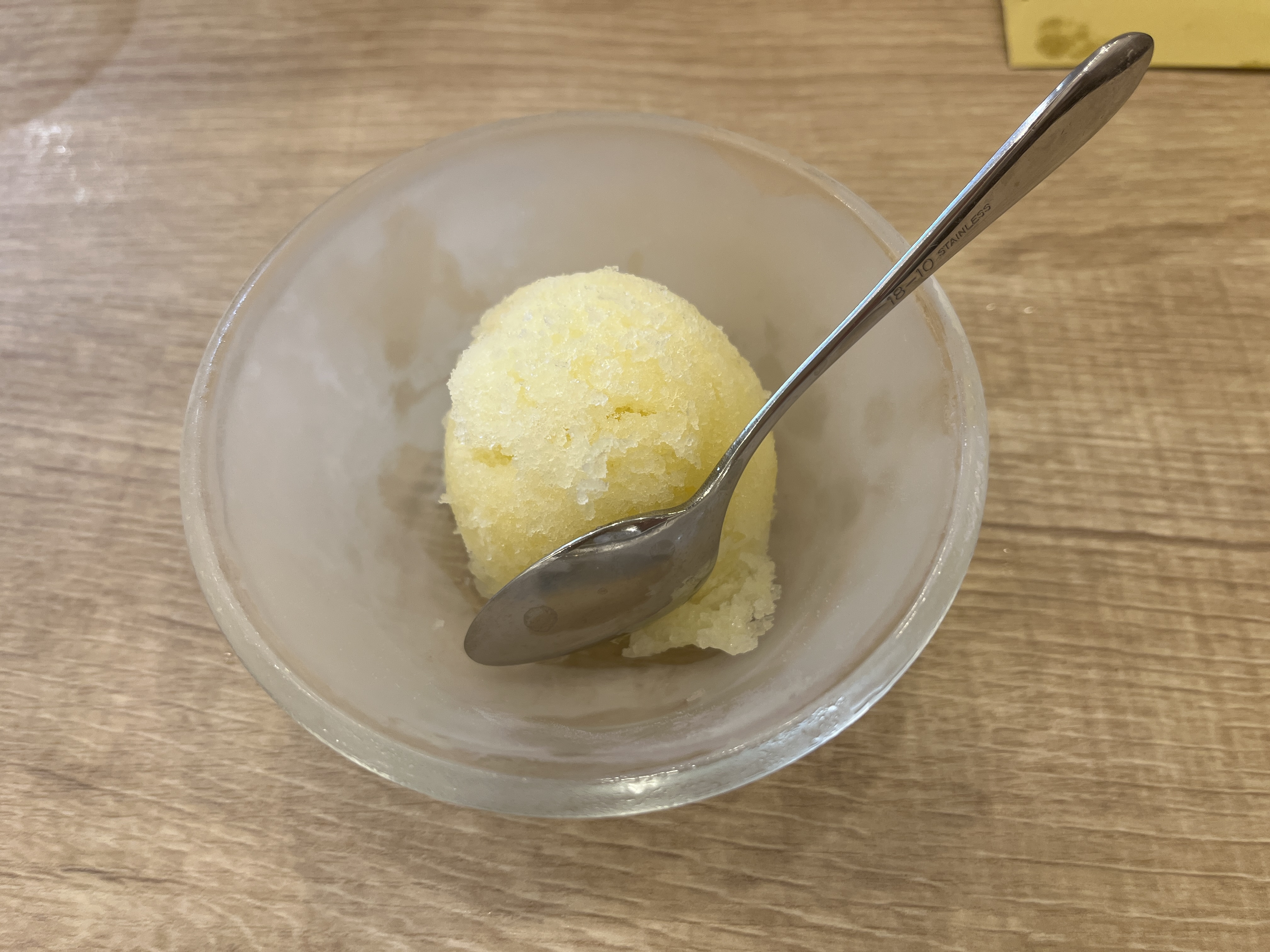 すごく爽やかです。そしてシャリシャリ食感。コレは夏に食べたいヤツですね。サイズはかなり小さいので、ホントに食後の口直しって感じです。やっぱ自家製だけあって素材の味がメインですね。人工的な甘さがなくて、お子ちゃまには物足りない甘さ控えめ。大人向けのスイーツかな。