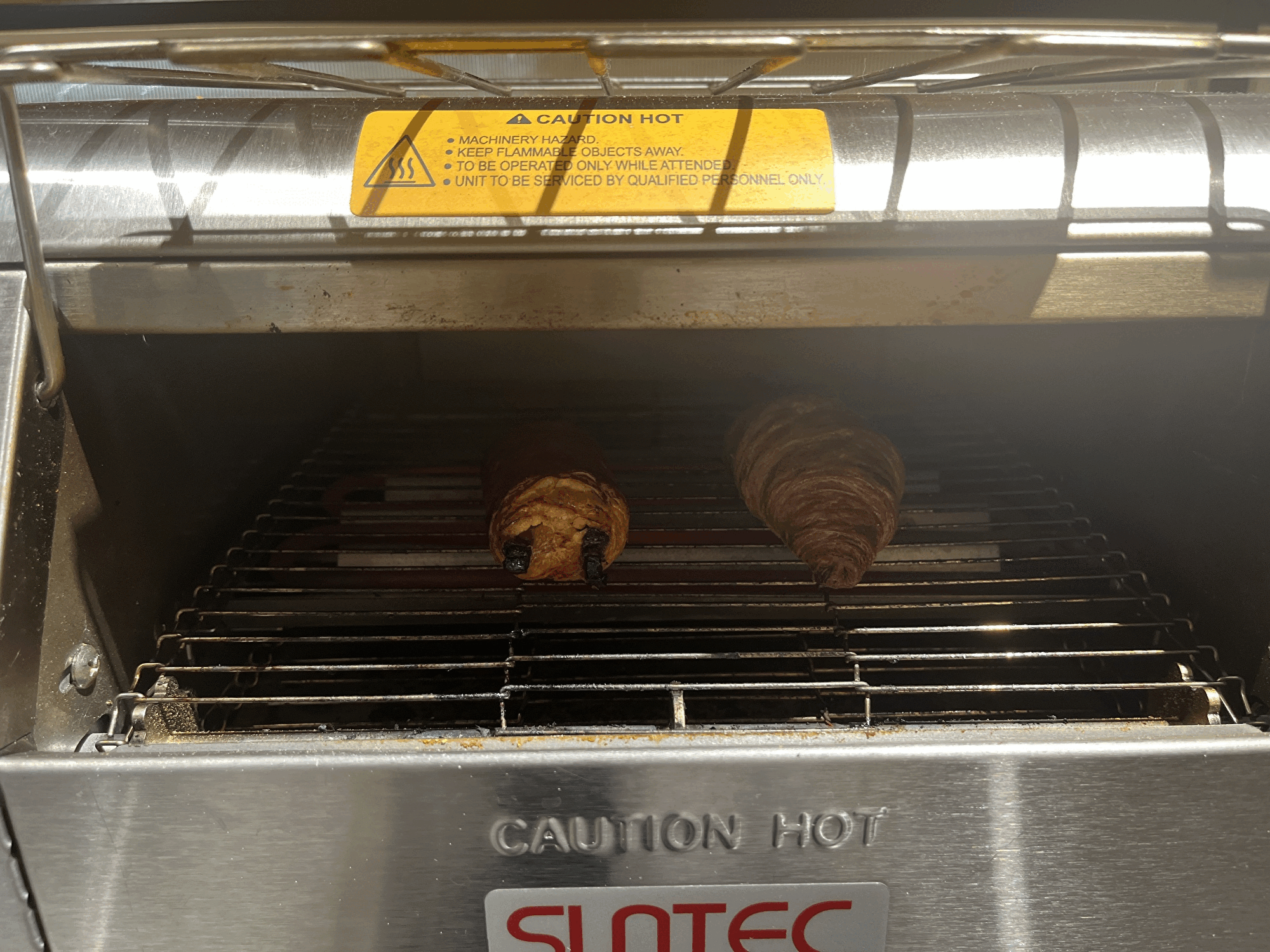 コイツは優秀!ベルトコンベアー的な所にパンを置くと、ゆっくりと奥に運ばれて、一番奥まで行くと、ストン!って、落ちて、出来上がり!