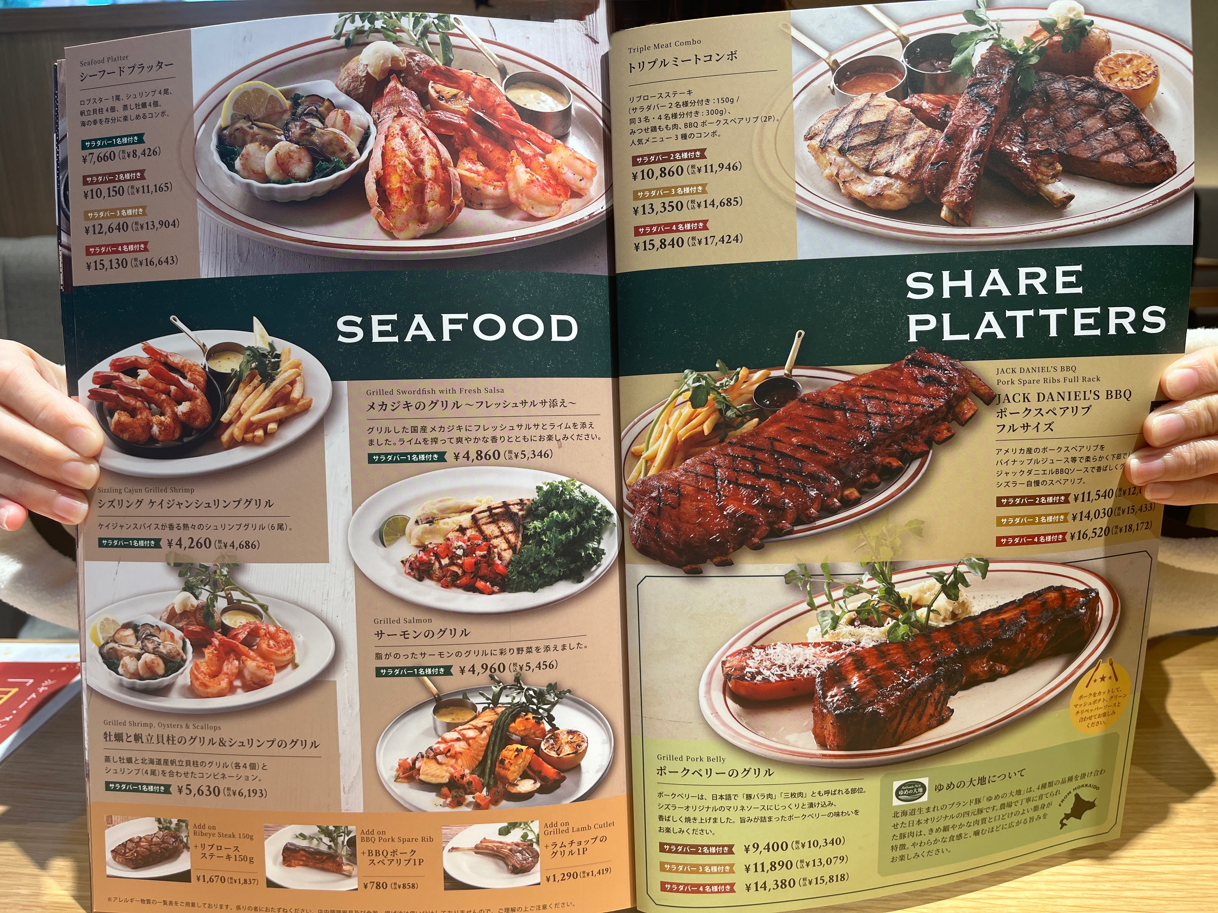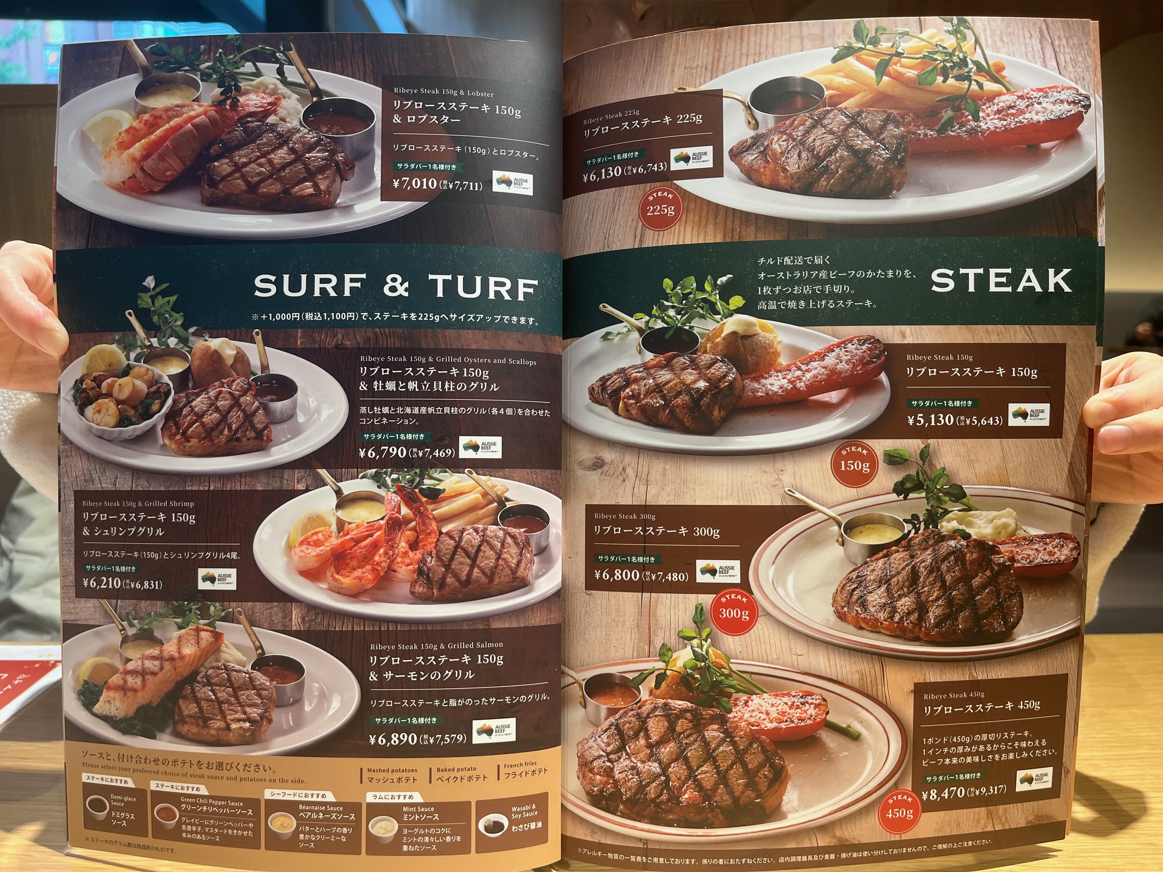 この中で一番安いのが、リブロースステーキ(150g) 税込み5,643円ですね。コレでサラダバー付けたら、、、1万弱?ファミレスで、この値段はヤバすぎでしょ!って、思ったら、これらメインメニューは基本、サラダバーが付いてます。(ちょっとだけ安心)