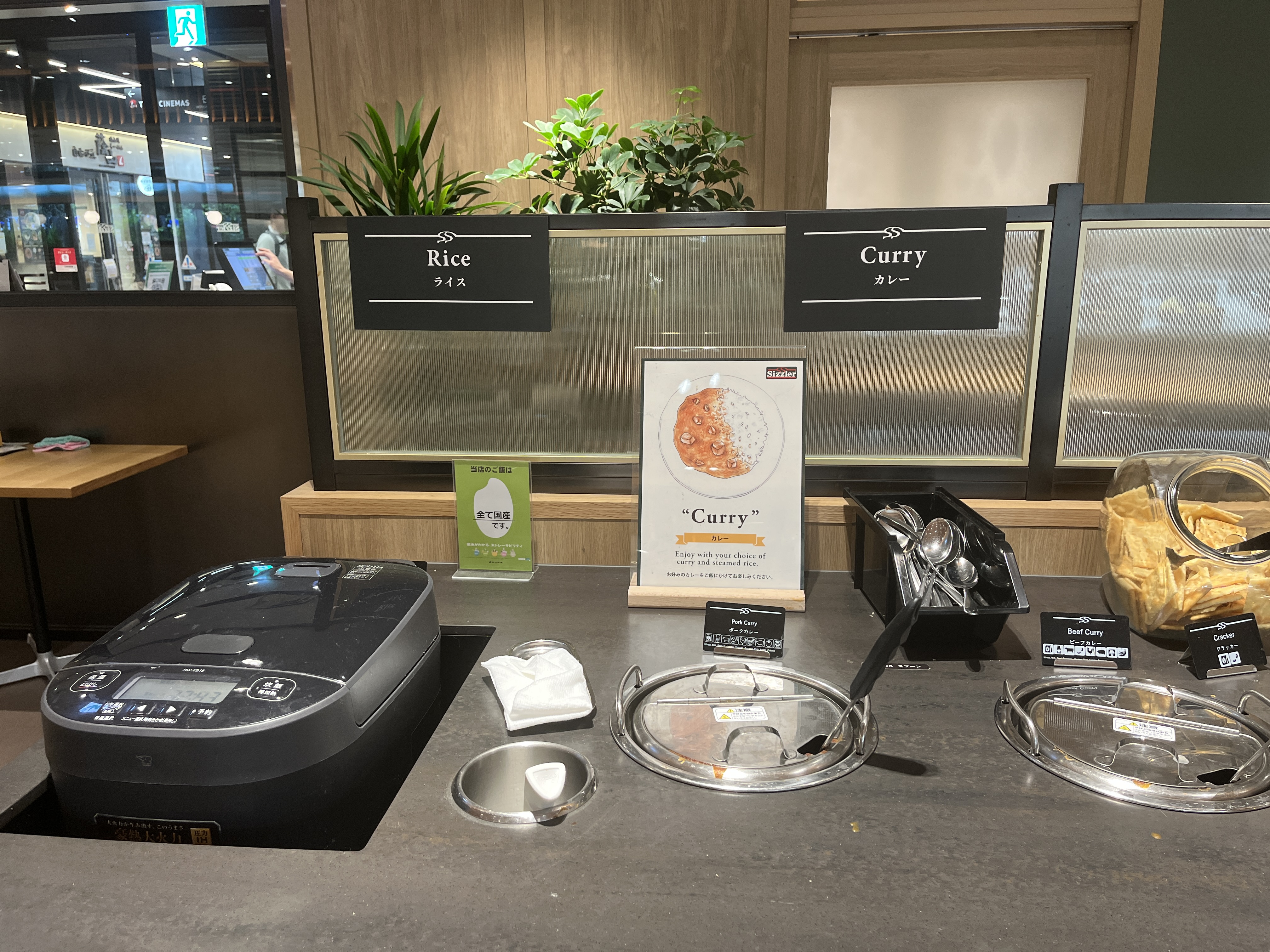 ふと横を見るとカレーがありますね。しかもビーフとポークの2種類!もちろんライスも完備!