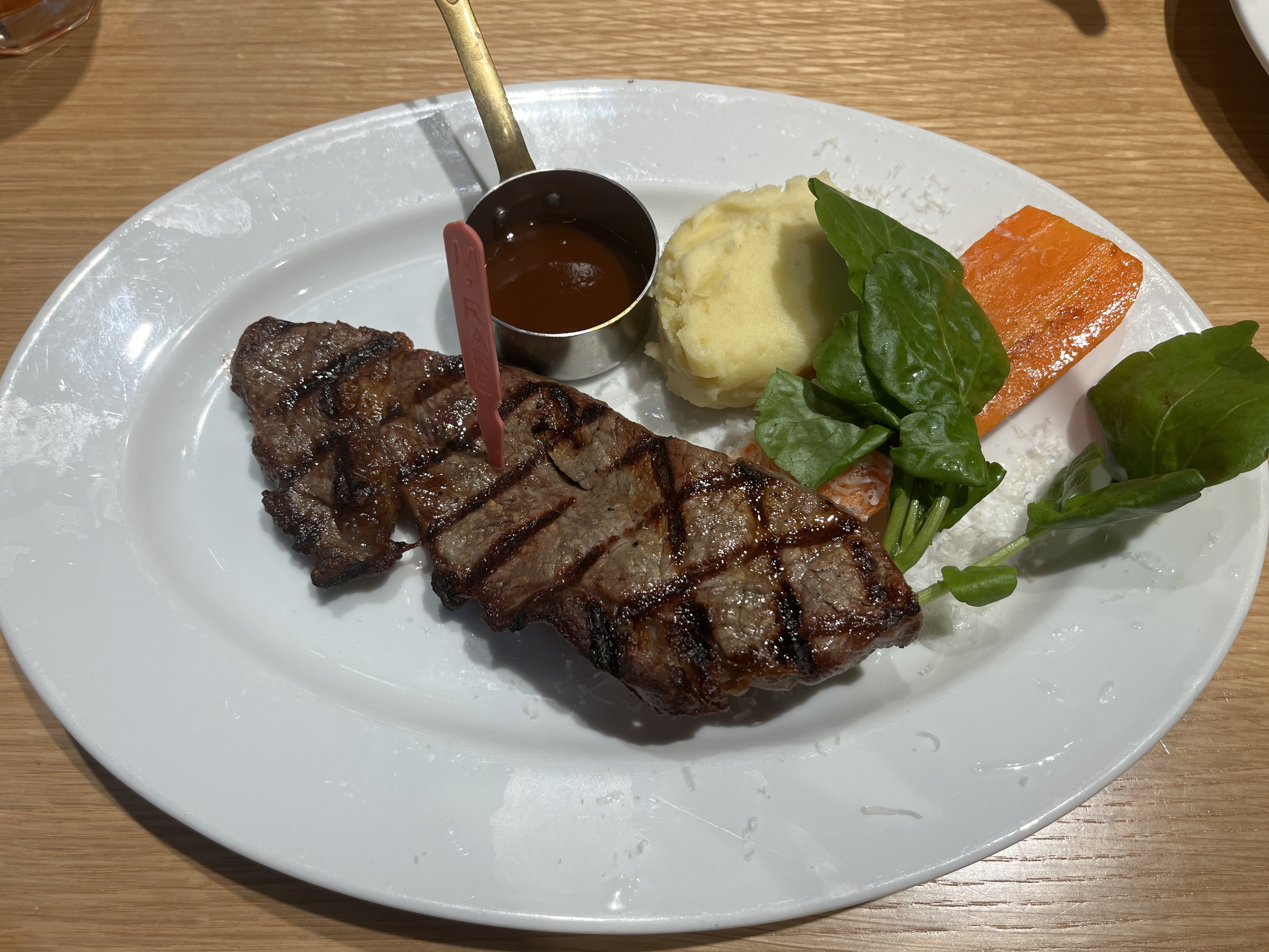 セットでサラダバー付きなので、もちろん、ライス、スープも食べ放題です。まずは、ステーキですが、ミディアムレアで頼んだのだが、結構、カリッカリな、ほぼウェルダン?しかも、まぁまぁ硬い。。。