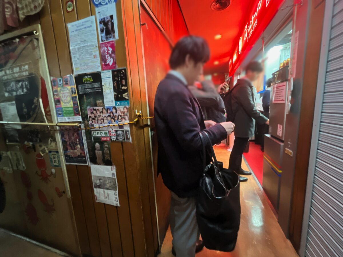 やっと店が目視できた!目の前に店が見える事で、ココからは心理的にかなり楽になる。そして、このポジションに着くと、みんな暗黙のルールで食券を買いに行きます。一旦、列を離れて前に進みます。