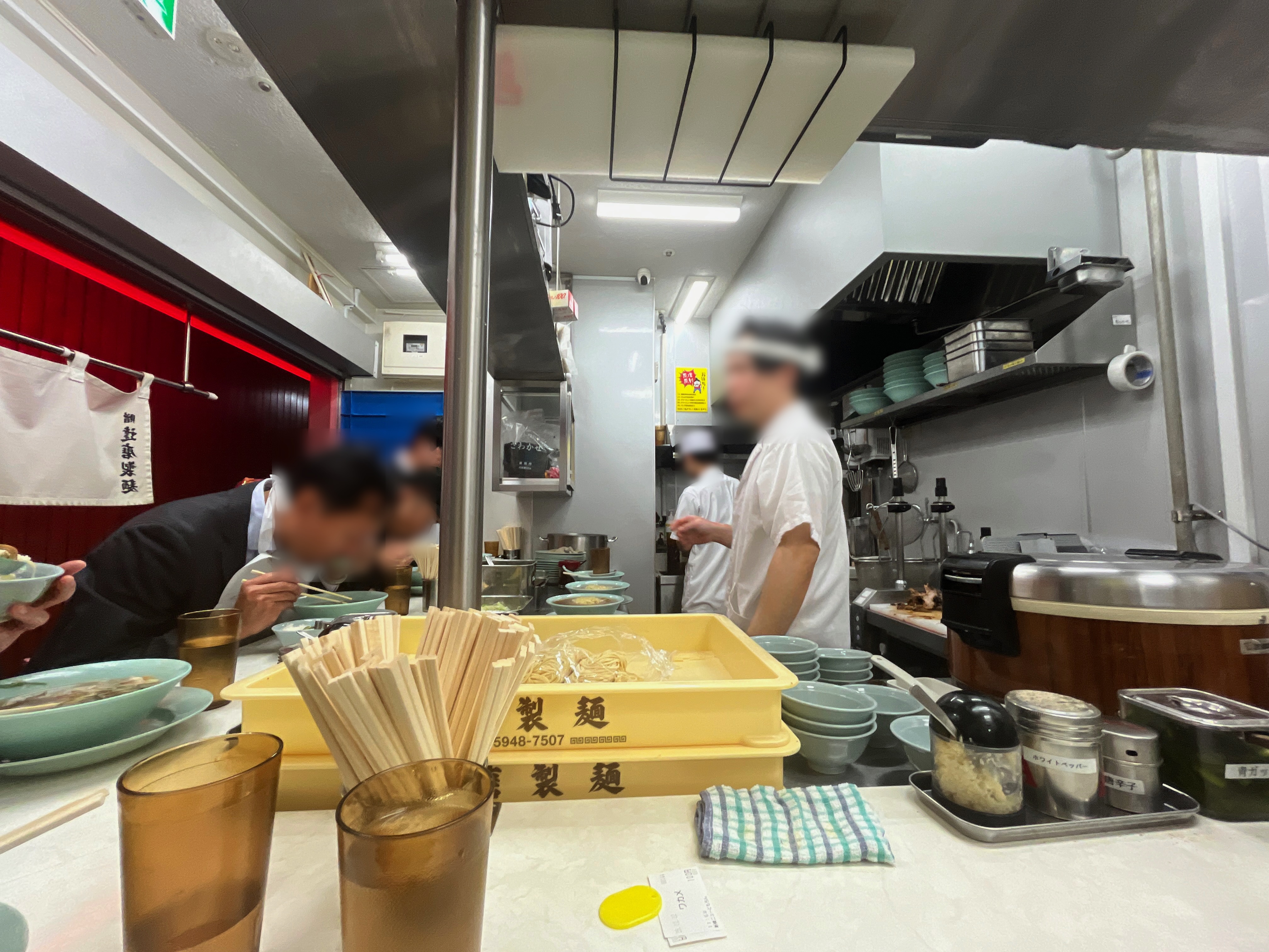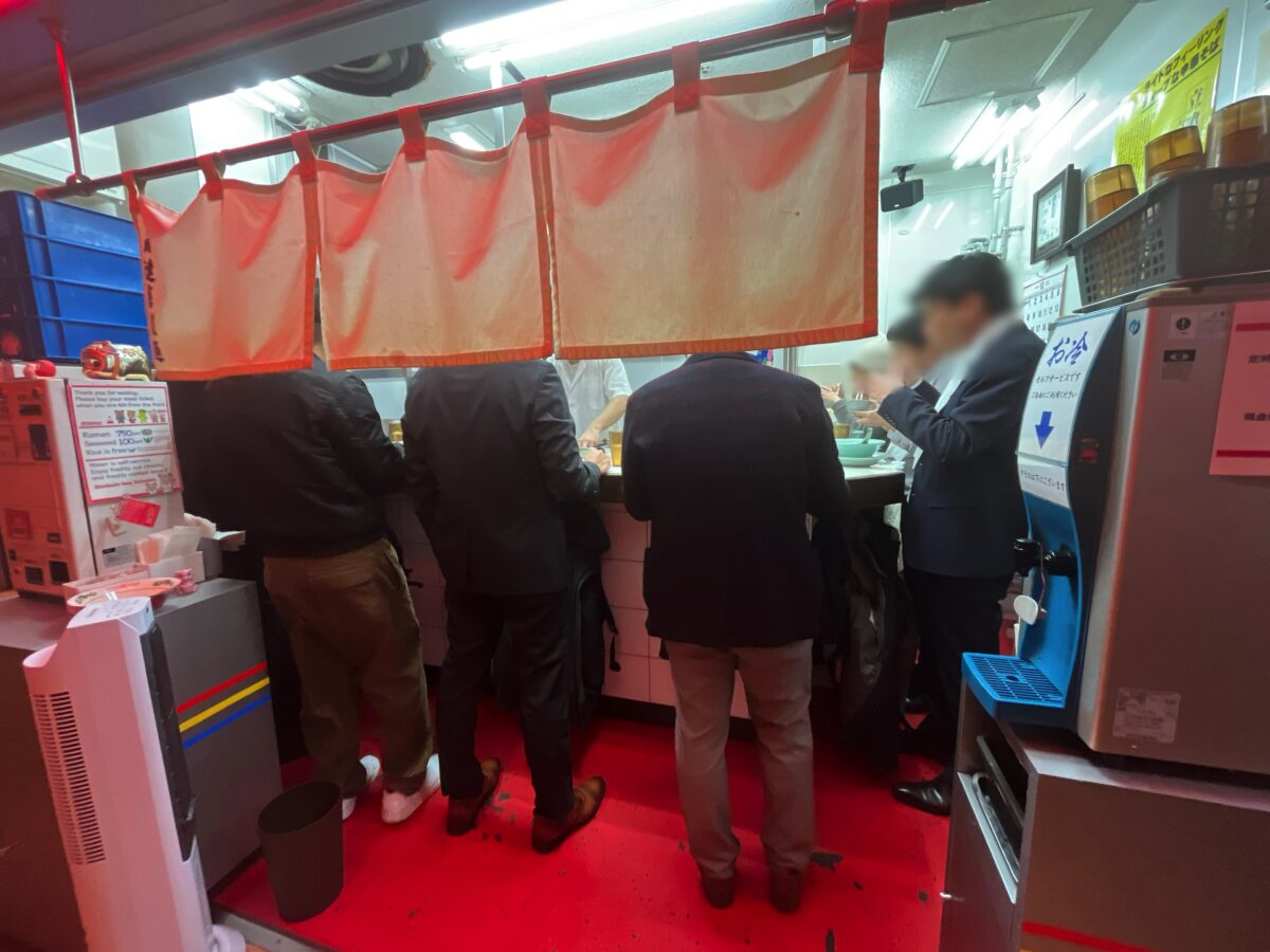 見ての通り、立食いです。L字カウンターで7名ですね。