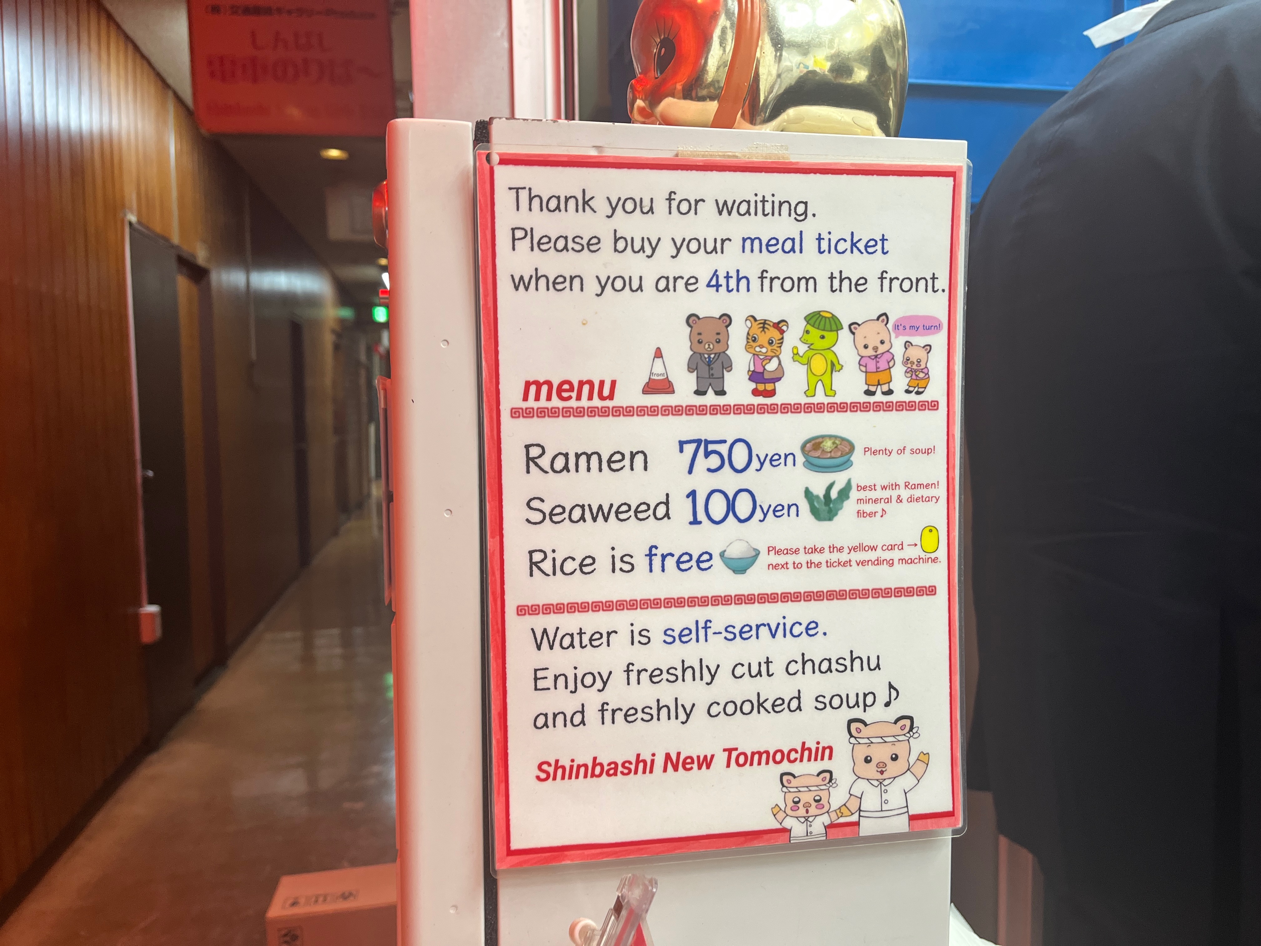 第二コーナーまで来たら暗黙のルールで食券を買うと前述しましたが、(後で気づいたら)食券機にちゃんと記載されてました!因みに説明書きは英語のみです。そして、そもそも食券機(列の先頭)まで来ないと、この説明書き読めないし。。。ってのは心の声です。
