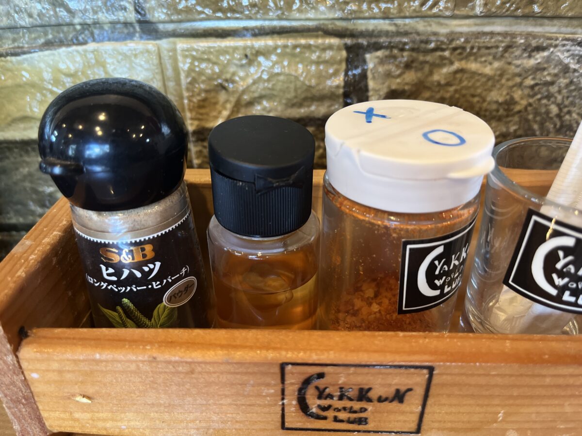 味変アイテムは、左からヒハツ、コーレーグース、七味です。ヒハツはいわゆる八重山そばで使うピパーツと同じかな?ググったけど、結局よくわからなかった。