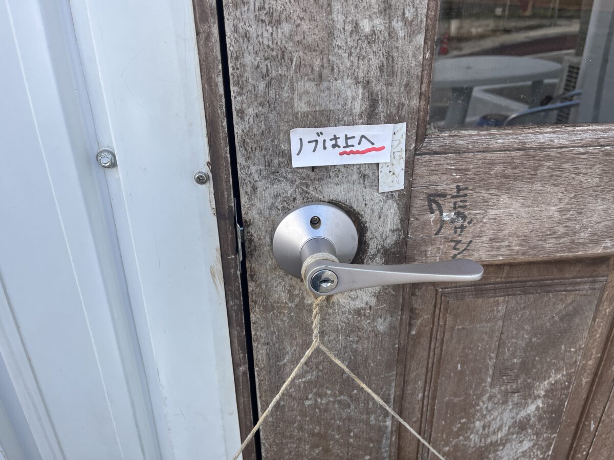 ドアノブにトラップあり!「ノブは上へ」です。