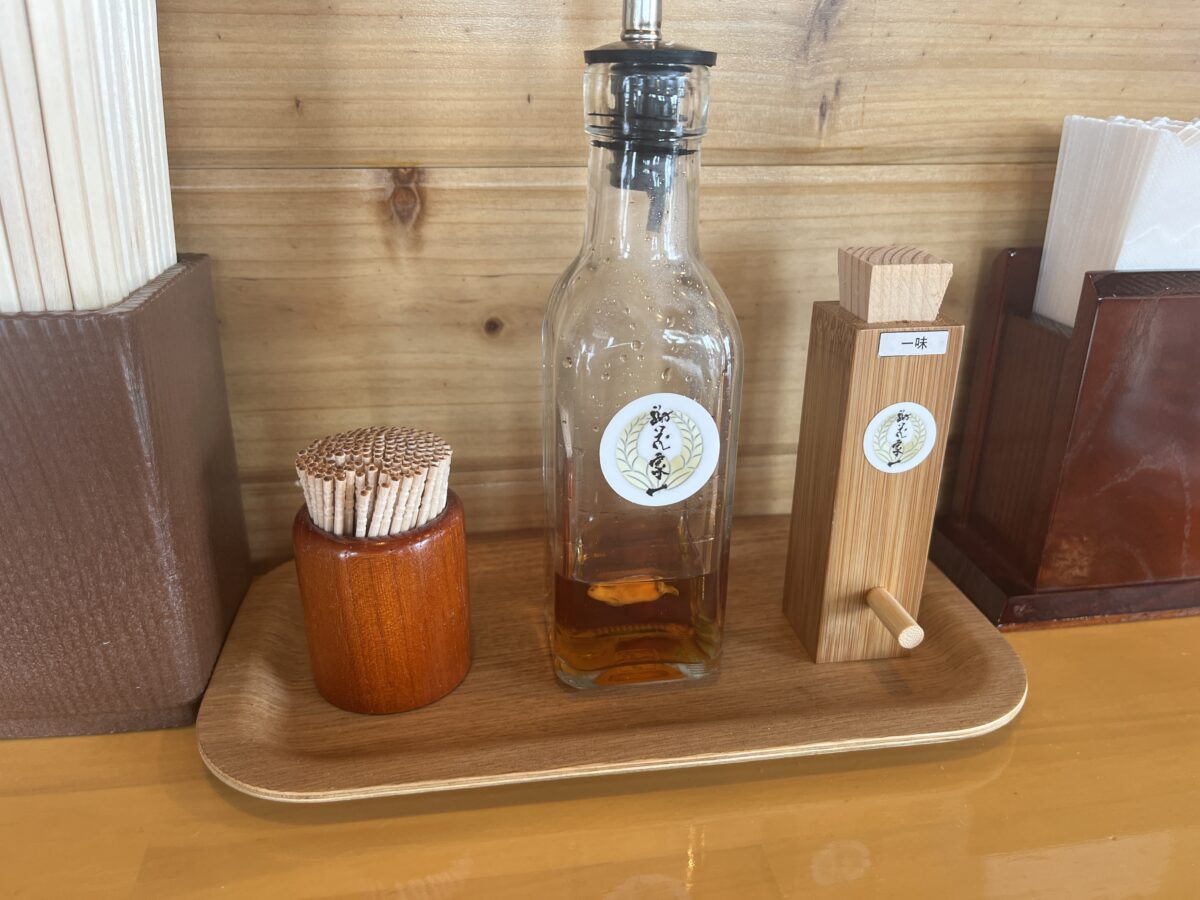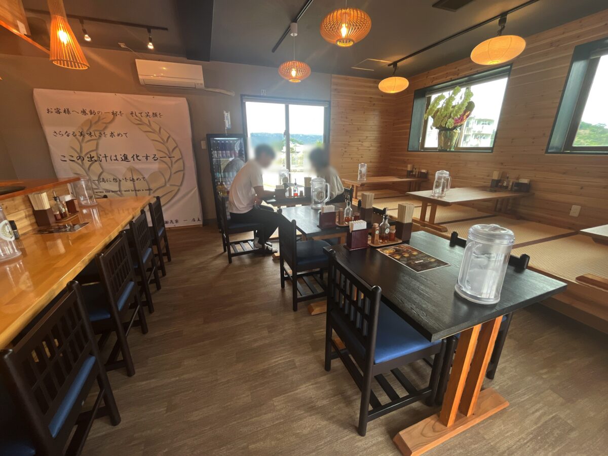 コーレーグースと一味ですね。店内は木目調で統一感があって、和風で落ち着いた雰囲気。ただ、BGMは沖縄民謡的な賑やかな音楽だったから、個人的にはちょっとアレでした。まぁ、国内観光客とかインバウンドには、きっと受けがいいのかな。