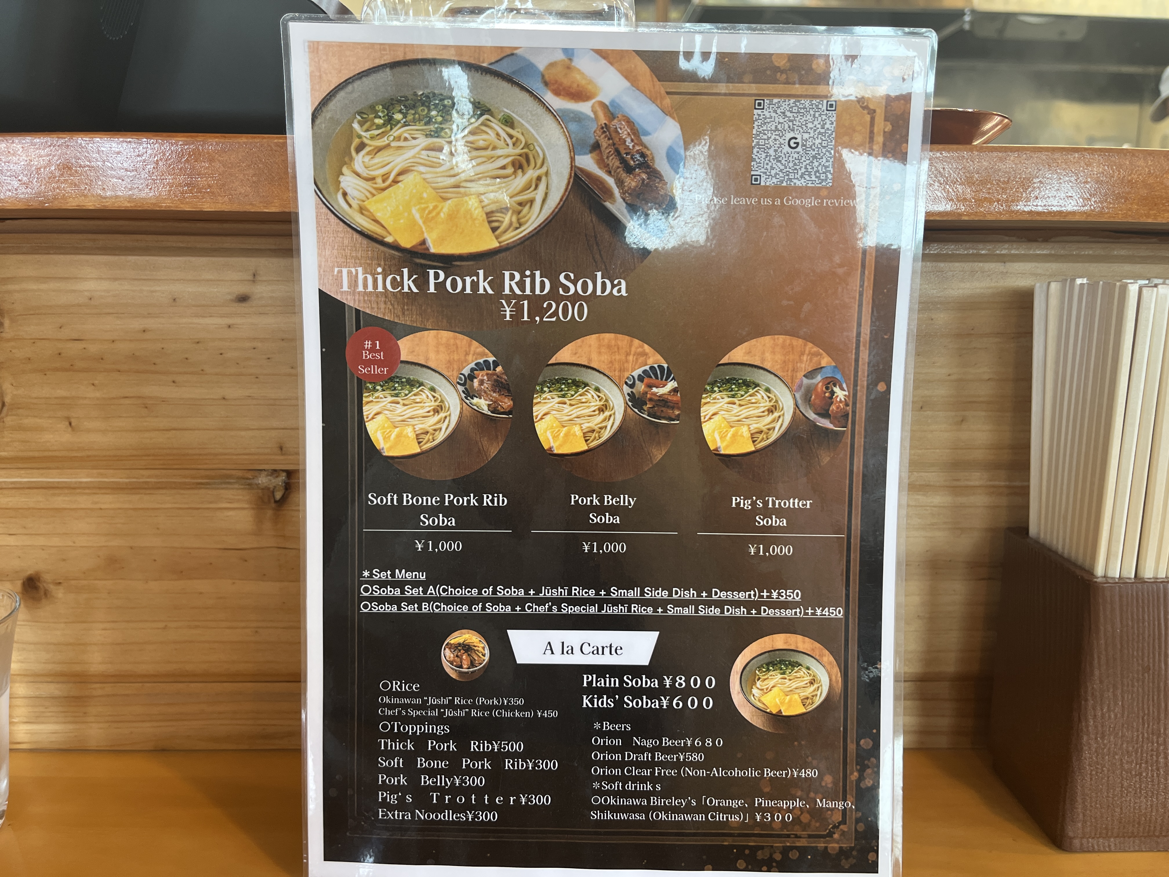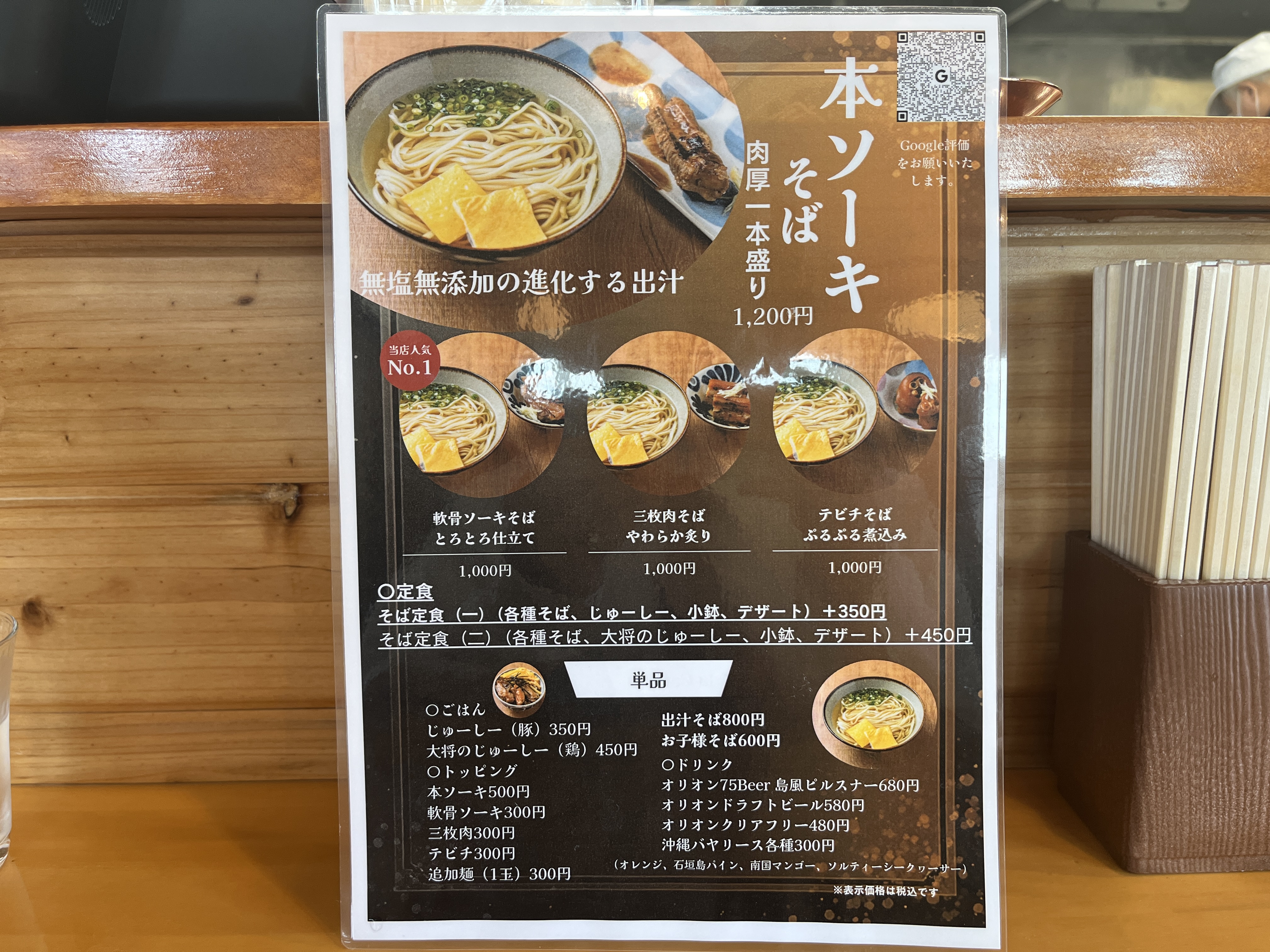 軟骨ソーキそば単品が1000円、そば定食(セット)+450円で、大将のじゅーしー、小鉢(もずく)、デザート(ゼリー)が付きます。今どきの新店なら、普通の価格帯かなぁ。