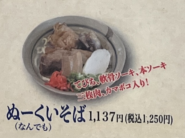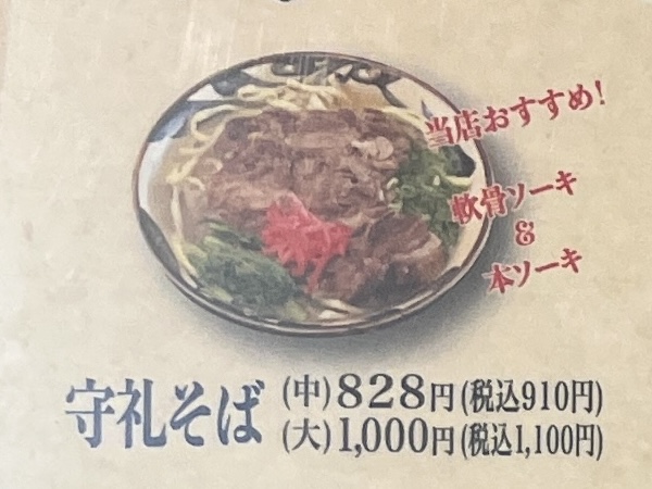 店名を冠にした守礼そば!いわゆるミックスそば(軟骨ソーキ&本ソーキ)ですね。と思ったら、なんと、ぬーくいそば(てびち、軟骨ソーキ、本ソーキ、三枚肉)を発見!まさかのトラップ!メニューで一番最初に見る場所(左上)にあるから、速攻で守礼そばを頼んじゃうよね!