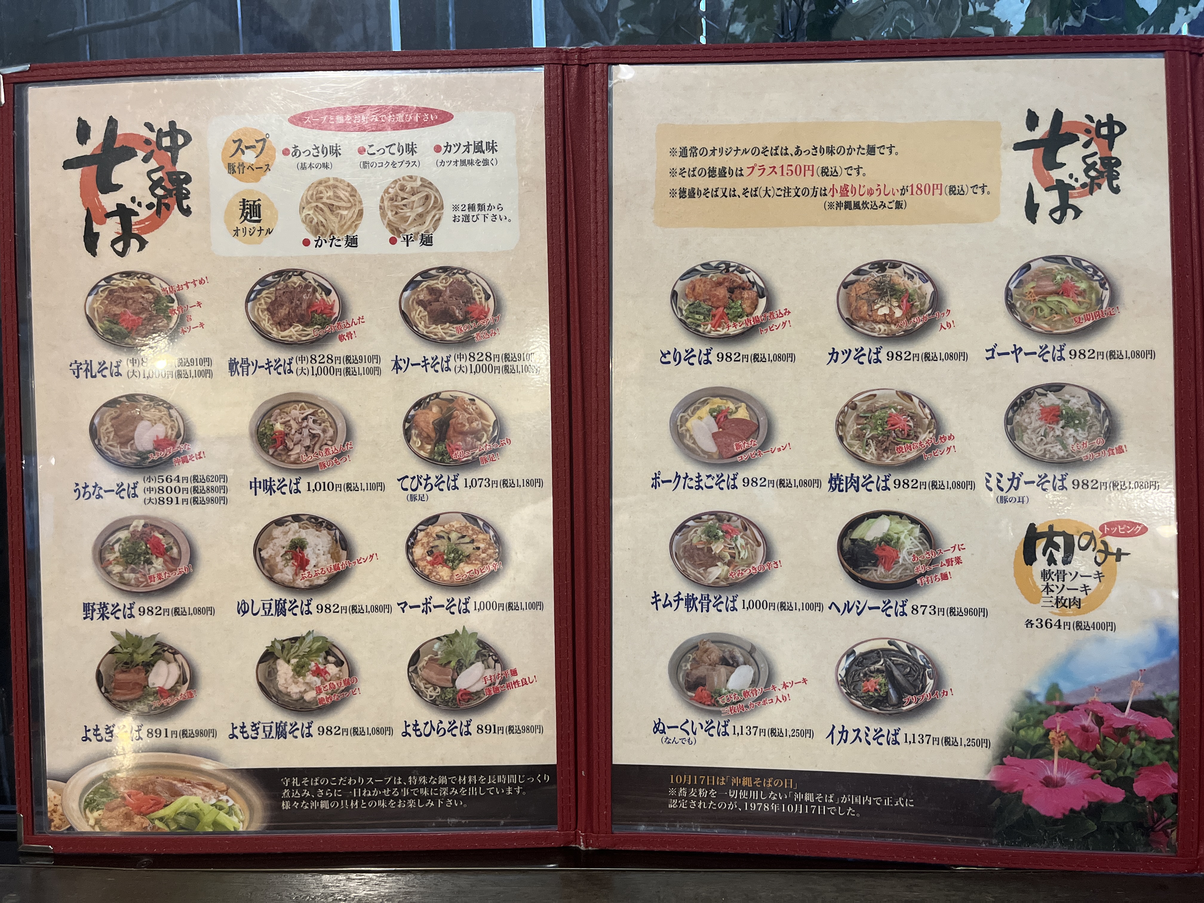 スープは基本、豚骨ベースで、あっさり or こってり または、カツオ風味から選択可能。更に麺は、かた麺 or 平麺から選べます。それにしても種類が豊富すぎる!2ページ見開きで全部沖縄そばです!