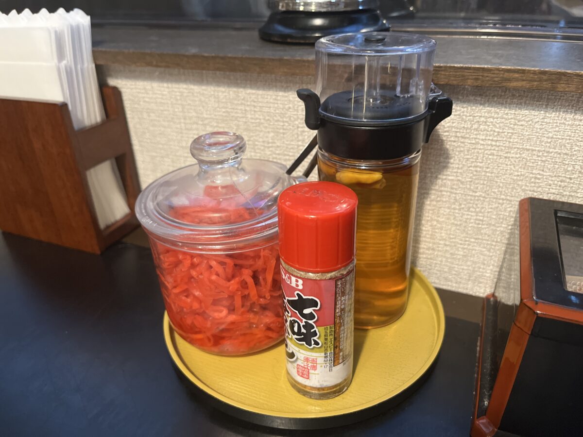 ド定番の紅しょうが、七味、コーレーグース。沖縄そば屋、三種の神器ですね。赤いやつ