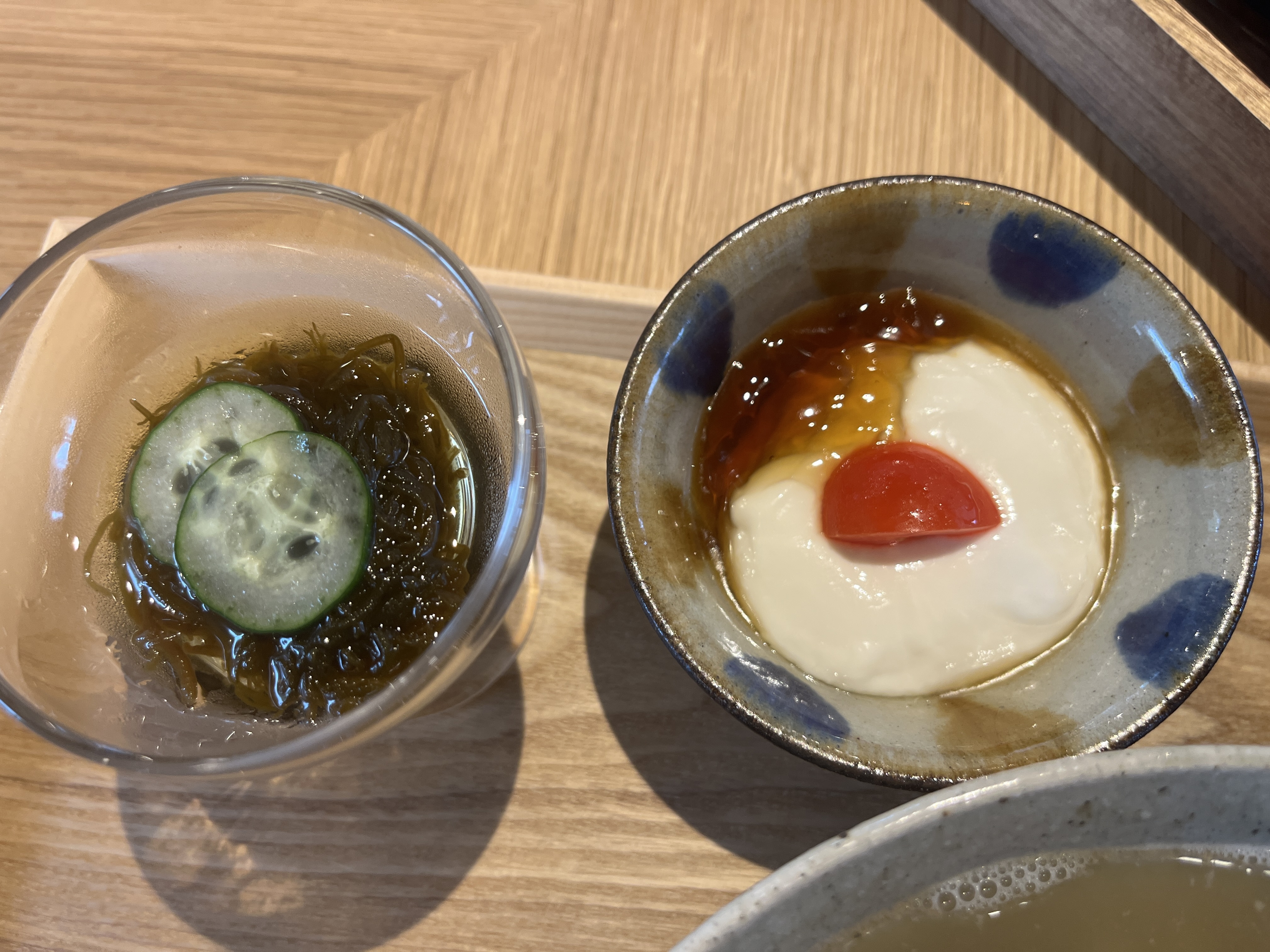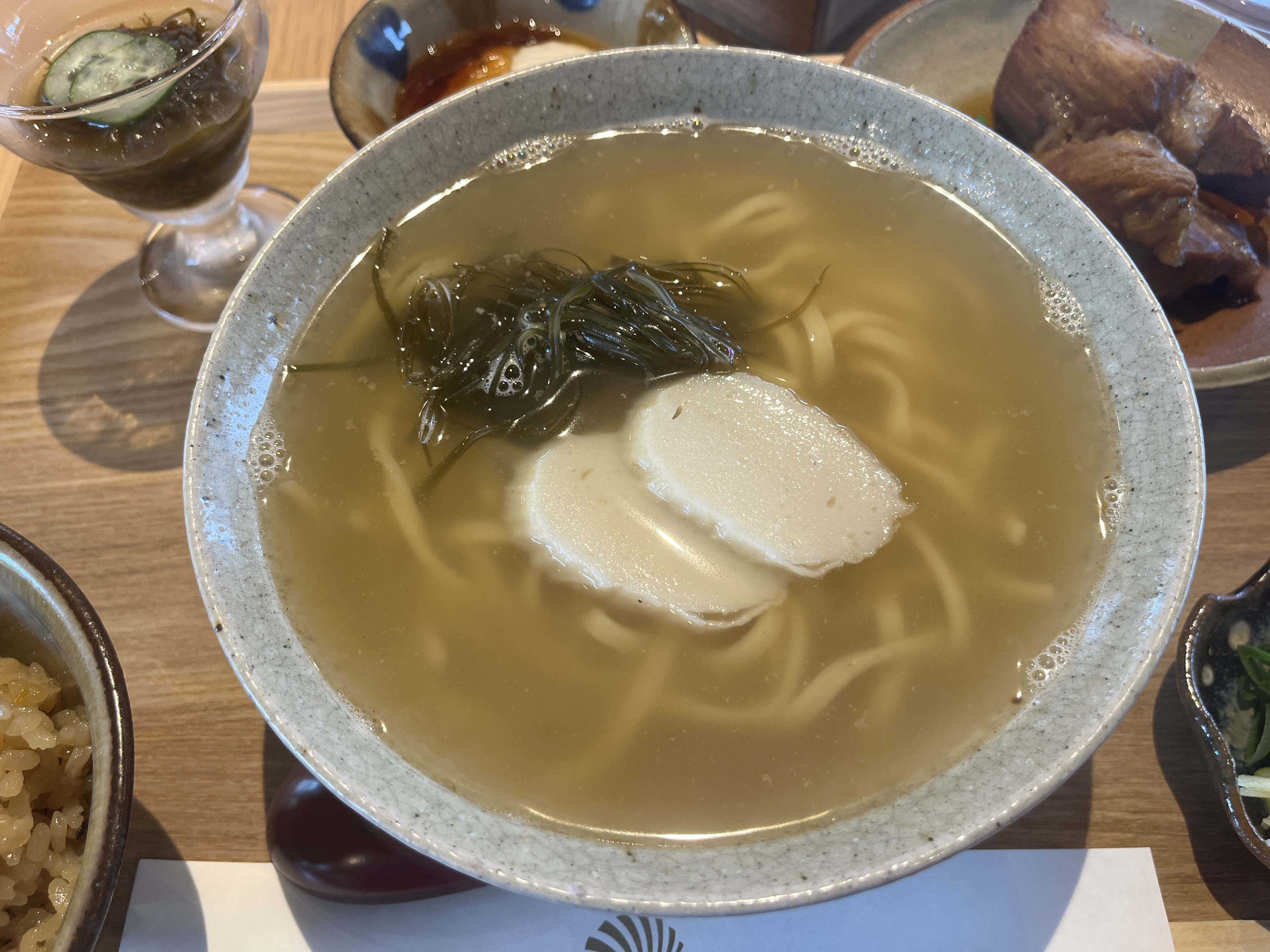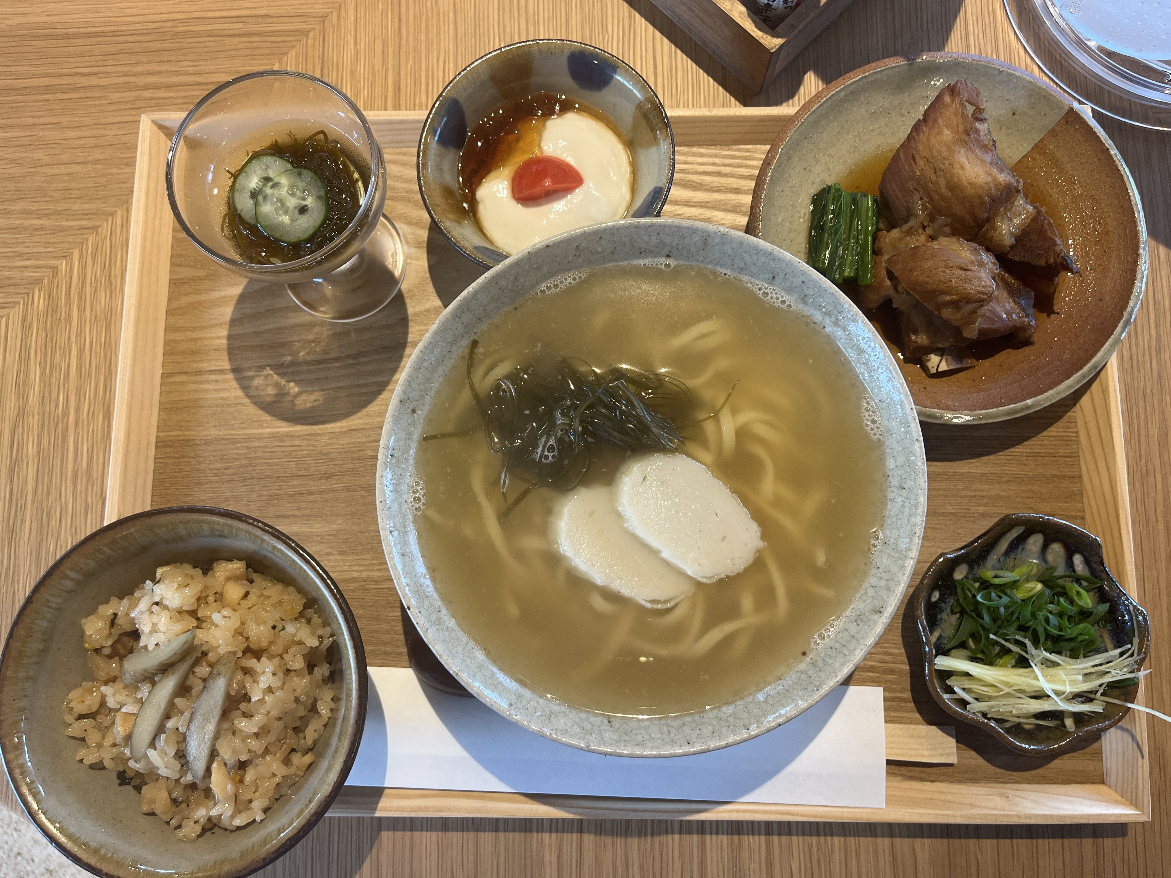 沖縄そば、ソーキ別皿、ネギ/しょうが別皿、もずく、ジーマーミ豆腐のセットです。今どき、高い店だと沖縄そば単品で1500〜1600円もありえるので、この(観光客向け)施設で、この値段だったら、全然高くない気がする。