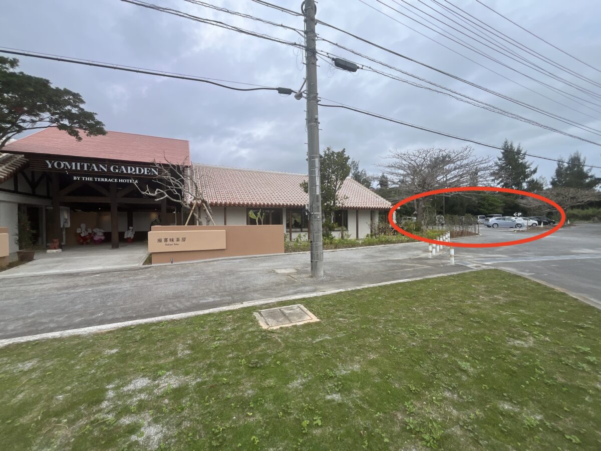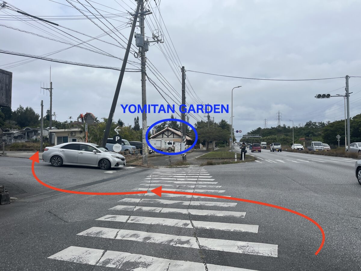 58号線を北上すると左側にYOMITAN GARDENがあるので、手前から左折して駐車場に入ります。