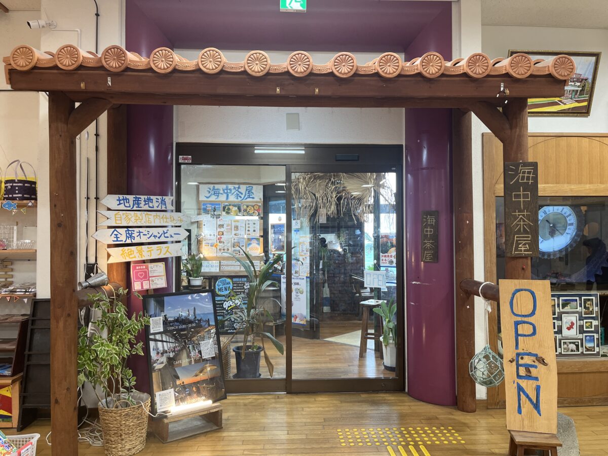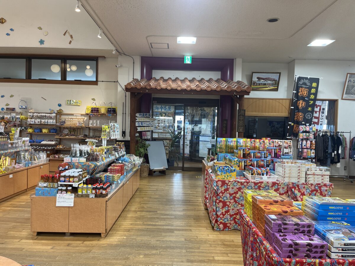 施設内に入ると、道の駅っぽく多数のお土産が陳列されてます。そして奥の方に海中茶屋の入口があります。
