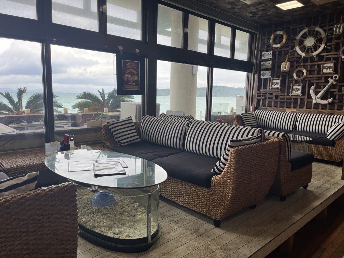 普通は窓側テーブルが人気ありそうだけど、壁側ソファ席は、正面に海が見えるし、大人数でも一つのテーブルに座れるので、いい感じにお客さんも分散してる。