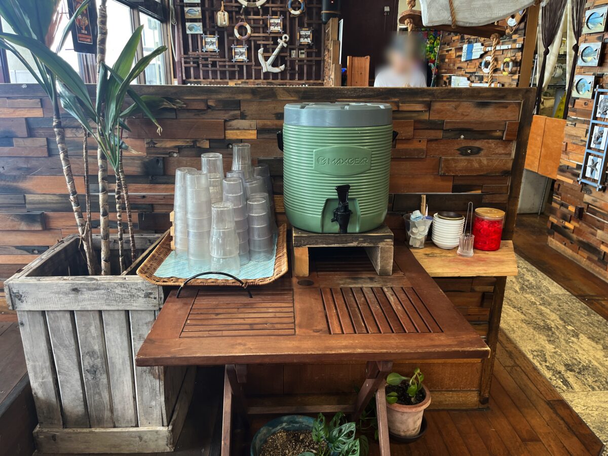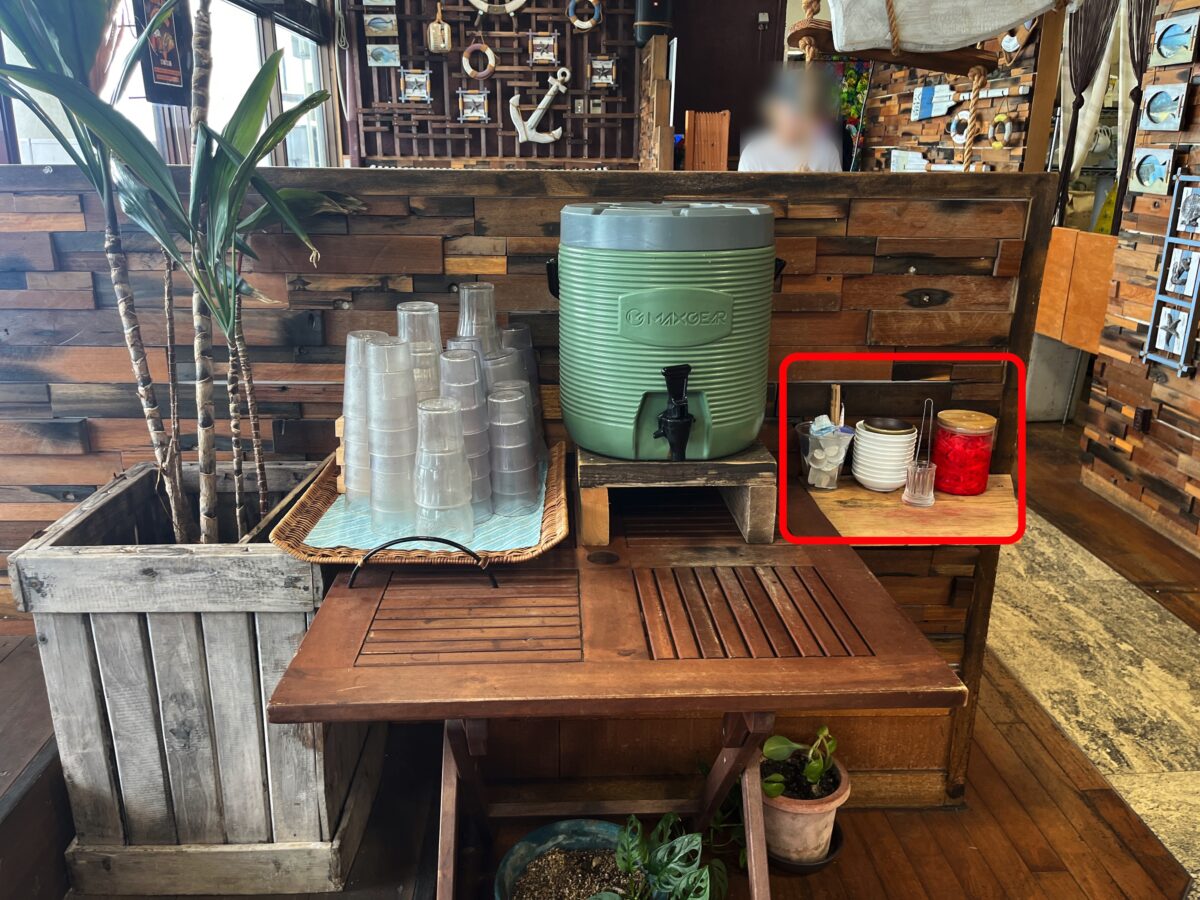 私は、たまたま近くに座ったので気づけたけど、他のお客さんは気づいてなかった。着丼後、食べる時に水が無い?って気づいて、このキーパーを見つけて、水を汲みに来てました。
