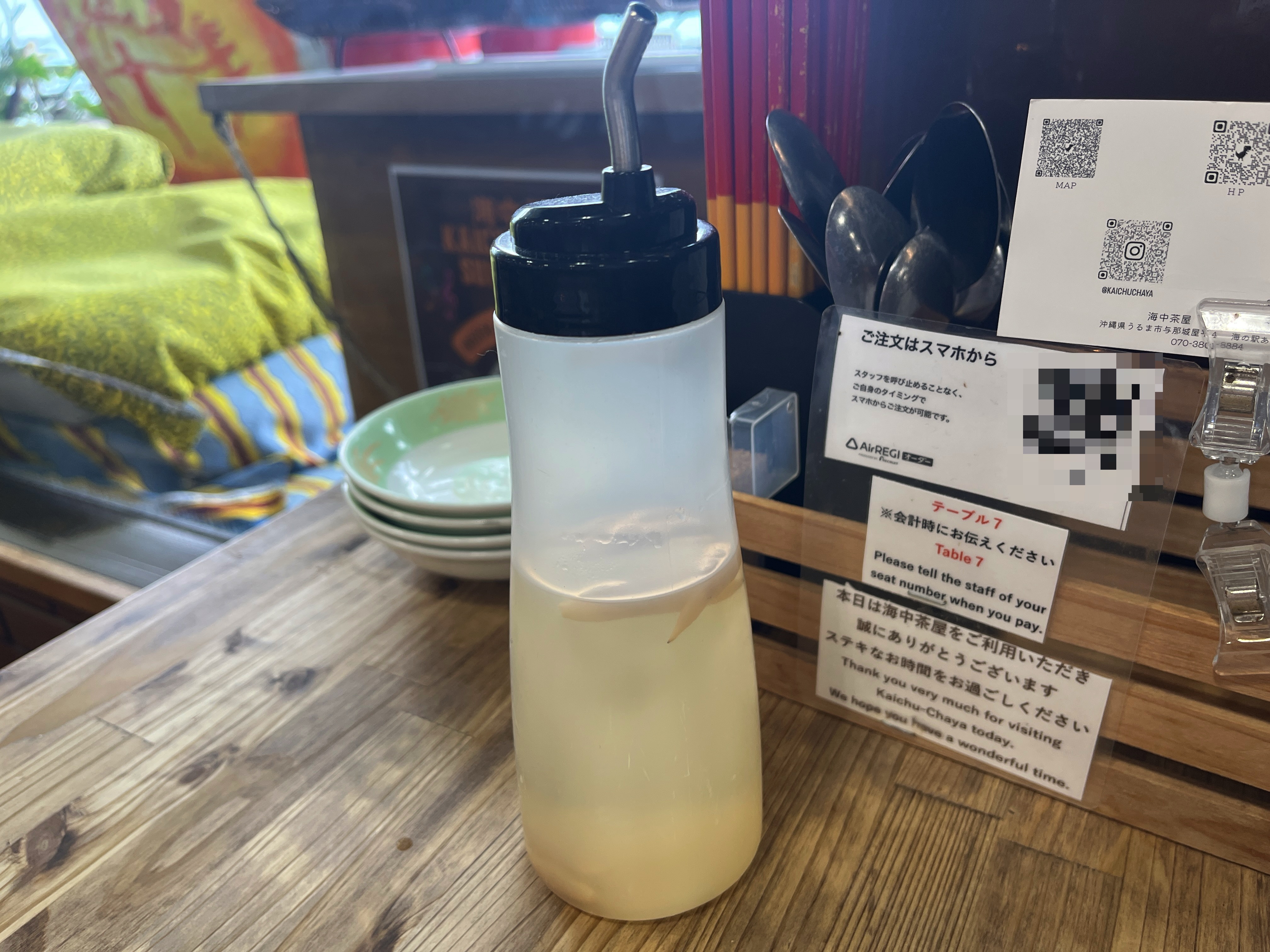 味変はコーレーグースのみですね。コレは自家製なのかな?そういえば、セルフ水の横に、紅しょうがが、あったなぁ。