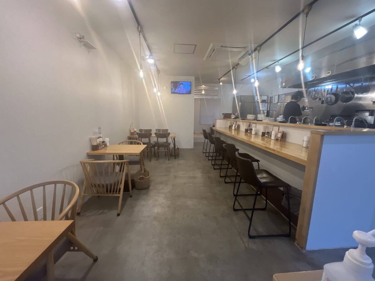 白を基調として、清潔感ある店内。そして、木目調の椅子とテーブル。この彩りは映えるよね。オサレな飲食店でよくみる配色です。