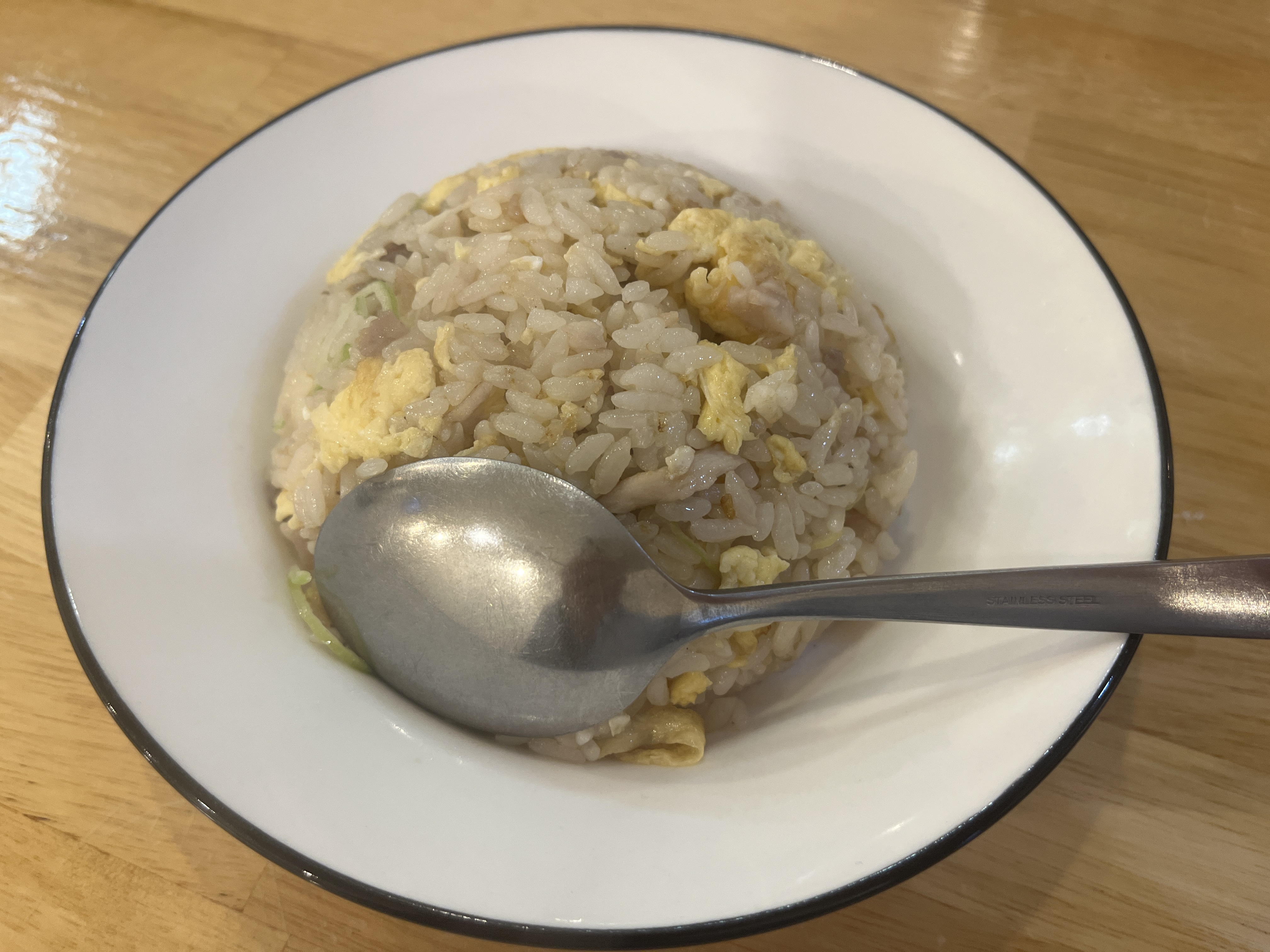 メニューに「リピート率No.1」って書いてました!口コミでも高評価です!ラーメンのお供にミニ炒飯!アリですね。お値段もお手頃だし。餃子(5個)と値段が一緒なら、ガッツリ食べたい時は、ミニ炒飯の方が満腹感あるしね!味付けは、あっさり。そしてパラパラで食べやすい。コレはパンチは弱いけど、だんだんクセになるタイプかと。ついつい毎回頼んじゃう系です。