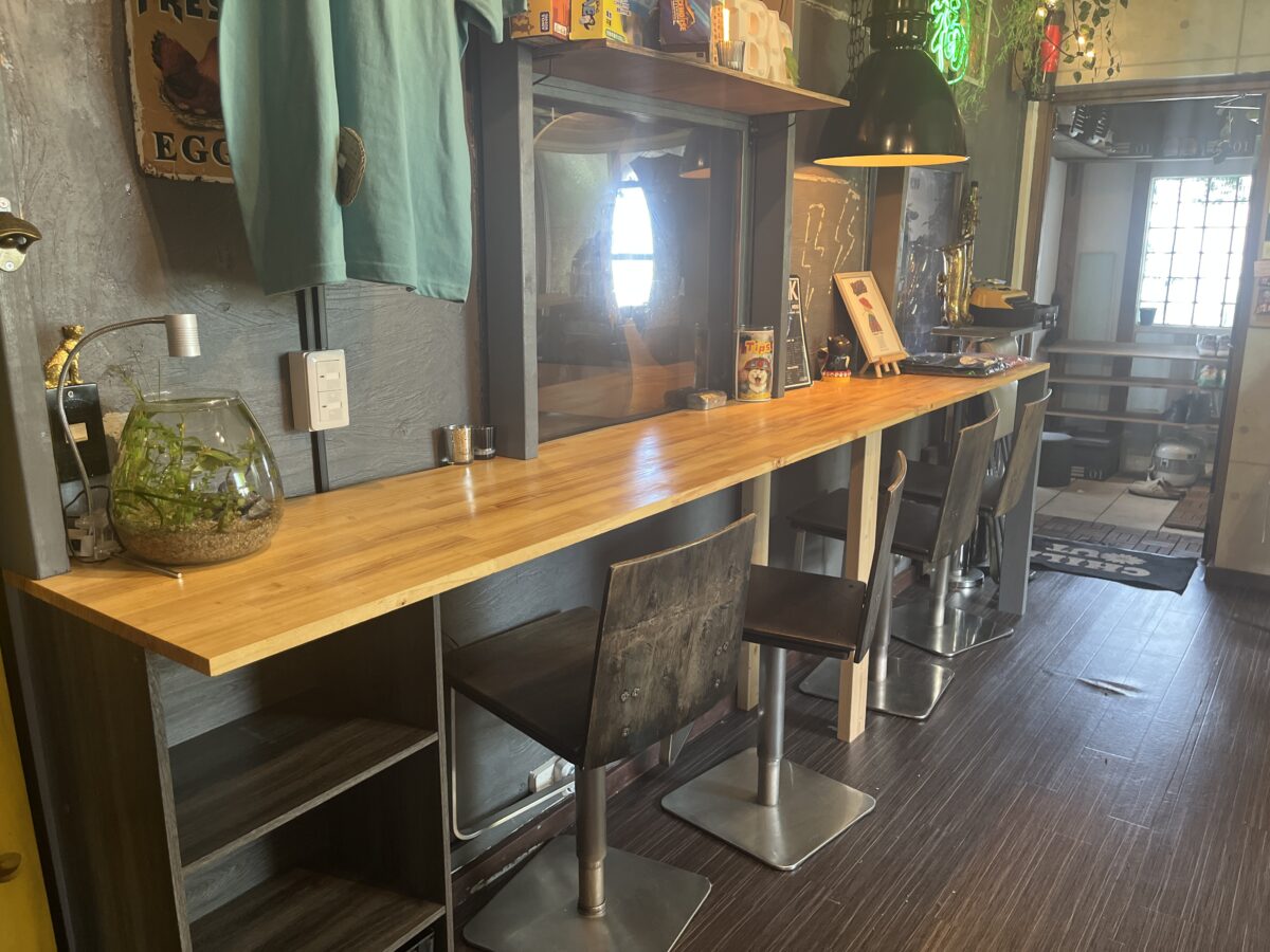 L字型の店内で、入口付近が二名用テーブルとカウンター席になってます。
